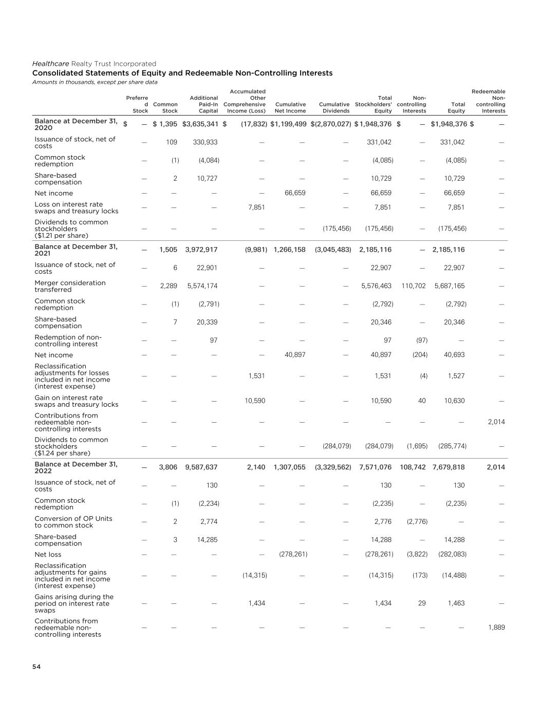 Healthcare Realty Trust Incorporated Consolidated Statements of Equity and Redeemable Non-Controlling Interests Amounts in thousands, except per share data Preferre d Stock Common Stock Additional Paid-In Capital Accumulated Other Comprehensive Income (Loss) Cumulative Net Income Cumulative Dividends Total Stockholders’ Equity Non- controlling Interests Total Equity Redeemable Non- controlling Interests Balance at December 31, 2020 $ — $ 1,395 $ 3,635,341 $ (17,832) $ 1,199,499 $ (2,870,027) $ 1,948,376 $ — $ 1,948,376 $ — Issuance of stock, net of costs — 109 330,933 — — — 331,042 — 331,042 — Common stock redemption — (1) (4,084) — — — (4,085) — (4,085) — Share-based compensation — 2 10,727 — — — 10,729 — 10,729 — Net income — — — — 66,659 — 66,659 — 66,659 — Loss on interest rate swaps and treasury locks — — — 7,851 — — 7,851 — 7,851 — Dividends to common stockholders ($1.21 per share) — — — — — (175,456) (175,456) — (175,456) — Balance at December 31, 2021 — 1,505 3,972,917 (9,981) 1,266,158 (3,045,483) 2,185,116 — 2,185,116 — Issuance of stock, net of costs — 6 22,901 — — — 22,907 — 22,907 — Merger consideration transferred — 2,289 5,574,174 — — — 5,576,463 110,702 5,687,165 — Common stock redemption — (1) (2,791) — — — (2,792) — (2,792) — Share-based compensation — 7 20,339 — — — 20,346 — 20,346 — Redemption of non- controlling interest — — 97 — — — 97 (97) — — Net income — — — — 40,897 — 40,897 (204) 40,693 — Reclassification adjustments for losses included in net income (interest expense) — — — 1,531 — — 1,531 (4) 1,527 — Gain on interest rate swaps and treasury locks — — — 10,590 — — 10,590 40 10,630 — Contributions from redeemable non- controlling interests — — — — — — — — — 2,014 Dividends to common stockholders ($1.24 per share) — — — — — (284,079) (284,079) (1,695) (285,774) — Balance at December 31, 2022 — 3,806 9,587,637 2,140 1,307,055 (3,329,562) 7,571,076 108,742 7,679,818 2,014 Issuance of stock, net of costs — — 130 — — — 130 — 130 — Common stock redemption — (1) (2,234) — — — (2,235) — (2,235) — Conversion of OP Units to common stock — 2 2,774 — — — 2,776 (2,776) — — Share-based compensation — 3 14,285 — — — 14,288 — 14,288 — Net loss — — — — (278,261) — (278,261) (3,822) (282,083) — Reclassification adjustments for gains included in net income (interest expense) — — — (14,315) — — (14,315) (173) (14,488) — Gains arising during the period on interest rate swaps — — — 1,434 — — 1,434 29 1,463 — Contributions from redeemable non- controlling interests — — — — — — — — — 1,889 54