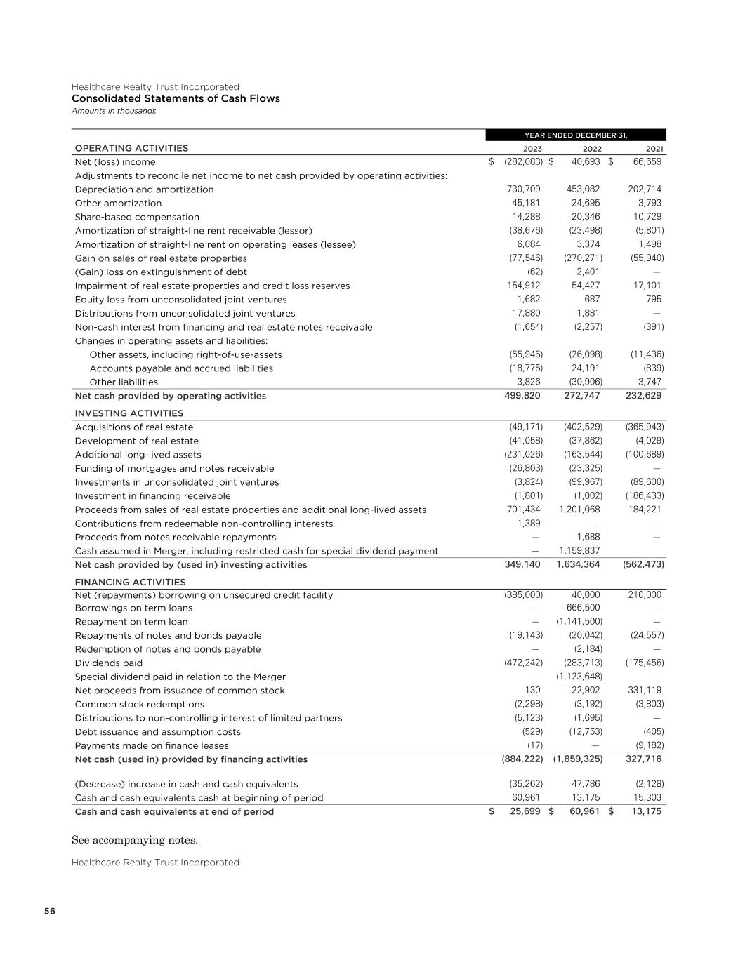Healthcare Realty Trust Incorporated Consolidated Statements of Cash Flows Amounts in thousands YEAR ENDED DECEMBER 31, OPERATING ACTIVITIES 2023 2022 2021 Net (loss) income $ (282,083) $ 40,693 $ 66,659 Adjustments to reconcile net income to net cash provided by operating activities: Depreciation and amortization 730,709 453,082 202,714 Other amortization 45,181 24,695 3,793 Share-based compensation 14,288 20,346 10,729 Amortization of straight-line rent receivable (lessor) (38,676) (23,498) (5,801) Amortization of straight-line rent on operating leases (lessee) 6,084 3,374 1,498 Gain on sales of real estate properties (77,546) (270,271) (55,940) (Gain) loss on extinguishment of debt (62) 2,401 — Impairment of real estate properties and credit loss reserves 154,912 54,427 17,101 Equity loss from unconsolidated joint ventures 1,682 687 795 Distributions from unconsolidated joint ventures 17,880 1,881 — Non-cash interest from financing and real estate notes receivable (1,654) (2,257) (391) Changes in operating assets and liabilities: Other assets, including right-of-use-assets (55,946) (26,098) (11,436) Accounts payable and accrued liabilities (18,775) 24,191 (839) Other liabilities 3,826 (30,906) 3,747 Net cash provided by operating activities 499,820 272,747 232,629 INVESTING ACTIVITIES Acquisitions of real estate (49,171) (402,529) (365,943) Development of real estate (41,058) (37,862) (4,029) Additional long-lived assets (231,026) (163,544) (100,689) Funding of mortgages and notes receivable (26,803) (23,325) — Investments in unconsolidated joint ventures (3,824) (99,967) (89,600) Investment in financing receivable (1,801) (1,002) (186,433) Proceeds from sales of real estate properties and additional long-lived assets 701,434 1,201,068 184,221 Contributions from redeemable non-controlling interests 1,389 — — Proceeds from notes receivable repayments — 1,688 — Cash assumed in Merger, including restricted cash for special dividend payment — 1,159,837 Net cash provided by (used in) investing activities 349,140 1,634,364 (562,473) FINANCING ACTIVITIES Net (repayments) borrowing on unsecured credit facility (385,000) 40,000 210,000 Borrowings on term loans — 666,500 — Repayment on term loan — (1,141,500) — Repayments of notes and bonds payable (19,143) (20,042) (24,557) Redemption of notes and bonds payable — (2,184) — Dividends paid (472,242) (283,713) (175,456) Special dividend paid in relation to the Merger — (1,123,648) — Net proceeds from issuance of common stock 130 22,902 331,119 Common stock redemptions (2,298) (3,192) (3,803) Distributions to non-controlling interest of limited partners (5,123) (1,695) — Debt issuance and assumption costs (529) (12,753) (405) Payments made on finance leases (17) — (9,182) Net cash (used in) provided by financing activities (884,222) (1,859,325) 327,716 (Decrease) increase in cash and cash equivalents (35,262) 47,786 (2,128) Cash and cash equivalents cash at beginning of period 60,961 13,175 15,303 Cash and cash equivalents at end of period $ 25,699 $ 60,961 $ 13,175 See accompanying notes. Healthcare Realty Trust Incorporated 56