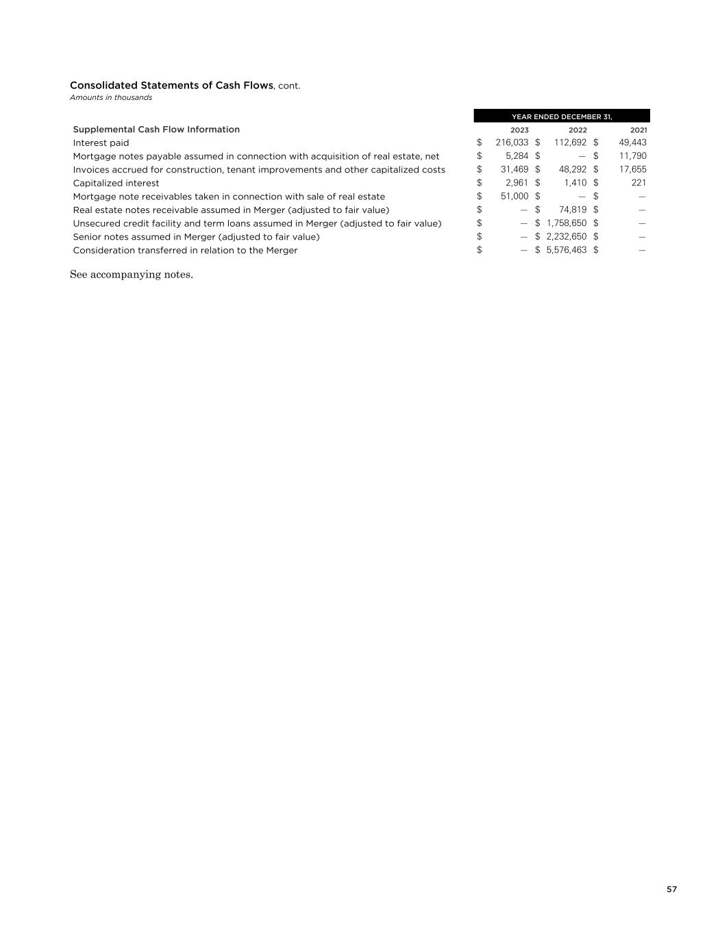 Consolidated Statements of Cash Flows, cont. Amounts in thousands YEAR ENDED DECEMBER 31, Supplemental Cash Flow Information 2023 2022 2021 Interest paid $ 216,033 $ 112,692 $ 49,443 Mortgage notes payable assumed in connection with acquisition of real estate, net $ 5,284 $ — $ 11,790 Invoices accrued for construction, tenant improvements and other capitalized costs $ 31,469 $ 48,292 $ 17,655 Capitalized interest $ 2,961 $ 1,410 $ 221 Mortgage note receivables taken in connection with sale of real estate $ 51,000 $ — $ — Real estate notes receivable assumed in Merger (adjusted to fair value) $ — $ 74,819 $ — Unsecured credit facility and term loans assumed in Merger (adjusted to fair value) $ — $ 1,758,650 $ — Senior notes assumed in Merger (adjusted to fair value) $ — $ 2,232,650 $ — Consideration transferred in relation to the Merger $ — $ 5,576,463 $ — See accompanying notes. 57