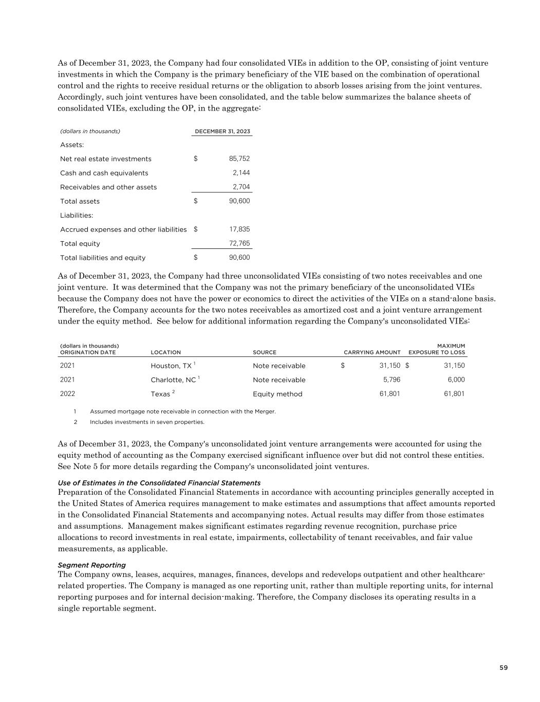 1. Summary of Significant Accounting Policies Business Overview Healthcare Realty Trust Incorporated is a real estate investment trust ("REIT") that owns, leases, manages, acquires, finances, develops and redevelops income-producing real estate properties associated primarily with the delivery of outpatient healthcare services throughout the United States of America. Except as otherwise provided in the Notes to the Company’s Consolidated Financial Statements, references herein to the "Company" mean Healthcare Realty Trust Incorporated and its consolidated subsidiaries, including Healthcare Realty Holdings, L.P. (formerly known as Healthcare Trust of America Holdings, LP) (the "OP"), after giving effect to the Merger discussed in more detail in Note 2 below. As of December 31, 2023, the Company had gross investments of approximately $13.4 billion in 655 consolidated real estate properties, construction in progress, redevelopments, financing receivables, financing lease right-of-use assets, land held for development, corporate property and excluding held for sale assets. The Company’s real estate properties are located in 35 states and total approximately 38.5 million square feet. In addition, the Company had a weighted average ownership interest of approximately 43% in 33 real estate properties held in unconsolidated joint ventures. See Note 5 below for more details regarding the Company's joint ventures. Square footage and property count disclosures in these Notes to the Company's Consolidated Financial Statements are unaudited. Principles of Consolidation The Company’s Consolidated Financial Statements include the accounts of the Company, its wholly owned subsidiaries, and joint ventures and partnerships where the Company controls the operating activities. GAAP requires the Company to identify entities for which control is achieved through means other than voting rights and to determine which business enterprise is the primary beneficiary of variable interest entities (“VIEs”). ASC Topic 810 broadly defines a VIE as an entity in which either (i) the equity investors as a group, if any, lack the power through voting or similar rights to direct the activities of such entity that most significantly impact such entity’s economic performance or (ii) the equity investment at risk is insufficient to finance that entity’s activities without additional subordinated financial support. The Company identifies the primary beneficiary of a VIE as the enterprise that has both of the following characteristics: (i) the power to direct the activities of the VIE that most significantly impact the entity’s economic performance and (ii) the obligation to absorb losses or receive benefits of the VIE that could potentially be significant to the entity. The Company consolidates its investment in a VIE when it determines that it is the VIE’s primary beneficiary, with any minority interests reflected as non-controlling interests or redeemable non- controlling interests in the accompanying Consolidated Financial Statements. The Company may change its original assessment of a VIE upon subsequent events such as the modification of contractual arrangements that affect the characteristics or adequacy of the entity’s equity investments at risk, the disposition of all or a portion of an interest held by the primary beneficiary, or changes in facts and circumstances that impact the power to direct activities of the VIE that most significantly impacts economic performance. The Company performs this analysis on an ongoing basis. For property holding entities not determined to be VIEs, the Company consolidates such entities in which it owns 100% of the equity or has a controlling financial interest evidenced by ownership of a majority voting interest. All intercompany balances and transactions are eliminated in consolidation. For entities in which the Company owns less than 100% of the equity interest, the Company consolidates the entity if it has the direct or indirect ability to control the entities’ activities based upon the terms of the respective entities’ ownership agreements. The OP is 98.8% owned by the Company. Holders of operating partnership units (“OP Units”) are considered to be non-controlling interest holders in the OP and their ownership interests are reflected as equity on the accompanying Consolidated Balance Sheets. Further, a portion of the earnings and losses of the OP are allocated to non-controlling interest holders based on their respective ownership percentages. Upon conversion of OP Units to common stock, any difference between the fair value of the common stock issued and the carrying value of the OP Units converted to common stock is recorded as a component of equity. As of December 31, 2023, there were approximately 4.5 million, or 1.2%, of OP Units issued and outstanding held by non-controlling interest holders. Additionally, the Company is the primary beneficiary of this VIE. Accordingly, the Company consolidates its interests in the OP. As of December 31, 2023, the Company had four consolidated VIEs in addition to the OP, consisting of joint venture investments in which the Company is the primary beneficiary of the VIE based on the combination of operational control and the rights to receive residual returns or the obligation to absorb losses arising from the joint ventures. Accordingly, such joint ventures have been consolidated, and the table below summarizes the balance sheets of consolidated VIEs, excluding the OP, in the aggregate: (dollars in thousands) DECEMBER 31, 2023 Assets: Net real estate investments $ 85,752 Cash and cash equivalents 2,144 Receivables and other assets 2,704 Total assets $ 90,600 Liabilities: Accrued expenses and other liabilities $ 17,835 Total equity 72,765 Total liabilities and equity $ 90,600 As of December 31, 2023, the Company had three unconsolidated VIEs consisting of two notes receivables and one joint venture. It was determin