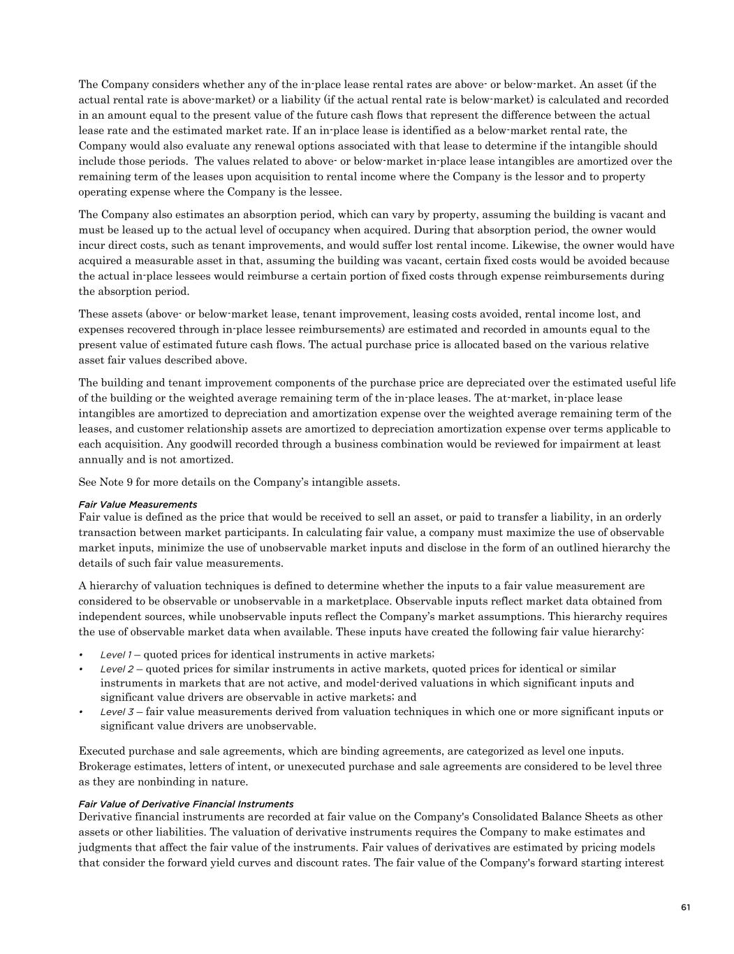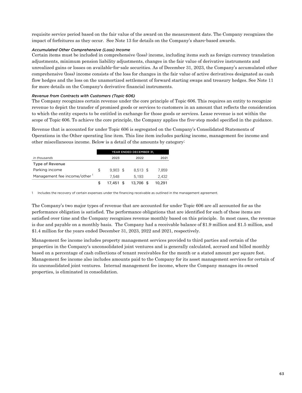 rate swap contracts are estimated by pricing models that consider foreign trade rates and discount rates. Such amounts and the recognition of such amounts are subject to significant estimates that may change in the future. For derivatives designated in qualifying cash flow hedging relationships, the change in fair value of the effective portion of the derivatives is recognized in accumulated other comprehensive income (loss). Gains and losses are reclassified from accumulated other comprehensive income (loss) into earnings once the underlying hedged transaction is recognized in earnings. As of December 31, 2023 and 2022, the Company had $10.7 million recorded in accumulated other comprehensive loss and $2.1 million recorded in accumulated other comprehensive (loss) income, respectively, related to forward starting interest rate swaps entered into and settled during 2015 and 2020 and a hedge of the Company's variable rate debt. See Note 11 for additional information. Cash, Cash Equivalents and Restricted Cash Cash and cash equivalents includes short-term investments with original maturities of three months or less when purchased. Restricted cash includes cash held in escrow in connection with proceeds from the sales of certain real estate properties. The Company did not have any restricted cash for the years ended December 31, 2023 or 2022. Cash and cash equivalents are held in bank accounts and overnight investments. The Company maintains its bank deposits with large financial institutions in amounts that often exceed federally-insured limits. The Company has not experienced any losses in such accounts. Goodwill and Other Intangible Assets Goodwill and intangible assets with indefinite lives are not amortized, but are tested at least annually for impairment. Intangible assets with finite lives are amortized over their respective lives to their estimated residual values and are reviewed for impairment only when impairment indicators are present. Identifiable intangible assets of the Company are comprised of enterprise goodwill, in-place lease intangible assets, customer relationship intangible assets, and debt issuance costs. In-place lease and customer relationship intangible assets are amortized on a straight-line basis over the applicable lives of the assets. Debt issuance costs are amortized over the term of the debt instrument on the effective interest method or the straight-line method when the effective interest method is not applicable. Goodwill is not amortized but is evaluated annually as of December 31 for impairment. The Company's goodwill asset increased $27.3 million to $250.5 million in 2023 compared to $223.2 million in 2022, as a result of the final purchase price allocation adjustments related to the Merger. The 2023 impairment evaluation indicated that no impairment had occurred with respect to the Company's goodwill asset. See Note 9 for more detail on the Company’s intangible assets. Contingent Liabilities From time to time, the Company may be subject to loss contingencies arising from legal proceedings and similar matters. Additionally, while the Company maintains comprehensive liability and property insurance with respect to each of its properties, the Company may be exposed to unforeseen losses related to uninsured or underinsured damages. The Company continually monitors any matters that may present a contingent liability, and, on a quarterly basis, management reviews the Company’s reserves and accruals in relation to each of them, adjusting provisions as necessary in view of changes in available information. Liabilities for contingencies are first recorded when a loss is determined to be both probable and can be reasonably estimated. Changes in estimates regarding the exposure to a contingent loss are reflected as adjustments to the related liability in the periods when they occur. Because of uncertainties inherent in the estimation of contingent liabilities, it is possible that the Company’s provision for contingent losses could change materially in the near term. To the extent that any significant losses, in addition to amounts recognized, are at least reasonably possible, such amounts will be disclosed in the notes to the Consolidated Financial Statements. Share-Based Compensation The Company has various employee and director share-based awards outstanding. These awards include non-vested common stock or other stock-based awards, including units in the OP, pursuant to the Company's Amended and Restated 2006 Incentive Plan, dated April 29, 2021 ("the Incentive Plan"). The Company recognizes share-based payments to employees and directors in the Consolidated Statements of Operations on a straight-line basis over the requisite service period based on the fair value of the award on the measurement date. The Company recognizes the impact of forfeitures as they occur. See Note 13 for details on the Company’s share-based awards. Accumulated Other Comprehensive (Loss) Income Certain items must be included in comprehensive (loss) income, including items such as foreign currency translation adjustments, minimum pension liability adjustments, changes in the fair value of derivative instruments and unrealized gains or losses on available-for-sale securities. As of December 31, 2023, the Company’s accumulated other comprehensive (loss) income consists of the loss for changes in the fair value of active derivatives designated as cash flow hedges and the loss on the unamortized settlement of forward starting swaps and treasury hedges. See Note 11 for more details on the Company's derivative financial instruments. Revenue from Contracts with Customers (Topic 606) The Company recognizes certain revenue under the core principle of Topic 606. This requires an entity to recognize revenue to depict the transfer of promised goods or services to customers in an amount that reflects the consideration to which the entity expects to be entitled in exchange for those goods or 