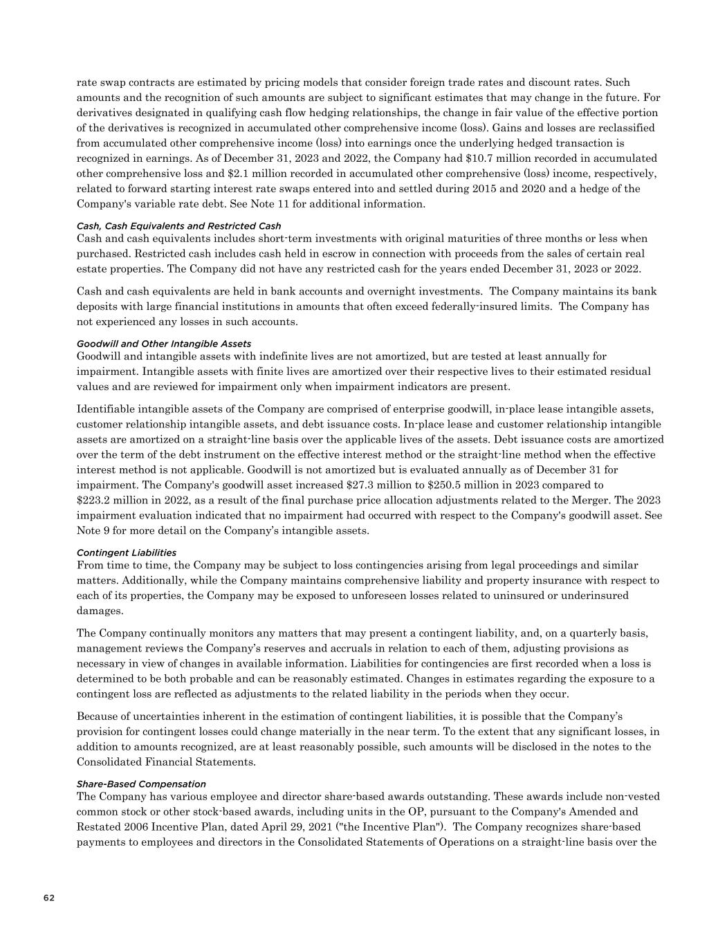 rate swap contracts are estimated by pricing models that consider foreign trade rates and discount rates. Such amounts and the recognition of such amounts are subject to significant estimates that may change in the future. For derivatives designated in qualifying cash flow hedging relationships, the change in fair value of the effective portion of the derivatives is recognized in accumulated other comprehensive income (loss). Gains and losses are reclassified from accumulated other comprehensive income (loss) into earnings once the underlying hedged transaction is recognized in earnings. As of December 31, 2023 and 2022, the Company had $10.7 million recorded in accumulated other comprehensive loss and $2.1 million recorded in accumulated other comprehensive (loss) income, respectively, related to forward starting interest rate swaps entered into and settled during 2015 and 2020 and a hedge of the Company's variable rate debt. See Note 11 for additional information. Cash, Cash Equivalents and Restricted Cash Cash and cash equivalents includes short-term investments with original maturities of three months or less when purchased. Restricted cash includes cash held in escrow in connection with proceeds from the sales of certain real estate properties. The Company did not have any restricted cash for the years ended December 31, 2023 or 2022. Cash and cash equivalents are held in bank accounts and overnight investments. The Company maintains its bank deposits with large financial institutions in amounts that often exceed federally-insured limits. The Company has not experienced any losses in such accounts. Goodwill and Other Intangible Assets Goodwill and intangible assets with indefinite lives are not amortized, but are tested at least annually for impairment. Intangible assets with finite lives are amortized over their respective lives to their estimated residual values and are reviewed for impairment only when impairment indicators are present. Identifiable intangible assets of the Company are comprised of enterprise goodwill, in-place lease intangible assets, customer relationship intangible assets, and debt issuance costs. In-place lease and customer relationship intangible assets are amortized on a straight-line basis over the applicable lives of the assets. Debt issuance costs are amortized over the term of the debt instrument on the effective interest method or the straight-line method when the effective interest method is not applicable. Goodwill is not amortized but is evaluated annually as of December 31 for impairment. The Company's goodwill asset increased $27.3 million to $250.5 million in 2023 compared to $223.2 million in 2022, as a result of the final purchase price allocation adjustments related to the Merger. The 2023 impairment evaluation indicated that no impairment had occurred with respect to the Company's goodwill asset. See Note 9 for more detail on the Company’s intangible assets. Contingent Liabilities From time to time, the Company may be subject to loss contingencies arising from legal proceedings and similar matters. Additionally, while the Company maintains comprehensive liability and property insurance with respect to each of its properties, the Company may be exposed to unforeseen losses related to uninsured or underinsured damages. The Company continually monitors any matters that may present a contingent liability, and, on a quarterly basis, management reviews the Company’s reserves and accruals in relation to each of them, adjusting provisions as necessary in view of changes in available information. Liabilities for contingencies are first recorded when a loss is determined to be both probable and can be reasonably estimated. Changes in estimates regarding the exposure to a contingent loss are reflected as adjustments to the related liability in the periods when they occur. Because of uncertainties inherent in the estimation of contingent liabilities, it is possible that the Company’s provision for contingent losses could change materially in the near term. To the extent that any significant losses, in addition to amounts recognized, are at least reasonably possible, such amounts will be disclosed in the notes to the Consolidated Financial Statements. Share-Based Compensation The Company has various employee and director share-based awards outstanding. These awards include non-vested common stock or other stock-based awards, including units in the OP, pursuant to the Company's Amended and Restated 2006 Incentive Plan, dated April 29, 2021 ("the Incentive Plan"). The Company recognizes share-based payments to employees and directors in the Consolidated Statements of Operations on a straight-line basis over the 62