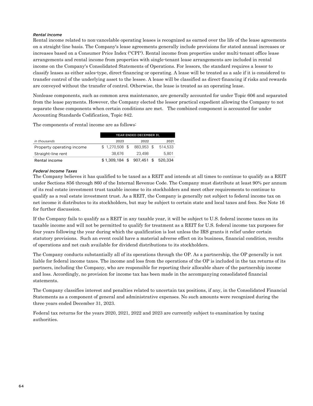 Rental Income Rental income related to non-cancelable operating leases is recognized as earned over the life of the lease agreements on a straight-line basis. The Company's lease agreements generally include provisions for stated annual increases or increases based on a Consumer Price Index ("CPI"). Rental income from properties under multi-tenant office lease arrangements and rental income from properties with single-tenant lease arrangements are included in rental income on the Company's Consolidated Statements of Operations. For lessors, the standard requires a lessor to classify leases as either sales-type, direct-financing or operating. A lease will be treated as a sale if it is considered to transfer control of the underlying asset to the lessee. A lease will be classified as direct-financing if risks and rewards are conveyed without the transfer of control. Otherwise, the lease is treated as an operating lease. Nonlease components, such as common area maintenance, are generally accounted for under Topic 606 and separated from the lease payments. However, the Company elected the lessor practical expedient allowing the Company to not separate these components when certain conditions are met. The combined component is accounted for under Accounting Standards Codification, Topic 842. The components of rental income are as follows: YEAR ENDED DECEMBER 31, in thousands 2023 2022 2021 Property operating income $ 1,270,508 $ 883,953 $ 514,533 Straight-line rent 38,676 23,498 5,801 Rental income $ 1,309,184 $ 907,451 $ 520,334 Federal Income Taxes The Company believes it has qualified to be taxed as a REIT and intends at all times to continue to qualify as a REIT under Sections 856 through 860 of the Internal Revenue Code. The Company must distribute at least 90% per annum of its real estate investment trust taxable income to its stockholders and meet other requirements to continue to qualify as a real estate investment trust. As a REIT, the Company is generally not subject to federal income tax on net income it distributes to its stockholders, but may be subject to certain state and local taxes and fees. See Note 16 for further discussion. If the Company fails to qualify as a REIT in any taxable year, it will be subject to U.S. federal income taxes on its taxable income and will not be permitted to qualify for treatment as a REIT for U.S. federal income tax purposes for four years following the year during which the qualification is lost unless the IRS grants it relief under certain statutory provisions. Such an event could have a material adverse effect on its business, financial condition, results of operations and net cash available for dividend distributions to its stockholders. The Company conducts substantially all of its operations through the OP. As a partnership, the OP generally is not liable for federal income taxes. The income and loss from the operations of the OP is included in the tax returns of its partners, including the Company, who are responsible for reporting their allocable share of the partnership income and loss. Accordingly, no provision for income tax has been made in the accompanying consolidated financial statements. The Company classifies interest and penalties related to uncertain tax positions, if any, in the Consolidated Financial Statements as a component of general and administrative expenses. No such amounts were recognized during the three years ended December 31, 2023. Federal tax returns for the years 2020, 2021, 2022 and 2023 are currently subject to examination by taxing authorities. 64