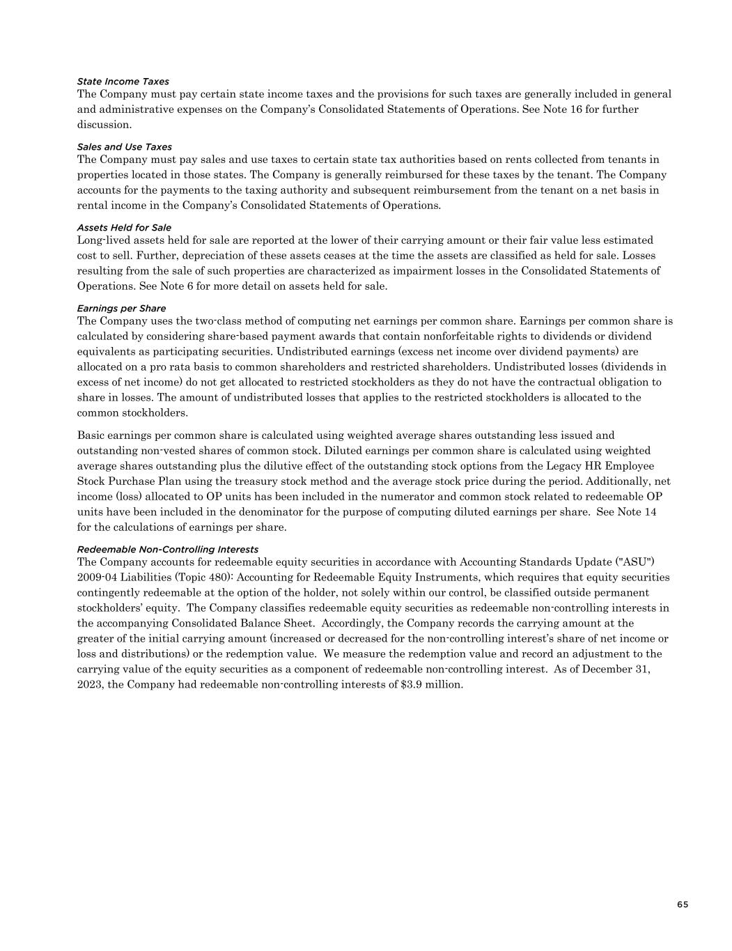 Rental Income Rental income related to non-cancelable operating leases is recognized as earned over the life of the lease agreements on a straight-line basis. The Company's lease agreements generally include provisions for stated annual increases or increases based on a Consumer Price Index ("CPI"). Rental income from properties under multi-tenant office lease arrangements and rental income from properties with single-tenant lease arrangements are included in rental income on the Company's Consolidated Statements of Operations. For lessors, the standard requires a lessor to classify leases as either sales-type, direct-financing or operating. A lease will be treated as a sale if it is considered to transfer control of the underlying asset to the lessee. A lease will be classified as direct-financing if risks and rewards are conveyed without the transfer of control. Otherwise, the lease is treated as an operating lease. Nonlease components, such as common area maintenance, are generally accounted for under Topic 606 and separated from the lease payments. However, the Company elected the lessor practical expedient allowing the Company to not separate these components when certain conditions are met. The combined component is accounted for under Accounting Standards Codification, Topic 842. The components of rental income are as follows: YEAR ENDED DECEMBER 31, in thousands 2023 2022 2021 Property operating income $ 1,270,508 $ 883,953 $ 514,533 Straight-line rent 38,676 23,498 5,801 Rental income $ 1,309,184 $ 907,451 $ 520,334 Federal Income Taxes The Company believes it has qualified to be taxed as a REIT and intends at all times to continue to qualify as a REIT under Sections 856 through 860 of the Internal Revenue Code. The Company must distribute at least 90% per annum of its real estate investment trust taxable income to its stockholders and meet other requirements to continue to qualify as a real estate investment trust. As a REIT, the Company is generally not subject to federal income tax on net income it distributes to its stockholders, but may be subject to certain state and local taxes and fees. See Note 16 for further discussion. If the Company fails to qualify as a REIT in any taxable year, it will be subject to U.S. federal income taxes on its taxable income and will not be permitted to qualify for treatment as a REIT for U.S. federal income tax purposes for four years following the year during which the qualification is lost unless the IRS grants it relief under certain statutory provisions. Such an event could have a material adverse effect on its business, financial condition, results of operations and net cash available for dividend distributions to its stockholders. The Company conducts substantially all of its operations through the OP. As a partnership, the OP generally is not liable for federal income taxes. The income and loss from the operations of the OP is included in the tax returns of its partners, including the Company, who are responsible for reporting their allocable share of the partnership income and loss. Accordingly, no provision for income tax has been made in the accompanying consolidated financial statements. The Company classifies interest and penalties related to uncertain tax positions, if any, in the Consolidated Financial Statements as a component of general and administrative expenses. No such amounts were recognized during the three years ended December 31, 2023. Federal tax returns for the years 2020, 2021, 2022 and 2023 are currently subject to examination by taxing authorities. State Income Taxes The Company must pay certain state income taxes and the provisions for such taxes are generally included in general and administrative expenses on the Company’s Consolidated Statements of Operations. See Note 16 for further discussion. Sales and Use Taxes The Company must pay sales and use taxes to certain state tax authorities based on rents collected from tenants in properties located in those states. The Company is generally reimbursed for these taxes by the tenant. The Company accounts for the payments to the taxing authority and subsequent reimbursement from the tenant on a net basis in rental income in the Company’s Consolidated Statements of Operations. Assets Held for Sale Long-lived assets held for sale are reported at the lower of their carrying amount or their fair value less estimated cost to sell. Further, depreciation of these assets ceases at the time the assets are classified as held for sale. Losses resulting from the sale of such properties are characterized as impairment losses in the Consolidated Statements of Operations. See Note 6 for more detail on assets held for sale. Earnings per Share The Company uses the two-class method of computing net earnings per common share. Earnings per common share is calculated by considering share-based payment awards that contain nonforfeitable rights to dividends or dividend equivalents as participating securities. Undistributed earnings (excess net income over dividend payments) are allocated on a pro rata basis to common shareholders and restricted shareholders. Undistributed losses (dividends in excess of net income) do not get allocated to restricted stockholders as they do not have the contractual obligation to share in losses. The amount of undistributed losses that applies to the restricted stockholders is allocated to the common stockholders. Basic earnings per common share is calculated using weighted average shares outstanding less issued and outstanding non-vested shares of common stock. Diluted earnings per common share is calculated using weighted average shares outstanding plus the dilutive effect of the outstanding stock options from the Legacy HR Employee Stock Purchase Plan using the treasury stock method and the average stock price during the period. Additionally, net income (loss) allocated to OP units has been included in the numerator and common stock related to redeemab