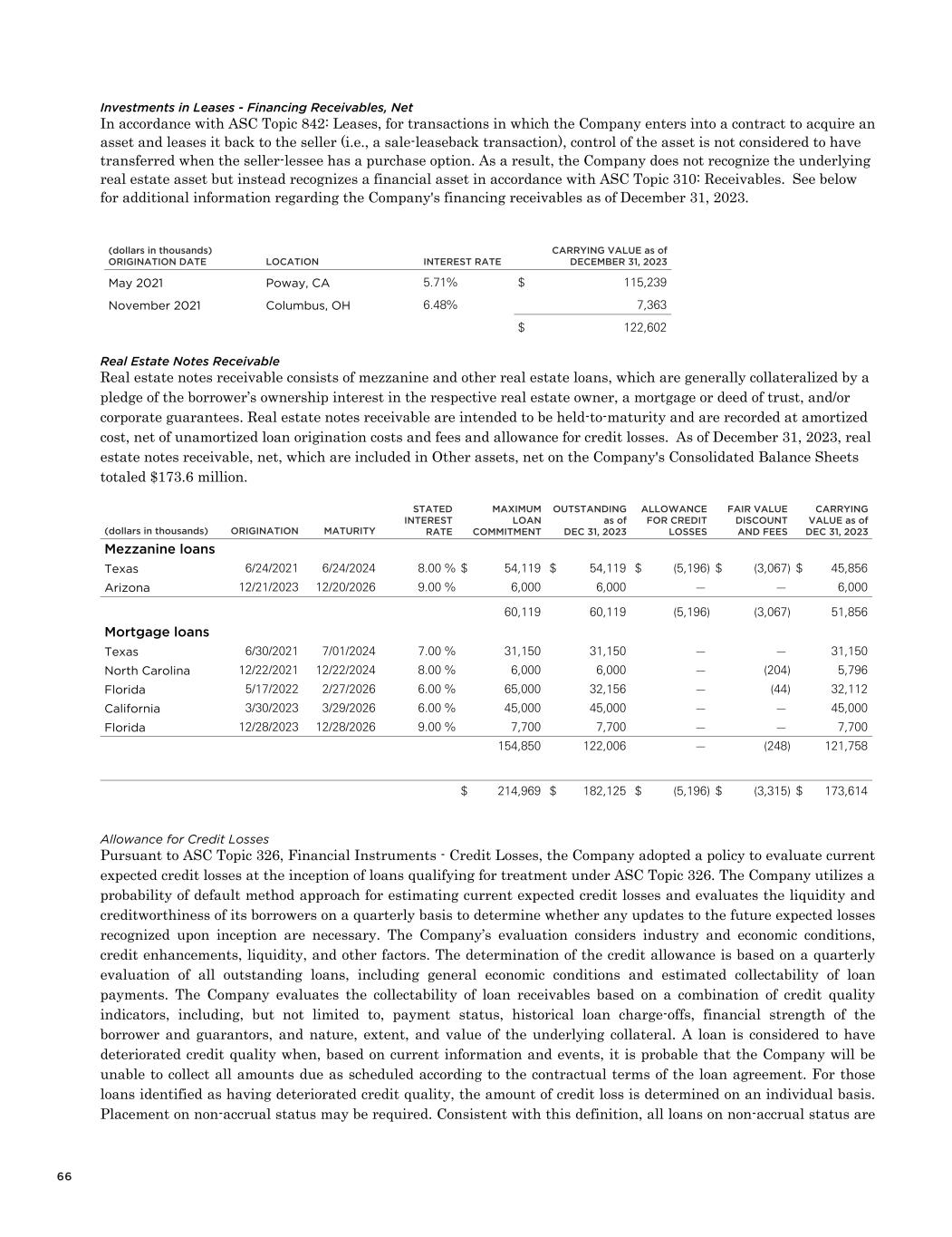 Investments in Leases - Financing Receivables, Net In accordance with ASC Topic 842: Leases, for transactions in which the Company enters into a contract to acquire an asset and leases it back to the seller (i.e., a sale-leaseback transaction), control of the asset is not considered to have transferred when the seller-lessee has a purchase option. As a result, the Company does not recognize the underlying real estate asset but instead recognizes a financial asset in accordance with ASC Topic 310: Receivables. See below for additional information regarding the Company's financing receivables as of December 31, 2023. (dollars in thousands) ORIGINATION DATE LOCATION INTEREST RATE CARRYING VALUE as of DECEMBER 31, 2023 May 2021 Poway, CA 5.71% $ 115,239 November 2021 Columbus, OH 6.48% 7,363 $ 122,602 Real Estate Notes Receivable Real estate notes receivable consists of mezzanine and other real estate loans, which are generally collateralized by a pledge of the borrower’s ownership interest in the respective real estate owner, a mortgage or deed of trust, and/or corporate guarantees. Real estate notes receivable are intended to be held-to-maturity and are recorded at amortized cost, net of unamortized loan origination costs and fees and allowance for credit losses. As of December 31, 2023, real estate notes receivable, net, which are included in Other assets, net on the Company's Consolidated Balance Sheets totaled $173.6 million. (dollars in thousands) ORIGINATION MATURITY STATED INTEREST RATE MAXIMUM LOAN COMMITMENT OUTSTANDING as of DEC 31, 2023 ALLOWANCE FOR CREDIT LOSSES FAIR VALUE DISCOUNT AND FEES CARRYING VALUE as of DEC 31, 2023 Mezzanine loans Texas 6/24/2021 6/24/2024 8.00 % $ 54,119 $ 54,119 $ (5,196) $ (3,067) $ 45,856 Arizona 12/21/2023 12/20/2026 9.00 % 6,000 6,000 — — 6,000 60,119 60,119 (5,196) (3,067) 51,856 Mortgage loans Texas 6/30/2021 7/01/2024 7.00 % 31,150 31,150 — — 31,150 North Carolina 12/22/2021 12/22/2024 8.00 % 6,000 6,000 — (204) 5,796 Florida 5/17/2022 2/27/2026 6.00 % 65,000 32,156 — (44) 32,112 California 3/30/2023 3/29/2026 6.00 % 45,000 45,000 — — 45,000 Florida 12/28/2023 12/28/2026 9.00 % 7,700 7,700 — — 7,700 154,850 122,006 — (248) 121,758 $ 214,969 $ 182,125 $ (5,196) $ (3,315) $ 173,614 Allowance for Credit Losses Pursuant to ASC Topic 326, Financial Instruments - Credit Losses, the Company adopted a policy to evaluate current expected credit losses at the inception of loans qualifying for treatment under ASC Topic 326. The Company utilizes a probability of default method approach for estimating current expected credit losses and evaluates the liquidity and creditworthiness of its borrowers on a quarterly basis to determine whether any updates to the future expected losses recognized upon inception are necessary. The Company’s evaluation considers industry and economic conditions, credit enhancements, liquidity, and other factors. The determination of the credit allowance is based on a quarterly evaluation of all outstanding loans, including general economic conditions and estimated collectability of loan payments. The Company evaluates the collectability of loan receivables based on a combination of credit quality indicators, including, but not limited to, payment status, historical loan charge-offs, financial strength of the borrower and guarantors, and nature, extent, and value of the underlying collateral. A loan is considered to have deteriorated credit quality when, based on current information and events, it is probable that the Company will be unable to collect all amounts due as scheduled according to the contractual terms of the loan agreement. For those loans identified as having deteriorated credit quality, the amount of credit loss is determined on an individual basis. Placement on non-accrual status may be required. Consistent with this definition, all loans on non-accrual status are 66