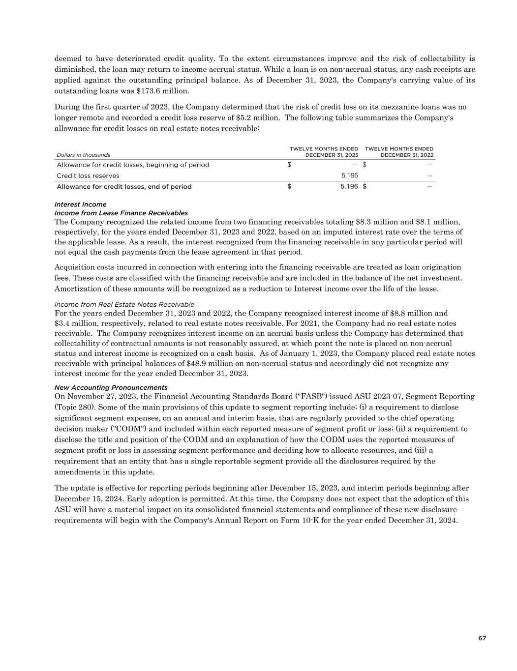 Investments in Leases - Financing Receivables, Net In accordance with ASC Topic 842: Leases, for transactions in which the Company enters into a contract to acquire an asset and leases it back to the seller (i.e., a sale-leaseback transaction), control of the asset is not considered to have transferred when the seller-lessee has a purchase option. As a result, the Company does not recognize the underlying real estate asset but instead recognizes a financial asset in accordance with ASC Topic 310: Receivables. See below for additional information regarding the Company's financing receivables as of December 31, 2023. (dollars in thousands) ORIGINATION DATE LOCATION INTEREST RATE CARRYING VALUE as of DECEMBER 31, 2023 May 2021 Poway, CA 5.71% $ 115,239 November 2021 Columbus, OH 6.48% 7,363 $ 122,602 Real Estate Notes Receivable Real estate notes receivable consists of mezzanine and other real estate loans, which are generally collateralized by a pledge of the borrower’s ownership interest in the respective real estate owner, a mortgage or deed of trust, and/or corporate guarantees. Real estate notes receivable are intended to be held-to-maturity and are recorded at amortized cost, net of unamortized loan origination costs and fees and allowance for credit losses. As of December 31, 2023, real estate notes receivable, net, which are included in Other assets, net on the Company's Consolidated Balance Sheets totaled $173.6 million. (dollars in thousands) ORIGINATION MATURITY STATED INTEREST RATE MAXIMUM LOAN COMMITMENT OUTSTANDING as of DEC 31, 2023 ALLOWANCE FOR CREDIT LOSSES FAIR VALUE DISCOUNT AND FEES CARRYING VALUE as of DEC 31, 2023 Mezzanine loans Texas 6/24/2021 6/24/2024 8.00 % $ 54,119 $ 54,119 $ (5,196) $ (3,067) $ 45,856 Arizona 12/21/2023 12/20/2026 9.00 % 6,000 6,000 — — 6,000 60,119 60,119 (5,196) (3,067) 51,856 Mortgage loans Texas 6/30/2021 7/01/2024 7.00 % 31,150 31,150 — — 31,150 North Carolina 12/22/2021 12/22/2024 8.00 % 6,000 6,000 — (204) 5,796 Florida 5/17/2022 2/27/2026 6.00 % 65,000 32,156 — (44) 32,112 California 3/30/2023 3/29/2026 6.00 % 45,000 45,000 — — 45,000 Florida 12/28/2023 12/28/2026 9.00 % 7,700 7,700 — — 7,700 154,850 122,006 — (248) 121,758 $ 214,969 $ 182,125 $ (5,196) $ (3,315) $ 173,614 Allowance for Credit Losses Pursuant to ASC Topic 326, Financial Instruments - Credit Losses, the Company adopted a policy to evaluate current expected credit losses at the inception of loans qualifying for treatment under ASC Topic 326. The Company utilizes a probability of default method approach for estimating current expected credit losses and evaluates the liquidity and creditworthiness of its borrowers on a quarterly basis to determine whether any updates to the future expected losses recognized upon inception are necessary. The Company’s evaluation considers industry and economic conditions, credit enhancements, liquidity, and other factors. The determination of the credit allowance is based on a quarterly evaluation of all outstanding loans, including general economic conditions and estimated collectability of loan payments. The Company evaluates the collectability of loan receivables based on a combination of credit quality indicators, including, but not limited to, payment status, historical loan charge-offs, financial strength of the borrower and guarantors, and nature, extent, and value of the underlying collateral. A loan is considered to have deteriorated credit quality when, based on current information and events, it is probable that the Company will be unable to collect all amounts due as scheduled according to the contractual terms of the loan agreement. For those loans identified as having deteriorated credit quality, the amount of credit loss is determined on an individual basis. Placement on non-accrual status may be required. Consistent with this definition, all loans on non-accrual status are deemed to have deteriorated credit quality. To the extent circumstances improve and the risk of collectability is diminished, the loan may return to income accrual status. While a loan is on non-accrual status, any cash receipts are applied against the outstanding principal balance. As of December 31, 2023, the Company's carrying value of its outstanding loans was $173.6 million. During the first quarter of 2023, the Company determined that the risk of credit loss on its mezzanine loans was no longer remote and recorded a credit loss reserve of $5.2 million. The following table summarizes the Company's allowance for credit losses on real estate notes receivable: Dollars in thousands TWELVE MONTHS ENDED DECEMBER 31, 2023 TWELVE MONTHS ENDED DECEMBER 31, 2022 Allowance for credit losses, beginning of period $ — $ — Credit loss reserves 5,196 — Allowance for credit losses, end of period $ 5,196 $ — Interest Income Income from Lease Finance Receivables The Company recognized the related income from two financing receivables totaling $8.3 million and $8.1 million, respectively, for the years ended December 31, 2023 and 2022, based on an imputed interest rate over the terms of the applicable lease. As a result, the interest recognized from the financing receivable in any particular period will not equal the cash payments from the lease agreement in that period. Acquisition costs incurred in connection with entering into the financing receivable are treated as loan origination fees. These costs are classified with the financing receivable and are included in the balance of the net investment. Amortization of these amounts will be recognized as a reduction to Interest income over the life of the lease. Income from Real Estate Notes Receivable For the years ended December 31, 2023 and 2022, the Company recognized interest income of $8.8 million and $3.4 million, respectively, related to real estate notes receivable. For 2021, the Company had no real estate notes receivable. The Company recognizes interest income on an accrual basis 