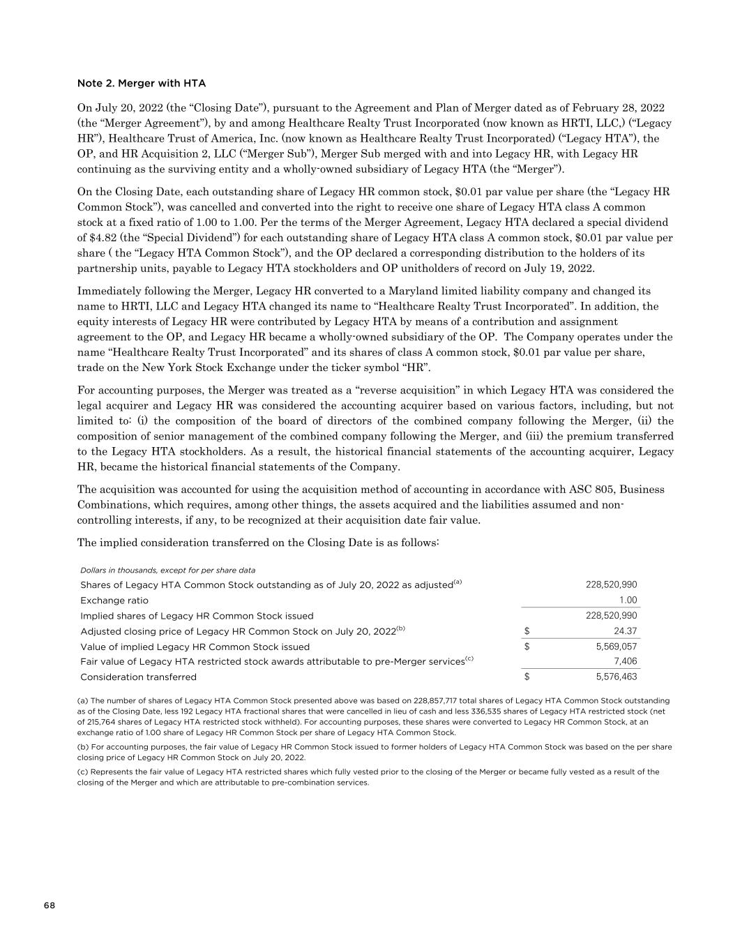 Note 2. Merger with HTA On July 20, 2022 (the “Closing Date”), pursuant to the Agreement and Plan of Merger dated as of February 28, 2022 (the “Merger Agreement”), by and among Healthcare Realty Trust Incorporated (now known as HRTI, LLC,) (“Legacy HR”), Healthcare Trust of America, Inc. (now known as Healthcare Realty Trust Incorporated) (“Legacy HTA”), the OP, and HR Acquisition 2, LLC (“Merger Sub”), Merger Sub merged with and into Legacy HR, with Legacy HR continuing as the surviving entity and a wholly-owned subsidiary of Legacy HTA (the “Merger”). On the Closing Date, each outstanding share of Legacy HR common stock, $0.01 par value per share (the “Legacy HR Common Stock”), was cancelled and converted into the right to receive one share of Legacy HTA class A common stock at a fixed ratio of 1.00 to 1.00. Per the terms of the Merger Agreement, Legacy HTA declared a special dividend of $4.82 (the “Special Dividend”) for each outstanding share of Legacy HTA class A common stock, $0.01 par value per share ( the “Legacy HTA Common Stock”), and the OP declared a corresponding distribution to the holders of its partnership units, payable to Legacy HTA stockholders and OP unitholders of record on July 19, 2022. Immediately following the Merger, Legacy HR converted to a Maryland limited liability company and changed its name to HRTI, LLC and Legacy HTA changed its name to “Healthcare Realty Trust Incorporated”. In addition, the equity interests of Legacy HR were contributed by Legacy HTA by means of a contribution and assignment agreement to the OP, and Legacy HR became a wholly-owned subsidiary of the OP. The Company operates under the name “Healthcare Realty Trust Incorporated” and its shares of class A common stock, $0.01 par value per share, trade on the New York Stock Exchange under the ticker symbol “HR”. For accounting purposes, the Merger was treated as a “reverse acquisition” in which Legacy HTA was considered the legal acquirer and Legacy HR was considered the accounting acquirer based on various factors, including, but not limited to: (i) the composition of the board of directors of the combined company following the Merger, (ii) the composition of senior management of the combined company following the Merger, and (iii) the premium transferred to the Legacy HTA stockholders. As a result, the historical financial statements of the accounting acquirer, Legacy HR, became the historical financial statements of the Company. The acquisition was accounted for using the acquisition method of accounting in accordance with ASC 805, Business Combinations, which requires, among other things, the assets acquired and the liabilities assumed and non- controlling interests, if any, to be recognized at their acquisition date fair value. The implied consideration transferred on the Closing Date is as follows: Fair value of Legacy HTA restricted stock awards attributable to pre-Merger services(c) 7,406 Consideration transferred $ 5,576,463 Dollars in thousands, except for per share data Shares of Legacy HTA Common Stock outstanding as of July 20, 2022 as adjusted(a) 228,520,990 Exchange ratio 1.00 Implied shares of Legacy HR Common Stock issued 228,520,990 Adjusted closing price of Legacy HR Common Stock on July 20, 2022(b) $ 24.37 Value of implied Legacy HR Common Stock issued $ 5,569,057 (a) The number of shares of Legacy HTA Common Stock presented above was based on 228,857,717 total shares of Legacy HTA Common Stock outstanding as of the Closing Date, less 192 Legacy HTA fractional shares that were cancelled in lieu of cash and less 336,535 shares of Legacy HTA restricted stock (net of 215,764 shares of Legacy HTA restricted stock withheld). For accounting purposes, these shares were converted to Legacy HR Common Stock, at an exchange ratio of 1.00 share of Legacy HR Common Stock per share of Legacy HTA Common Stock. (b) For accounting purposes, the fair value of Legacy HR Common Stock issued to former holders of Legacy HTA Common Stock was based on the per share closing price of Legacy HR Common Stock on July 20, 2022. (c) Represents the fair value of Legacy HTA restricted shares which fully vested prior to the closing of the Merger or became fully vested as a result of the closing of the Merger and which are attributable to pre-combination services. 68