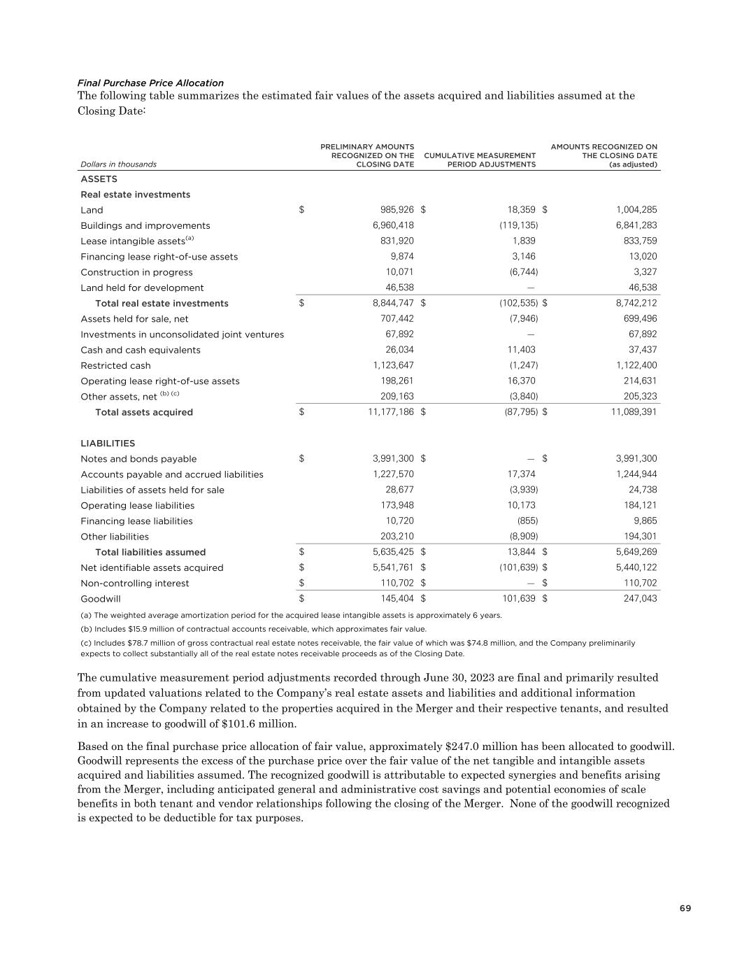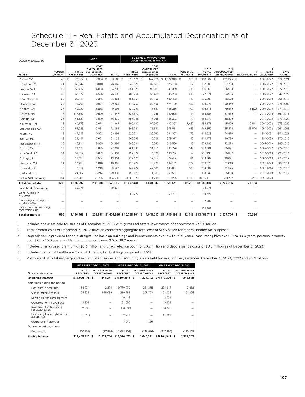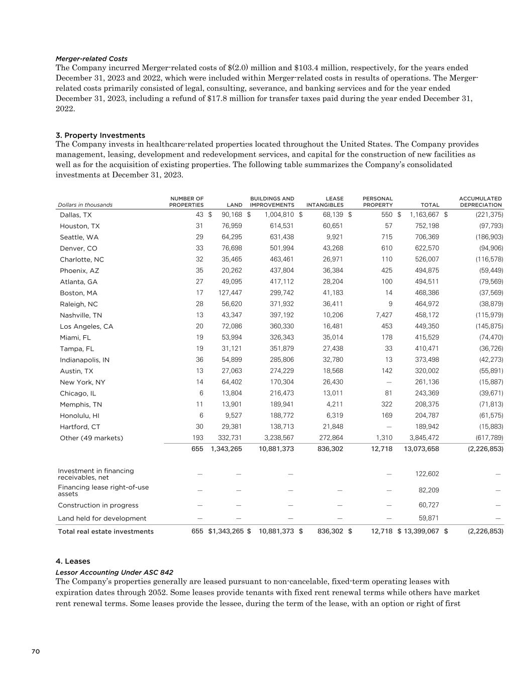 Merger-related Costs The Company incurred Merger-related costs of $(2.0) million and $103.4 million, respectively, for the years ended December 31, 2023 and 2022, which were included within Merger-related costs in results of operations. The Merger- related costs primarily consisted of legal, consulting, severance, and banking services and for the year ended December 31, 2023, including a refund of $17.8 million for transfer taxes paid during the year ended December 31, 2022. 3. Property Investments The Company invests in healthcare-related properties located throughout the United States. The Company provides management, leasing, development and redevelopment services, and capital for the construction of new facilities as well as for the acquisition of existing properties. The following table summarizes the Company’s consolidated investments at December 31, 2023. Dollars in thousands NUMBER OF PROPERTIES LAND BUILDINGS AND IMPROVEMENTS LEASE INTANGIBLES PERSONAL PROPERTY TOTAL ACCUMULATED DEPRECIATION Dallas, TX 43 $ 90,168 $ 1,004,810 $ 68,139 $ 550 $ 1,163,667 $ (221,375) Houston, TX 31 76,959 614,531 60,651 57 752,198 (97,793) Seattle, WA 29 64,295 631,438 9,921 715 706,369 (186,903) Denver, CO 33 76,698 501,994 43,268 610 622,570 (94,906) Charlotte, NC 32 35,465 463,461 26,971 110 526,007 (116,578) Phoenix, AZ 35 20,262 437,804 36,384 425 494,875 (59,449) Atlanta, GA 27 49,095 417,112 28,204 100 494,511 (79,569) Boston, MA 17 127,447 299,742 41,183 14 468,386 (37,569) Raleigh, NC 28 56,620 371,932 36,411 9 464,972 (38,879) Nashville, TN 13 43,347 397,192 10,206 7,427 458,172 (115,979) Los Angeles, CA 20 72,086 360,330 16,481 453 449,350 (145,875) Miami, FL 19 53,994 326,343 35,014 178 415,529 (74,470) Tampa, FL 19 31,121 351,879 27,438 33 410,471 (36,726) Indianapolis, IN 36 54,899 285,806 32,780 13 373,498 (42,273) Austin, TX 13 27,063 274,229 18,568 142 320,002 (55,891) New York, NY 14 64,402 170,304 26,430 — 261,136 (15,887) Chicago, IL 6 13,804 216,473 13,011 81 243,369 (39,671) Memphis, TN 11 13,901 189,941 4,211 322 208,375 (71,813) Honolulu, HI 6 9,527 188,772 6,319 169 204,787 (61,575) Hartford, CT 30 29,381 138,713 21,848 — 189,942 (15,883) Other (49 markets) 193 332,731 3,238,567 272,864 1,310 3,845,472 (617,789) 655 1,343,265 10,881,373 836,302 12,718 13,073,658 (2,226,853) Investment in financing receivables, net — — — — 122,602 — Financing lease right-of-use assets — — — — — 82,209 — Construction in progress — — — — — 60,727 — Land held for development — — — — — 59,871 — Total real estate investments 655 $ 1,343,265 $ 10,881,373 $ 836,302 $ 12,718 $ 13,399,067 $ (2,226,853) 4. Leases Lessor Accounting Under ASC 842 The Company’s properties generally are leased pursuant to non-cancelable, fixed-term operating leases with expiration dates through 2052. Some leases provide tenants with fixed rent renewal terms while others have market rent renewal terms. Some leases provide the lessee, during the term of the lease, with an option or right of first 70