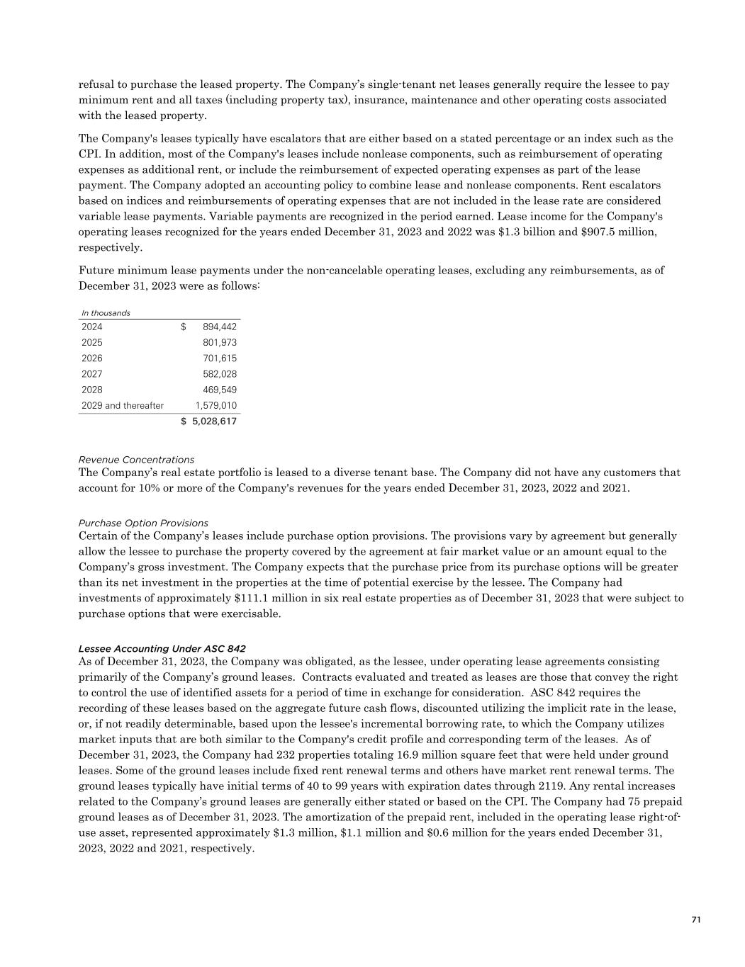 Merger-related Costs The Company incurred Merger-related costs of $(2.0) million and $103.4 million, respectively, for the years ended December 31, 2023 and 2022, which were included within Merger-related costs in results of operations. The Merger- related costs primarily consisted of legal, consulting, severance, and banking services and for the year ended December 31, 2023, including a refund of $17.8 million for transfer taxes paid during the year ended December 31, 2022. 3. Property Investments The Company invests in healthcare-related properties located throughout the United States. The Company provides management, leasing, development and redevelopment services, and capital for the construction of new facilities as well as for the acquisition of existing properties. The following table summarizes the Company’s consolidated investments at December 31, 2023. Dollars in thousands NUMBER OF PROPERTIES LAND BUILDINGS AND IMPROVEMENTS LEASE INTANGIBLES PERSONAL PROPERTY TOTAL ACCUMULATED DEPRECIATION Dallas, TX 43 $ 90,168 $ 1,004,810 $ 68,139 $ 550 $ 1,163,667 $ (221,375) Houston, TX 31 76,959 614,531 60,651 57 752,198 (97,793) Seattle, WA 29 64,295 631,438 9,921 715 706,369 (186,903) Denver, CO 33 76,698 501,994 43,268 610 622,570 (94,906) Charlotte, NC 32 35,465 463,461 26,971 110 526,007 (116,578) Phoenix, AZ 35 20,262 437,804 36,384 425 494,875 (59,449) Atlanta, GA 27 49,095 417,112 28,204 100 494,511 (79,569) Boston, MA 17 127,447 299,742 41,183 14 468,386 (37,569) Raleigh, NC 28 56,620 371,932 36,411 9 464,972 (38,879) Nashville, TN 13 43,347 397,192 10,206 7,427 458,172 (115,979) Los Angeles, CA 20 72,086 360,330 16,481 453 449,350 (145,875) Miami, FL 19 53,994 326,343 35,014 178 415,529 (74,470) Tampa, FL 19 31,121 351,879 27,438 33 410,471 (36,726) Indianapolis, IN 36 54,899 285,806 32,780 13 373,498 (42,273) Austin, TX 13 27,063 274,229 18,568 142 320,002 (55,891) New York, NY 14 64,402 170,304 26,430 — 261,136 (15,887) Chicago, IL 6 13,804 216,473 13,011 81 243,369 (39,671) Memphis, TN 11 13,901 189,941 4,211 322 208,375 (71,813) Honolulu, HI 6 9,527 188,772 6,319 169 204,787 (61,575) Hartford, CT 30 29,381 138,713 21,848 — 189,942 (15,883) Other (49 markets) 193 332,731 3,238,567 272,864 1,310 3,845,472 (617,789) 655 1,343,265 10,881,373 836,302 12,718 13,073,658 (2,226,853) Investment in financing receivables, net — — — — 122,602 — Financing lease right-of-use assets — — — — — 82,209 — Construction in progress — — — — — 60,727 — Land held for development — — — — — 59,871 — Total real estate investments 655 $ 1,343,265 $ 10,881,373 $ 836,302 $ 12,718 $ 13,399,067 $ (2,226,853) 4. Leases Lessor Accounting Under ASC 842 The Company’s properties generally are leased pursuant to non-cancelable, fixed-term operating leases with expiration dates through 2052. Some leases provide tenants with fixed rent renewal terms while others have market rent renewal terms. Some leases provide the lessee, during the term of the lease, with an option or right of first refusal to purchase the leased property. The Company’s single-tenant net leases generally require the lessee to pay minimum rent and all taxes (including property tax), insurance, maintenance and other operating costs associated with the leased property. The Company's leases typically have escalators that are either based on a stated percentage or an index such as the CPI. In addition, most of the Company's leases include nonlease components, such as reimbursement of operating expenses as additional rent, or include the reimbursement of expected operating expenses as part of the lease payment. The Company adopted an accounting policy to combine lease and nonlease components. Rent escalators based on indices and reimbursements of operating expenses that are not included in the lease rate are considered variable lease payments. Variable payments are recognized in the period earned. Lease income for the Company's operating leases recognized for the years ended December 31, 2023 and 2022 was $1.3 billion and $907.5 million, respectively. Future minimum lease payments under the non-cancelable operating leases, excluding any reimbursements, as of December 31, 2023 were as follows: In thousands 2024 $ 894,442 2025 801,973 2026 701,615 2027 582,028 2028 469,549 2029 and thereafter 1,579,010 $ 5,028,617 Revenue Concentrations The Company’s real estate portfolio is leased to a diverse tenant base. The Company did not have any customers that account for 10% or more of the Company's revenues for the years ended December 31, 2023, 2022 and 2021. Purchase Option Provisions Certain of the Company’s leases include purchase option provisions. The provisions vary by agreement but generally allow the lessee to purchase the property covered by the agreement at fair market value or an amount equal to the Company’s gross investment. The Company expects that the purchase price from its purchase options will be greater than its net investment in the properties at the time of potential exercise by the lessee. The Company had investments of approximately $111.1 million in six real estate properties as of December 31, 2023 that were subject to purchase options that were exercisable. Lessee Accounting Under ASC 842 As of December 31, 2023, the Company was obligated, as the lessee, under operating lease agreements consisting primarily of the Company’s ground leases. Contracts evaluated and treated as leases are those that convey the right to control the use of identified assets for a period of time in exchange for consideration. ASC 842 requires the recording of these leases based on the aggregate future cash flows, discounted utilizing the implicit rate in the lease, or, if not readily determinable, based upon the lessee's incremental borrowing rate, to which the Company utilizes market inputs that are both similar to the Company's credit profile and corresponding term of the leases. As of Decemb