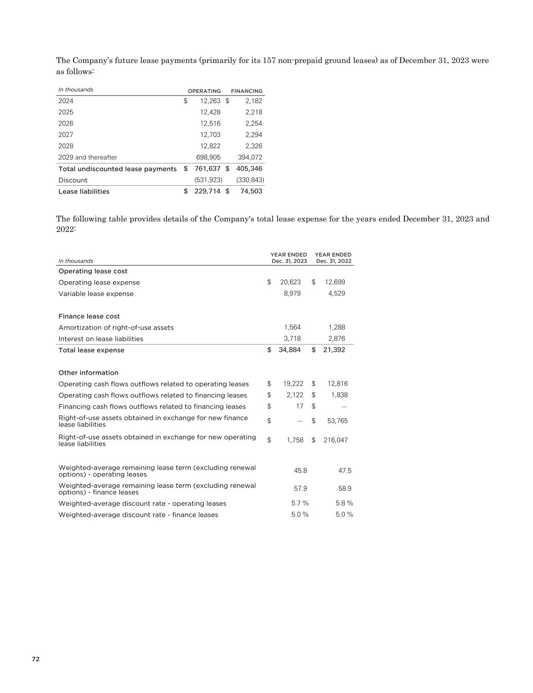 The Company’s future lease payments (primarily for its 157 non-prepaid ground leases) as of December 31, 2023 were as follows: In thousands OPERATING FINANCING 2024 $ 12,263 $ 2,182 2025 12,428 2,218 2026 12,516 2,254 2027 12,703 2,294 2028 12,822 2,326 2029 and thereafter 698,905 394,072 Total undiscounted lease payments $ 761,637 $ 405,346 Discount (531,923) (330,843) Lease liabilities $ 229,714 $ 74,503 The following table provides details of the Company's total lease expense for the years ended December 31, 2023 and 2022: In thousands YEAR ENDED Dec. 31, 2023 YEAR ENDED Dec. 31, 2022 Operating lease cost Operating lease expense $ 20,623 $ 12,699 Variable lease expense 8,979 4,529 Finance lease cost Amortization of right-of-use assets 1,564 1,288 Interest on lease liabilities 3,718 2,876 Total lease expense $ 34,884 $ 21,392 Other information Operating cash flows outflows related to operating leases $ 19,222 $ 12,816 Operating cash flows outflows related to financing leases $ 2,122 $ 1,838 Financing cash flows outflows related to financing leases $ 17 $ — Right-of-use assets obtained in exchange for new finance lease liabilities $ — $ 53,765 Right-of-use assets obtained in exchange for new operating lease liabilities $ 1,758 $ 216,047 Weighted-average remaining lease term (excluding renewal options) - operating leases 45.8 47.5 Weighted-average remaining lease term (excluding renewal options) - finance leases 57.9 58.9 Weighted-average discount rate - operating leases 5.7 % 5.8 % Weighted-average discount rate - finance leases 5.0 % 5.0 % 72