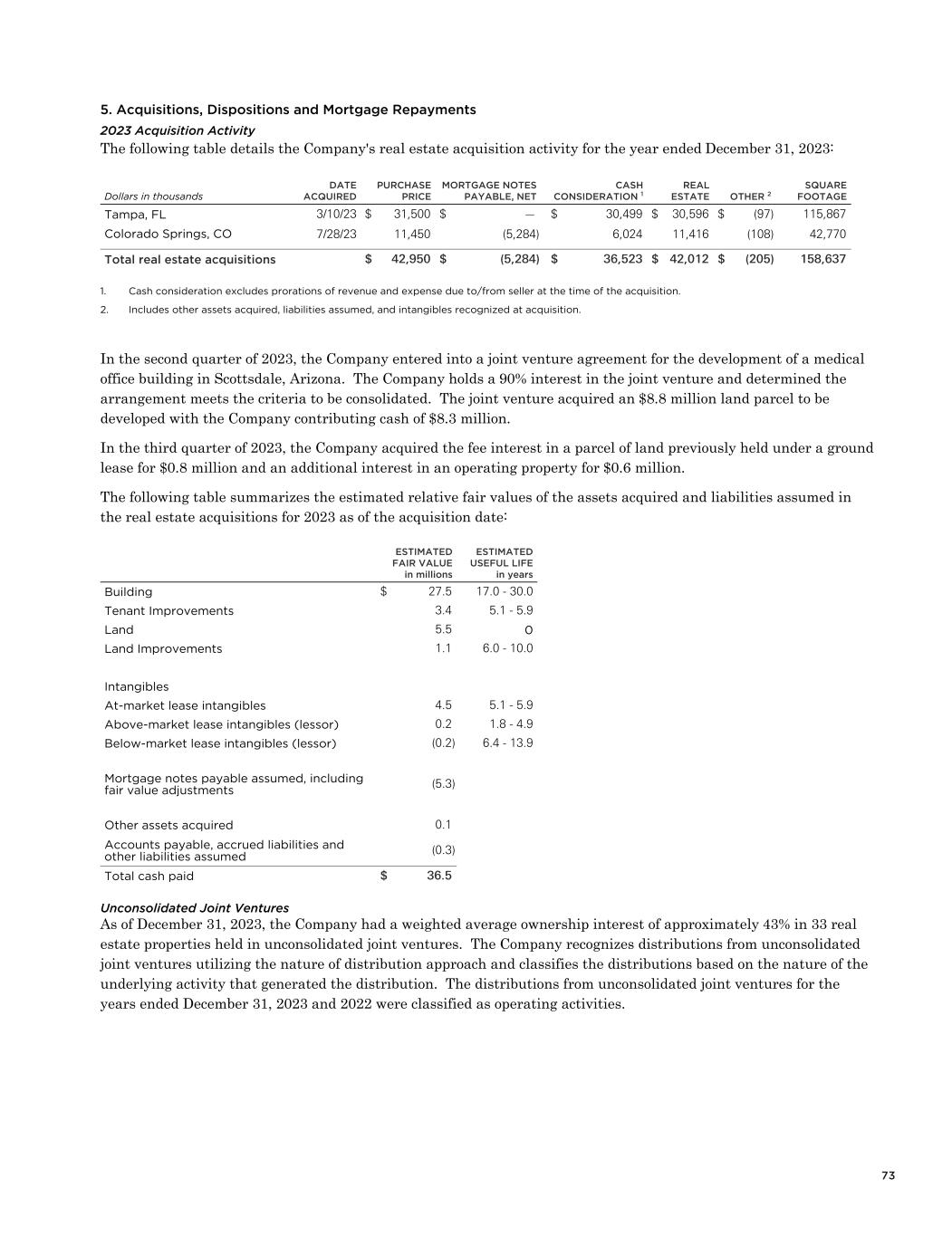 The Company's investment in and loss recognized for the years ended December 31, 2023 and 2022 related to its unconsolidated joint ventures accounted for under the equity method are shown in the table below: DECEMBER 31, Dollars in millions 2023 2022 Investments in unconsolidated joint ventures, beginning of period $ 327.2 $ 161.9 New investments during the period 3.8 167.9 Equity loss recognized during the period (1.7) (0.7) Owner distributions (17.8) (1.9) Investments in unconsolidated joint ventures, end of period $ 311.5 $ 327.2 2022 Acquisitions The following table details the Company's acquisitions, exclusive of the Merger, for the year ended December 31, 2022: Dollars in thousands TYPE 1 DATE ACQUIRED PURCHASE PRICE CASH CONSIDERATION 2 REAL ESTATE OTHER 3 SQUARE FOOTAGE unaudited Dallas, TX 4 MOB 2/11/22 $ 8,175 $ 8,185 $ 8,202 $ (17) 18,000 San Francisco, CA 5 MOB 3/7/22 114,000 112,986 108,687 4,299 166,396 Atlanta, GA MOB 4/7/22 6,912 7,054 7,178 (124) 21,535 Denver, CO MOB 4/13/22 6,320 5,254 5,269 (15) 12,207 Colorado Springs, CO 6 MOB 4/13/22 13,680 13,686 13,701 (15) 25,800 Seattle, WA MOB 4/28/22 8,350 8,334 8,370 (36) 13,256 Houston, TX MOB 4/28/22 36,250 36,299 36,816 (517) 76,781 Los Angeles, CA MOB 4/29/22 35,000 35,242 25,400 9,842 34,282 Oklahoma City, OK MOB 4/29/22 11,100 11,259 11,334 (75) 34,944 Raleigh, NC 5 MOB 5/31/22 27,500 26,710 27,127 (417) 85,113 Tampa, FL 6 MOB 6/9/22 18,650 18,619 18,212 407 55,788 Seattle, WA MOB 8/1/22 4,850 4,806 4,882 (76) 10,593 Raleigh, NC MOB 8/9/22 3,783 3,878 3,932 (54) 11,345 Jacksonville, FL MOB 8/9/22 18,195 18,508 18,583 (75) 34,133 Atlanta, GA MOB 8/10/22 11,800 11,525 12,038 (513) 43,496 Denver, CO MOB 8/11/22 14,800 13,902 13,918 (16) 34,785 Raleigh, NC MOB 8/18/22 11,375 10,670 10,547 123 31,318 Nashville, TN MOB 9/15/22 21,000 20,764 20,572 192 61,932 Austin, TX MOB 9/29/22 5,450 5,449 5,572 (123) 15,000 Jacksonville, FL 4 MOB 10/12/22 3,600 3,530 3,609 (79) 6,200 Houston, TX MOB 11/21/22 5,500 5,469 5,513 (44) 28,369 Austin, TX 7 MOB 12/28/22 888 890 889 1 2,219 Denver, CO MOB 12/28/22 16,400 16,170 16,467 (297) 39,692 $ 403,578 $ 399,189 $ 386,818 $ 12,371 863,184 1 MOB = medical outpatient building. 2 Cash consideration excludes prorations of revenue and expense due to/from seller at the time of the acquisition. 3 Includes other assets acquired, liabilities assumed, and intangibles recognized at acquisition. 4 Represents a single-tenant property. 5 Includes three properties. 6 Includes two properties. 7 The Company acquired additional ownership interests in an existing building bringing the Company's ownership to 71.4%. The following table summarizes the estimated relative fair values of the assets acquired and liabilities assumed in the real estate acquisitions for 2022 as of the acquisition date: ESTIMATED FAIR VALUE in millions ESTIMATED USEFUL LIFE in years Building $ 250.7 14.0 - 38.0 Tenant Improvements 20.7 1.5 - 13.4 Land 76.1 — Land Improvements 11.2 5.0 - 14.0 Intangibles At-market lease intangibles 28.1 1.5 - 13.4 Above-market lease intangibles (lessor) 15.9 1.3 - 15.6 Below-market lease intangibles (lessor) (2.2) 1.3 - 19.3 Below-market lease intangibles (lessee) 1.2 13.1 Other assets acquired 0.4 Accounts payable, accrued liabilities and other liabilities assumed (2.9) Total cash paid $ 399.2 Unconsolidated Joint Ventures The following table details the joint venture acquisitions for the year ended December 31, 2022: Dollars in thousands TYPE 1 DATE ACQUIRED PURCHASE PRICE CASH CONSIDERATION 2 REAL ESTATE OTHER 3 SQUARE FOOTAGE unaudited San Francisco, CA 4 MOB 3/7/22 $ 67,175 $ 66,789 $ 65,179 $ 1,610 110,865 Los Angeles, CA 5 MOB 3/7/22 33,800 32,384 32,390 (6) 103,259 $ 100,975 $ 99,173 $ 97,569 $ 1,604 214,124 1 MOB = medical outpatient building. 2 Cash consideration excludes prorations of revenue and expense due to/from seller at the time of the acquisition. 3 Includes other assets acquired, liabilities assumed, and intangibles recognized at acquisition. 4 Includes three properties. 5 Includes two properties. 75
