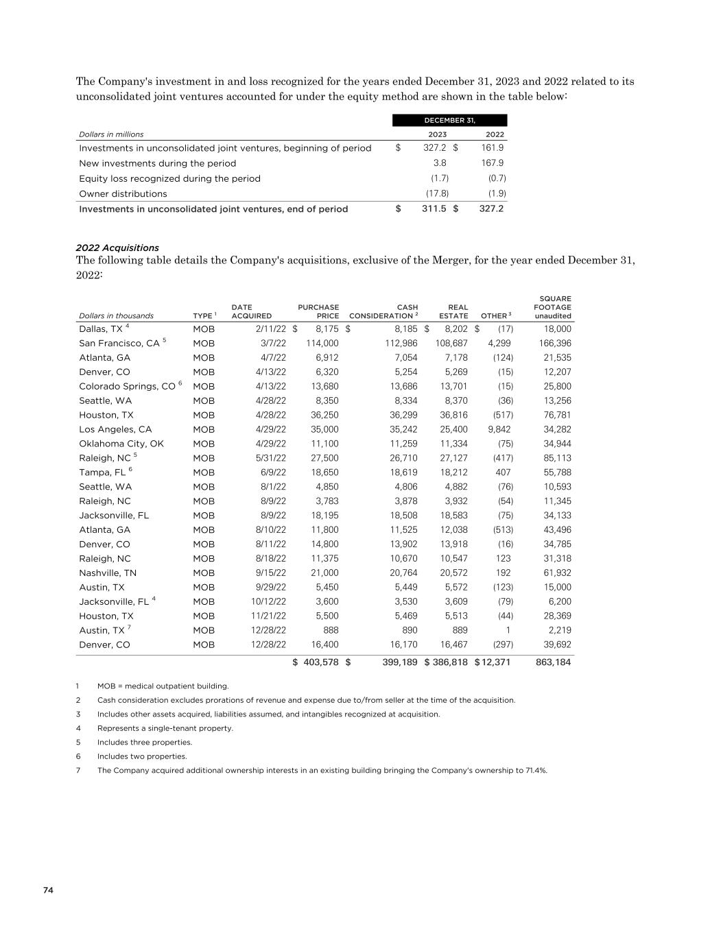 The Company's investment in and loss recognized for the years ended December 31, 2023 and 2022 related to its unconsolidated joint ventures accounted for under the equity method are shown in the table below: DECEMBER 31, Dollars in millions 2023 2022 Investments in unconsolidated joint ventures, beginning of period $ 327.2 $ 161.9 New investments during the period 3.8 167.9 Equity loss recognized during the period (1.7) (0.7) Owner distributions (17.8) (1.9) Investments in unconsolidated joint ventures, end of period $ 311.5 $ 327.2 2022 Acquisitions The following table details the Company's acquisitions, exclusive of the Merger, for the year ended December 31, 2022: Dollars in thousands TYPE 1 DATE ACQUIRED PURCHASE PRICE CASH CONSIDERATION 2 REAL ESTATE OTHER 3 SQUARE FOOTAGE unaudited Dallas, TX 4 MOB 2/11/22 $ 8,175 $ 8,185 $ 8,202 $ (17) 18,000 San Francisco, CA 5 MOB 3/7/22 114,000 112,986 108,687 4,299 166,396 Atlanta, GA MOB 4/7/22 6,912 7,054 7,178 (124) 21,535 Denver, CO MOB 4/13/22 6,320 5,254 5,269 (15) 12,207 Colorado Springs, CO 6 MOB 4/13/22 13,680 13,686 13,701 (15) 25,800 Seattle, WA MOB 4/28/22 8,350 8,334 8,370 (36) 13,256 Houston, TX MOB 4/28/22 36,250 36,299 36,816 (517) 76,781 Los Angeles, CA MOB 4/29/22 35,000 35,242 25,400 9,842 34,282 Oklahoma City, OK MOB 4/29/22 11,100 11,259 11,334 (75) 34,944 Raleigh, NC 5 MOB 5/31/22 27,500 26,710 27,127 (417) 85,113 Tampa, FL 6 MOB 6/9/22 18,650 18,619 18,212 407 55,788 Seattle, WA MOB 8/1/22 4,850 4,806 4,882 (76) 10,593 Raleigh, NC MOB 8/9/22 3,783 3,878 3,932 (54) 11,345 Jacksonville, FL MOB 8/9/22 18,195 18,508 18,583 (75) 34,133 Atlanta, GA MOB 8/10/22 11,800 11,525 12,038 (513) 43,496 Denver, CO MOB 8/11/22 14,800 13,902 13,918 (16) 34,785 Raleigh, NC MOB 8/18/22 11,375 10,670 10,547 123 31,318 Nashville, TN MOB 9/15/22 21,000 20,764 20,572 192 61,932 Austin, TX MOB 9/29/22 5,450 5,449 5,572 (123) 15,000 Jacksonville, FL 4 MOB 10/12/22 3,600 3,530 3,609 (79) 6,200 Houston, TX MOB 11/21/22 5,500 5,469 5,513 (44) 28,369 Austin, TX 7 MOB 12/28/22 888 890 889 1 2,219 Denver, CO MOB 12/28/22 16,400 16,170 16,467 (297) 39,692 $ 403,578 $ 399,189 $ 386,818 $ 12,371 863,184 1 MOB = medical outpatient building. 2 Cash consideration excludes prorations of revenue and expense due to/from seller at the time of the acquisition. 3 Includes other assets acquired, liabilities assumed, and intangibles recognized at acquisition. 4 Represents a single-tenant property. 5 Includes three properties. 6 Includes two properties. 7 The Company acquired additional ownership interests in an existing building bringing the Company's ownership to 71.4%. 74