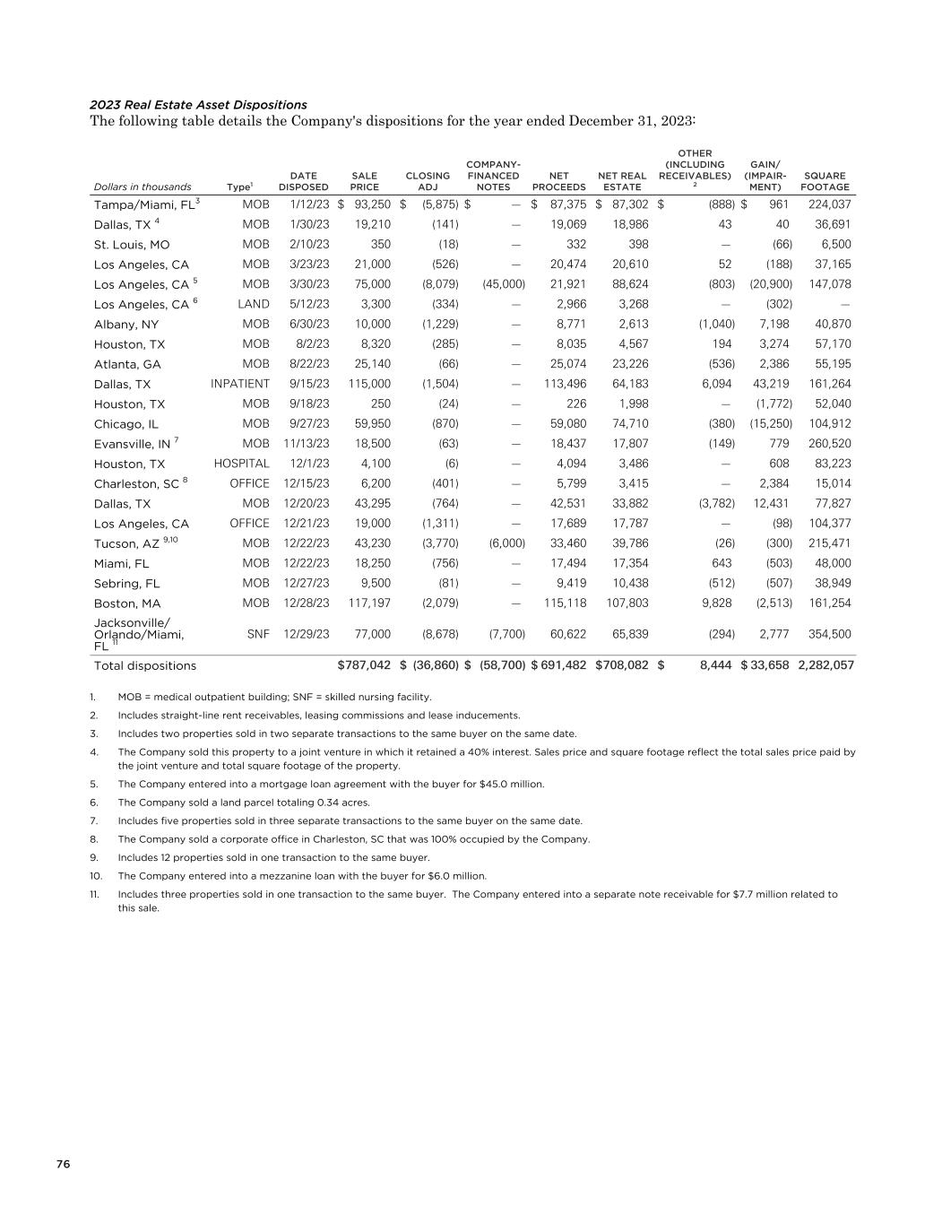2023 Real Estate Asset Dispositions The following table details the Company's dispositions for the year ended December 31, 2023: Dollars in thousands Type1 DATE DISPOSED SALE PRICE CLOSING ADJ COMPANY- FINANCED NOTES NET PROCEEDS NET REAL ESTATE OTHER (INCLUDING RECEIVABLES) 2 GAIN/ (IMPAIR- MENT) SQUARE FOOTAGE Tampa/Miami, FL3 MOB 1/12/23 $ 93,250 $ (5,875) $ — $ 87,375 $ 87,302 $ (888) $ 961 224,037 Dallas, TX 4 MOB 1/30/23 19,210 (141) — 19,069 18,986 43 40 36,691 St. Louis, MO MOB 2/10/23 350 (18) — 332 398 — (66) 6,500 Los Angeles, CA MOB 3/23/23 21,000 (526) — 20,474 20,610 52 (188) 37,165 Los Angeles, CA 5 MOB 3/30/23 75,000 (8,079) (45,000) 21,921 88,624 (803) (20,900) 147,078 Los Angeles, CA 6 LAND 5/12/23 3,300 (334) — 2,966 3,268 — (302) — Albany, NY MOB 6/30/23 10,000 (1,229) — 8,771 2,613 (1,040) 7,198 40,870 Houston, TX MOB 8/2/23 8,320 (285) — 8,035 4,567 194 3,274 57,170 Atlanta, GA MOB 8/22/23 25,140 (66) — 25,074 23,226 (536) 2,386 55,195 Dallas, TX INPATIENT 9/15/23 115,000 (1,504) — 113,496 64,183 6,094 43,219 161,264 Houston, TX MOB 9/18/23 250 (24) — 226 1,998 — (1,772) 52,040 Chicago, IL MOB 9/27/23 59,950 (870) — 59,080 74,710 (380) (15,250) 104,912 Evansville, IN 7 MOB 11/13/23 18,500 (63) — 18,437 17,807 (149) 779 260,520 Houston, TX HOSPITAL 12/1/23 4,100 (6) — 4,094 3,486 — 608 83,223 Charleston, SC 8 OFFICE 12/15/23 6,200 (401) — 5,799 3,415 — 2,384 15,014 Dallas, TX MOB 12/20/23 43,295 (764) — 42,531 33,882 (3,782) 12,431 77,827 Los Angeles, CA OFFICE 12/21/23 19,000 (1,311) — 17,689 17,787 — (98) 104,377 Tucson, AZ 9,10 MOB 12/22/23 43,230 (3,770) (6,000) 33,460 39,786 (26) (300) 215,471 Miami, FL MOB 12/22/23 18,250 (756) — 17,494 17,354 643 (503) 48,000 Sebring, FL MOB 12/27/23 9,500 (81) — 9,419 10,438 (512) (507) 38,949 Boston, MA MOB 12/28/23 117,197 (2,079) — 115,118 107,803 9,828 (2,513) 161,254 Jacksonville/ Orlando/Miami, FL 11 SNF 12/29/23 77,000 (8,678) (7,700) 60,622 65,839 (294) 2,777 354,500 Total dispositions $ 787,042 $ (36,860) $ (58,700) $ 691,482 $ 708,082 $ 8,444 $ 33,658 2,282,057 1. MOB = medical outpatient building; SNF = skilled nursing facility. 2. Includes straight-line rent receivables, leasing commissions and lease inducements. 3. Includes two properties sold in two separate transactions to the same buyer on the same date. 4. The Company sold this property to a joint venture in which it retained a 40% interest. Sales price and square footage reflect the total sales price paid by the joint venture and total square footage of the property. 5. The Company entered into a mortgage loan agreement with the buyer for $45.0 million. 6. The Company sold a land parcel totaling 0.34 acres. 7. Includes five properties sold in three separate transactions to the same buyer on the same date. 8. The Company sold a corporate office in Charleston, SC that was 100% occupied by the Company. 9. Includes 12 properties sold in one transaction to the same buyer. 10. The Company entered into a mezzanine loan with the buyer for $6.0 million. 11. Includes three properties sold in one transaction to the same buyer. The Company entered into a separate note receivable for $7.7 million related to this sale. 76