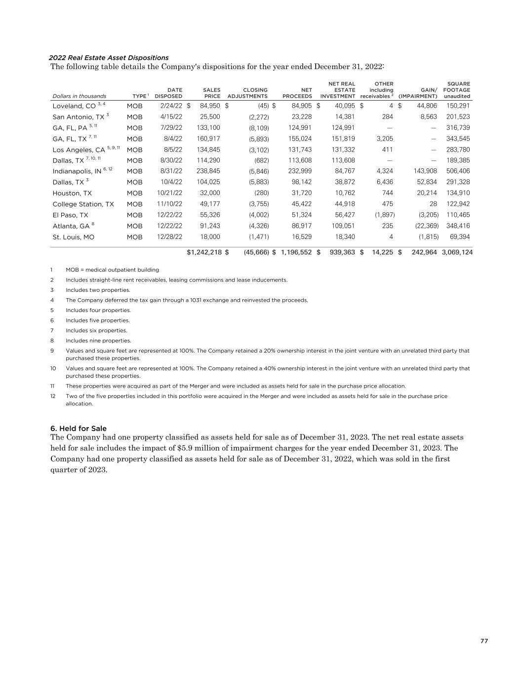 2022 Real Estate Asset Dispositions The following table details the Company's dispositions for the year ended December 31, 2022: Dollars in thousands TYPE 1 DATE DISPOSED SALES PRICE CLOSING ADJUSTMENTS NET PROCEEDS NET REAL ESTATE INVESTMENT OTHER including receivables 2 GAIN/ (IMPAIRMENT) SQUARE FOOTAGE unaudited Loveland, CO 3, 4 MOB 2/24/22 $ 84,950 $ (45) $ 84,905 $ 40,095 $ 4 $ 44,806 150,291 San Antonio, TX 3 MOB 4/15/22 25,500 (2,272) 23,228 14,381 284 8,563 201,523 GA, FL, PA 5, 11 MOB 7/29/22 133,100 (8,109) 124,991 124,991 — — 316,739 GA, FL, TX 7, 11 MOB 8/4/22 160,917 (5,893) 155,024 151,819 3,205 — 343,545 Los Angeles, CA 5, 9, 11 MOB 8/5/22 134,845 (3,102) 131,743 131,332 411 — 283,780 Dallas, TX 7, 10, 11 MOB 8/30/22 114,290 (682) 113,608 113,608 — — 189,385 Indianapolis, IN 6, 12 MOB 8/31/22 238,845 (5,846) 232,999 84,767 4,324 143,908 506,406 Dallas, TX 3 MOB 10/4/22 104,025 (5,883) 98,142 38,872 6,436 52,834 291,328 Houston, TX MOB 10/21/22 32,000 (280) 31,720 10,762 744 20,214 134,910 College Station, TX MOB 11/10/22 49,177 (3,755) 45,422 44,918 475 28 122,942 El Paso, TX MOB 12/22/22 55,326 (4,002) 51,324 56,427 (1,897) (3,205) 110,465 Atlanta, GA 8 MOB 12/22/22 91,243 (4,326) 86,917 109,051 235 (22,369) 348,416 St. Louis, MO MOB 12/28/22 18,000 (1,471) 16,529 18,340 4 (1,815) 69,394 $ 1,242,218 $ (45,666) $ 1,196,552 $ 939,363 $ 14,225 $ 242,964 3,069,124 1 MOB = medical outpatient building 2 Includes straight-line rent receivables, leasing commissions and lease inducements. 3 Includes two properties. 4 The Company deferred the tax gain through a 1031 exchange and reinvested the proceeds. 5 Includes four properties. 6 Includes five properties. 7 Includes six properties. 8 Includes nine properties. 9 Values and square feet are represented at 100%. The Company retained a 20% ownership interest in the joint venture with an unrelated third party that purchased these properties. 10 Values and square feet are represented at 100%. The Company retained a 40% ownership interest in the joint venture with an unrelated third party that purchased these properties. 11 These properties were acquired as part of the Merger and were included as assets held for sale in the purchase price allocation. 12 Two of the five properties included in this portfolio were acquired in the Merger and were included as assets held for sale in the purchase price allocation. 6. Held for Sale The Company had one property classified as assets held for sale as of December 31, 2023. The net real estate assets held for sale includes the impact of $5.9 million of impairment charges for the year ended December 31, 2023. The Company had one property classified as assets held for sale as of December 31, 2022, which was sold in the first quarter of 2023. 77