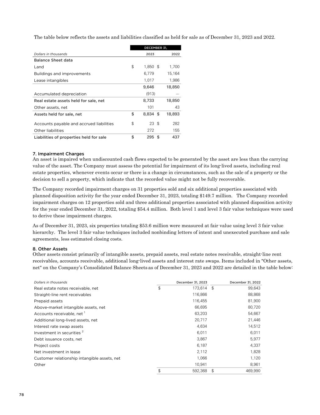 The table below reflects the assets and liabilities classified as held for sale as of December 31, 2023 and 2022. DECEMBER 31, Dollars in thousands 2023 2022 Balance Sheet data Land $ 1,850 $ 1,700 Buildings and improvements 6,779 15,164 Lease intangibles 1,017 1,986 9,646 18,850 Accumulated depreciation (913) — Real estate assets held for sale, net 8,733 18,850 Other assets, net 101 43 Assets held for sale, net $ 8,834 $ 18,893 Accounts payable and accrued liabilities $ 23 $ 282 Other liabilities 272 155 Liabilities of properties held for sale $ 295 $ 437 7. Impairment Charges An asset is impaired when undiscounted cash flows expected to be generated by the asset are less than the carrying value of the asset. The Company must assess the potential for impairment of its long-lived assets, including real estate properties, whenever events occur or there is a change in circumstances, such as the sale of a property or the decision to sell a property, which indicate that the recorded value might not be fully recoverable. The Company recorded impairment charges on 31 properties sold and six additional properties associated with planned disposition activity for the year ended December 31, 2023, totaling $149.7 million. The Company recorded impairment charges on 12 properties sold and three additional properties associated with planned disposition activity for the year ended December 31, 2022, totaling $54.4 million. Both level 1 and level 3 fair value techniques were used to derive these impairment charges. As of December 31, 2023, six properties totaling $53.6 million were measured at fair value using level 3 fair value hierarchy. The level 3 fair value techniques included nonbinding letters of intent and unexecuted purchase and sale agreements, less estimated closing costs. 8. Other Assets Other assets consist primarily of intangible assets, prepaid assets, real estate notes receivable, straight-line rent receivables, accounts receivable, additional long-lived assets and interest rate swaps. Items included in "Other assets, net" on the Company’s Consolidated Balance Sheets as of December 31, 2023 and 2022 are detailed in the table below: Dollars in thousands December 31, 2023 December 31, 2022 Real estate notes receivable, net $ 173,614 $ 99,643 Straight-line rent receivables 116,866 88,868 Prepaid assets 116,455 81,900 Above-market intangible assets, net 66,695 80,720 Accounts receivable, net 1 63,203 54,667 Additional long-lived assets, net 20,717 21,446 Interest rate swap assets 4,634 14,512 Investment in securities 2 6,011 6,011 Debt issuance costs, net 3,867 5,977 Project costs 6,187 4,337 Net investment in lease 2,112 1,828 Customer relationship intangible assets, net 1,066 1,120 Other 10,941 8,961 $ 592,368 $ 469,990 78