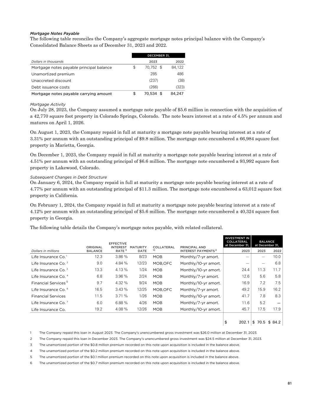 10. Notes and Bonds Payable DECEMBER 31, MATURITY DATES CONTRACTUAL INTEREST RATES EFFECTIVE INTEREST RATES PRINCIPAL PAYMENTS INTEREST PAYMENTSDollars in thousands 2023 2022 $1.5B Unsecured Credit Facility — 385,000 10/25 SOFR + 0.95% 6.24 % At maturity Monthly $350M Unsecured Term Loan 1 349,798 349,114 7/24 SOFR + 1.05% 6.30 % At maturity Monthly $200M Unsecured Term Loan 1 199,903 199,670 5/24 SOFR + 1.05% 6.30 % At maturity Monthly $150M Unsecured Term Loan 1 149,643 149,495 6/26 SOFR + 1.05% 6.30 % At maturity Monthly $300M Unsecured Term Loan 1 299,958 299,936 10/25 SOFR + 1.05% 6.30 % At maturity Monthly $200M Unsecured Term Loan 1 199,502 199,362 7/27 SOFR + 1.05% 6.30 % At maturity Monthly $300M Unsecured Term Loan 1 298,288 297,869 1/28 SOFR + 1.05% 6.30 % At maturity Monthly Senior Notes due 2025 1 249,484 249,115 5/25 3.88 % 4.12 % At maturity Semi-annual Senior Notes due 2026 1 579,017 571,587 8/26 3.50 % 4.94 % At maturity Semi-annual Senior Notes due 2027 1 483,727 479,553 7/27 3.75 % 4.76 % At maturity Semi-annual Senior Notes due 2028 1 297,429 296,852 1/28 3.63 % 3.85 % At maturity Semi-annual Senior Notes due 2030 1 575,443 565,402 2/30 3.10 % 5.30 % At maturity Semi-annual Senior Notes due 2030 1 296,780 296,385 3/30 2.40 % 2.72 % At maturity Semi-annual Senior Notes due 2031 1 295,832 295,547 3/31 2.05 % 2.25 % At maturity Semi-annual Senior Notes due 2031 1 649,521 632,693 3/31 2.00 % 5.13 % At maturity Semi-annual Mortgage notes payable 2 70,534 84,247 1/24-12/26 3.6%-4.77% 3.57%-6.88% Monthly Monthly $ 4,994,859 $ 5,351,827 1 Balances are shown net of discounts and unamortized issuance costs. 2 Balances are shown net of discounts and unamortized issuance costs and include premiums. The Company’s various debt agreements contain certain representations, warranties, and financial and other covenants customary in such loan agreements. Among other things, these provisions require the Company to maintain certain financial ratios and impose certain limits on the Company’s ability to incur indebtedness and create liens or encumbrances. As of December 31, 2023, the Company was in compliance with its financial covenant provisions under its various debt instruments. Senior Notes The following table reconciles the Company’s aggregate Senior notes principal balance with the Company’s Consolidated Balance Sheets as of December 31, 2023 and 2022. DECEMBER 31, Dollars in thousands 2023 2022 Senior notes principal balance $ 3,699,285 $ 3,699,500 Unaccreted discount (265,852) (304,919) Debt issuance costs (6,200) (7,447) Senior notes carrying amount $ 3,427,233 $ 3,387,134 Term Loans The following table reconciles the Company’s aggregate term loan principal balance with the Company’s Consolidated Balance Sheets as of December 31, 2023 and 2022. DECEMBER 31, Dollars in thousands 2023 2022 Term loan principal balances $ 1,500,000 $ 1,500,000 Debt issuance costs (2,908) (4,554) Term Loans carrying amount $ 1,497,092 $ 1,495,446 Mortgage Notes Payable The following table reconciles the Company’s aggregate mortgage notes principal balance with the Company’s Consolidated Balance Sheets as of December 31, 2023 and 2022. DECEMBER 31, Dollars in thousands 2023 2022 Mortgage notes payable principal balance $ 70,752 $ 84,122 Unamortized premium 285 486 Unaccreted discount (237) (38) Debt issuance costs (266) (323) Mortgage notes payable carrying amount $ 70,534 $ 84,247 Mortgage Activity On July 28, 2023, the Company assumed a mortgage note payable of $5.6 million in connection with the acquisition of a 42,770 square foot property in Colorado Springs, Colorado. The note bears interest at a rate of 4.5% per annum and matures on April 1, 2026. On August 1, 2023, the Company repaid in full at maturity a mortgage note payable bearing interest at a rate of 3.31% per annum with an outstanding principal of $9.8 million. The mortgage note encumbered a 66,984 square foot property in Marietta, Georgia. On December 1, 2023, the Company repaid in full at maturity a mortgage note payable bearing interest at a rate of 4.51% per annum with an outstanding principal of $6.6 million. The mortgage note encumbered a 93,992 square foot property in Lakewood, Colorado. Subsequent Changes in Debt Structure On January 6, 2024, the Company repaid in full at maturity a mortgage note payable bearing interest at a rate of 4.77% per annum with an outstanding principal of $11.3 million. The mortgage note encumbered a 63,012 square foot property in California. On February 1, 2024, the Company repaid in full at maturity a mortgage note payable bearing interest at a rate of 4.12% per annum with an outstanding principal of $5.6 million. The mortgage note encumbered a 40,324 square foot property in Georgia. The following table details the Company’s mortgage notes payable, with related collateral. ORIGINAL BALANCE EFFECTIVE INTEREST RATE 9 MATURITY DATE COLLATERAL 10 PRINCIPAL AND INTEREST PAYMENTS 8 INVESTMENT IN COLLATERAL at December 31, BALANCE at December 31, Dollars in millions 2023 2023 2022 Life Insurance Co. 1 12.3 3.86 % 8/23 MOB Monthly/7-yr amort. — — 10.0 Life Insurance Co. 2 9.0 4.84 % 12/23 MOB,OFC Monthly/10-yr amort. — — 6.8 Life Insurance Co. 3 13.3 4.13 % 1/24 MOB Monthly/10-yr amort. 24.4 11.3 11.7 Life Insurance Co. 4 6.8 3.96 % 2/24 MOB Monthly/7-yr amort. 12.6 5.6 5.8 Financial Services 5 9.7 4.32 % 9/24 MOB Monthly/10-yr amort. 16.9 7.2 7.5 Life Insurance Co. 6 16.5 3.43 % 12/25 MOB,OFC Monthly/7-yr amort. 49.2 15.9 16.2 Financial Services 11.5 3.71 % 1/26 MOB Monthly/10-yr amort. 41.7 7.8 8.3 Life Insurance Co. 7 6.0 6.88 % 4/26 MOB Monthly/7-yr amort. 11.6 5.2 — Life Insurance Co. 19.2 4.08 % 12/26 MOB Monthly/10-yr amort. 45.7 17.5 17.9 $ 202.1 $ 70.5 $ 84.2 1 The Company repaid this loan in August 2023. The Company's unencumbered gross investment was $26.0 million at December 31, 2023. 2 The Company repaid this loan in December 2023. The Company's unencumbered gross inve