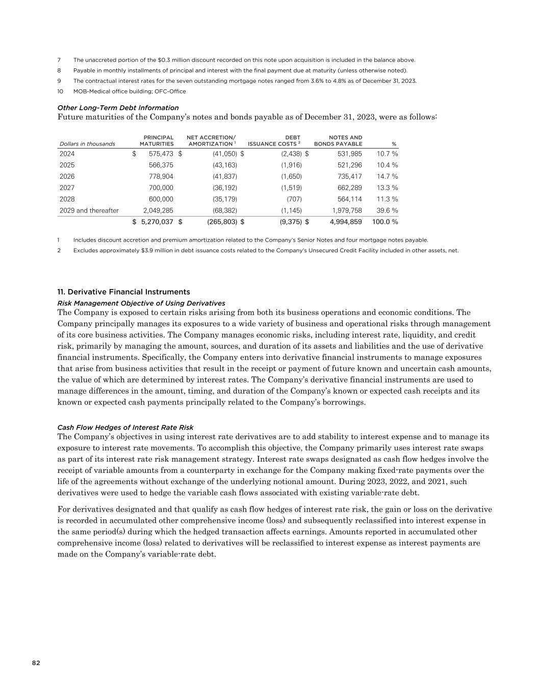 7 The unaccreted portion of the $0.3 million discount recorded on this note upon acquisition is included in the balance above. 8 Payable in monthly installments of principal and interest with the final payment due at maturity (unless otherwise noted). 9 The contractual interest rates for the seven outstanding mortgage notes ranged from 3.6% to 4.8% as of December 31, 2023. 10 MOB-Medical office building; OFC-Office Other Long-Term Debt Information Future maturities of the Company’s notes and bonds payable as of December 31, 2023, were as follows: Dollars in thousands PRINCIPAL MATURITIES NET ACCRETION/ AMORTIZATION 1 DEBT ISSUANCE COSTS 2 NOTES AND BONDS PAYABLE % 2024 $ 575,473 $ (41,050) $ (2,438) $ 531,985 10.7 % 2025 566,375 (43,163) (1,916) 521,296 10.4 % 2026 778,904 (41,837) (1,650) 735,417 14.7 % 2027 700,000 (36,192) (1,519) 662,289 13.3 % 2028 600,000 (35,179) (707) 564,114 11.3 % 2029 and thereafter 2,049,285 (68,382) (1,145) 1,979,758 39.6 % $ 5,270,037 $ (265,803) $ (9,375) $ 4,994,859 100.0 % 1 Includes discount accretion and premium amortization related to the Company’s Senior Notes and four mortgage notes payable. 2 Excludes approximately $3.9 million in debt issuance costs related to the Company's Unsecured Credit Facility included in other assets, net. 11. Derivative Financial Instruments Risk Management Objective of Using Derivatives The Company is exposed to certain risks arising from both its business operations and economic conditions. The Company principally manages its exposures to a wide variety of business and operational risks through management of its core business activities. The Company manages economic risks, including interest rate, liquidity, and credit risk, primarily by managing the amount, sources, and duration of its assets and liabilities and the use of derivative financial instruments. Specifically, the Company enters into derivative financial instruments to manage exposures that arise from business activities that result in the receipt or payment of future known and uncertain cash amounts, the value of which are determined by interest rates. The Company’s derivative financial instruments are used to manage differences in the amount, timing, and duration of the Company’s known or expected cash receipts and its known or expected cash payments principally related to the Company’s borrowings. Cash Flow Hedges of Interest Rate Risk The Company’s objectives in using interest rate derivatives are to add stability to interest expense and to manage its exposure to interest rate movements. To accomplish this objective, the Company primarily uses interest rate swaps as part of its interest rate risk management strategy. Interest rate swaps designated as cash flow hedges involve the receipt of variable amounts from a counterparty in exchange for the Company making fixed-rate payments over the life of the agreements without exchange of the underlying notional amount. During 2023, 2022, and 2021, such derivatives were used to hedge the variable cash flows associated with existing variable-rate debt. For derivatives designated and that qualify as cash flow hedges of interest rate risk, the gain or loss on the derivative is recorded in accumulated other comprehensive income (loss) and subsequently reclassified into interest expense in the same period(s) during which the hedged transaction affects earnings. Amounts reported in accumulated other comprehensive income (loss) related to derivatives will be reclassified to interest expense as interest payments are made on the Company’s variable-rate debt. 82
