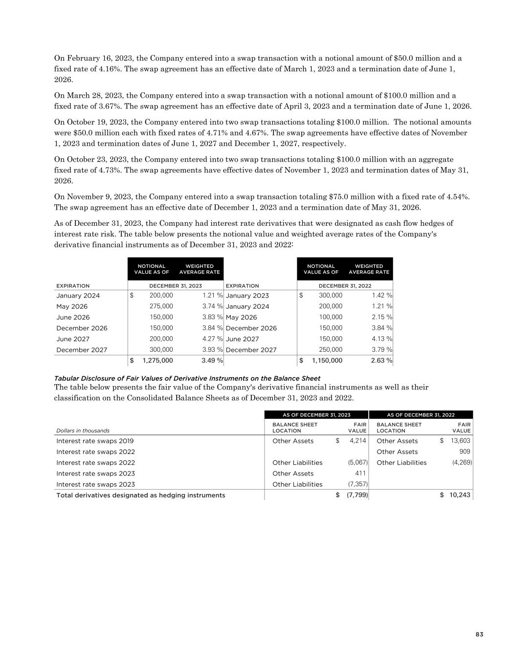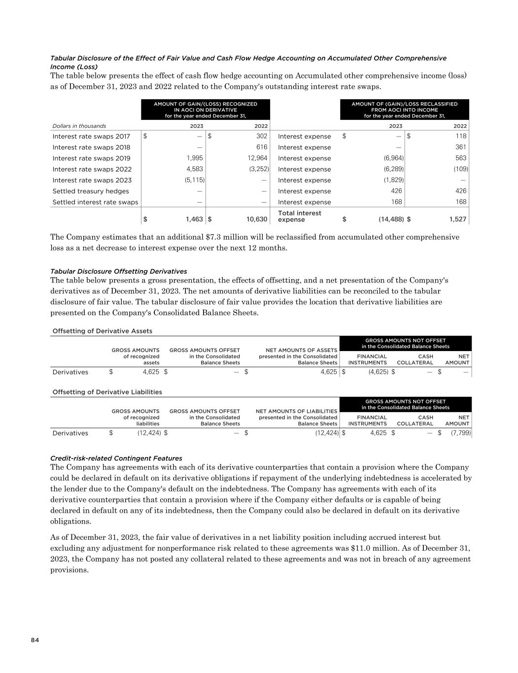 Tabular Disclosure of the Effect of Fair Value and Cash Flow Hedge Accounting on Accumulated Other Comprehensive Income (Loss) The table below presents the effect of cash flow hedge accounting on Accumulated other comprehensive income (loss) as of December 31, 2023 and 2022 related to the Company's outstanding interest rate swaps. AMOUNT OF GAIN/(LOSS) RECOGNIZED IN AOCI ON DERIVATIVE for the year ended December 31, AMOUNT OF (GAIN)/LOSS RECLASSIFIED FROM AOCI INTO INCOME for the year ended December 31, Dollars in thousands 2023 2022 2023 2022 Interest rate swaps 2017 $ — $ 302 Interest expense $ — $ 118 Interest rate swaps 2018 — 616 Interest expense — 361 Interest rate swaps 2019 1,995 12,964 Interest expense (6,964) 563 Interest rate swaps 2022 4,583 (3,252) Interest expense (6,289) (109) Interest rate swaps 2023 (5,115) — Interest expense (1,829) — Settled treasury hedges — — Interest expense 426 426 Settled interest rate swaps — — Interest expense 168 168 $ 1,463 $ 10,630 Total interest expense $ (14,488) $ 1,527 The Company estimates that an additional $7.3 million will be reclassified from accumulated other comprehensive loss as a net decrease to interest expense over the next 12 months. Tabular Disclosure Offsetting Derivatives The table below presents a gross presentation, the effects of offsetting, and a net presentation of the Company's derivatives as of December 31, 2023. The net amounts of derivative liabilities can be reconciled to the tabular disclosure of fair value. The tabular disclosure of fair value provides the location that derivative liabilities are presented on the Company's Consolidated Balance Sheets. Offsetting of Derivative Assets GROSS AMOUNTS of recognized assets GROSS AMOUNTS OFFSET in the Consolidated Balance Sheets NET AMOUNTS OF ASSETS presented in the Consolidated Balance Sheets GROSS AMOUNTS NOT OFFSET in the Consolidated Balance Sheets FINANCIAL INSTRUMENTS CASH COLLATERAL NET AMOUNT Derivatives $ 4,625 $ — $ 4,625 $ (4,625) $ — $ — Offsetting of Derivative Liabilities GROSS AMOUNTS of recognized liabilities GROSS AMOUNTS OFFSET in the Consolidated Balance Sheets NET AMOUNTS OF LIABILITIES presented in the Consolidated Balance Sheets GROSS AMOUNTS NOT OFFSET in the Consolidated Balance Sheets FINANCIAL INSTRUMENTS CASH COLLATERAL NET AMOUNT Derivatives $ (12,424) $ — $ (12,424) $ 4,625 $ — $ (7,799) Credit-risk-related Contingent Features The Company has agreements with each of its derivative counterparties that contain a provision where the Company could be declared in default on its derivative obligations if repayment of the underlying indebtedness is accelerated by the lender due to the Company's default on the indebtedness. The Company has agreements with each of its derivative counterparties that contain a provision where if the Company either defaults or is capable of being declared in default on any of its indebtedness, then the Company could also be declared in default on its derivative obligations. As of December 31, 2023, the fair value of derivatives in a net liability position including accrued interest but excluding any adjustment for nonperformance risk related to these agreements was $11.0 million. As of December 31, 2023, the Company has not posted any collateral related to these agreements and was not in breach of any agreement provisions. 84