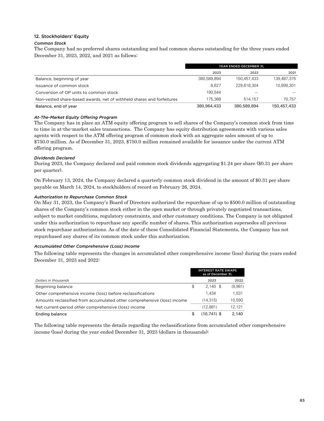12. Stockholders’ Equity Common Stock The Company had no preferred shares outstanding and had common shares outstanding for the three years ended December 31, 2023, 2022, and 2021 as follows: YEAR ENDED DECEMBER 31, 2023 2022 2021 Balance, beginning of year 380,589,894 150,457,433 139,487,375 Issuance of common stock 8,627 229,618,304 10,899,301 Conversion of OP units to common stock 190,544 — — Non-vested share-based awards, net of withheld shares and forfeitures 175,368 514,157 70,757 Balance, end of year 380,964,433 380,589,894 150,457,433 At-The-Market Equity Offering Program The Company has in place an ATM equity offering program to sell shares of the Company’s common stock from time to time in at-the-market sales transactions. The Company has equity distribution agreements with various sales agents with respect to the ATM offering program of common stock with an aggregate sales amount of up to $750.0 million. As of December 31, 2023, $750.0 million remained available for issuance under the current ATM offering program. Dividends Declared During 2023, the Company declared and paid common stock dividends aggregating $1.24 per share ($0.31 per share per quarter). On February 13, 2024, the Company declared a quarterly common stock dividend in the amount of $0.31 per share payable on March 14, 2024, to stockholders of record on February 26, 2024. Authorization to Repurchase Common Stock On May 31, 2023, the Company’s Board of Directors authorized the repurchase of up to $500.0 million of outstanding shares of the Company’s common stock either in the open market or through privately negotiated transactions, subject to market conditions, regulatory constraints, and other customary conditions. The Company is not obligated under this authorization to repurchase any specific number of shares. This authorization supersedes all previous stock repurchase authorizations. As of the date of these Consolidated Financial Statements, the Company has not repurchased any shares of its common stock under this authorization. Accumulated Other Comprehensive (Loss) Income The following table represents the changes in accumulated other comprehensive income (loss) during the years ended December 31, 2023 and 2022: INTEREST RATE SWAPS as of December 31, Dollars in thousands 2023 2022 Beginning balance $ 2,140 $ (9,981) Other comprehensive income (loss) before reclassifications 1,434 1,531 Amounts reclassified from accumulated other comprehensive (loss) income (14,315) 10,590 Net current-period other comprehensive (loss) income (12,881) 12,121 Ending balance $ (10,741) $ 2,140 The following table represents the details regarding the reclassifications from accumulated other comprehensive income (loss) during the year ended December 31, 2023 (dollars in thousands): 85