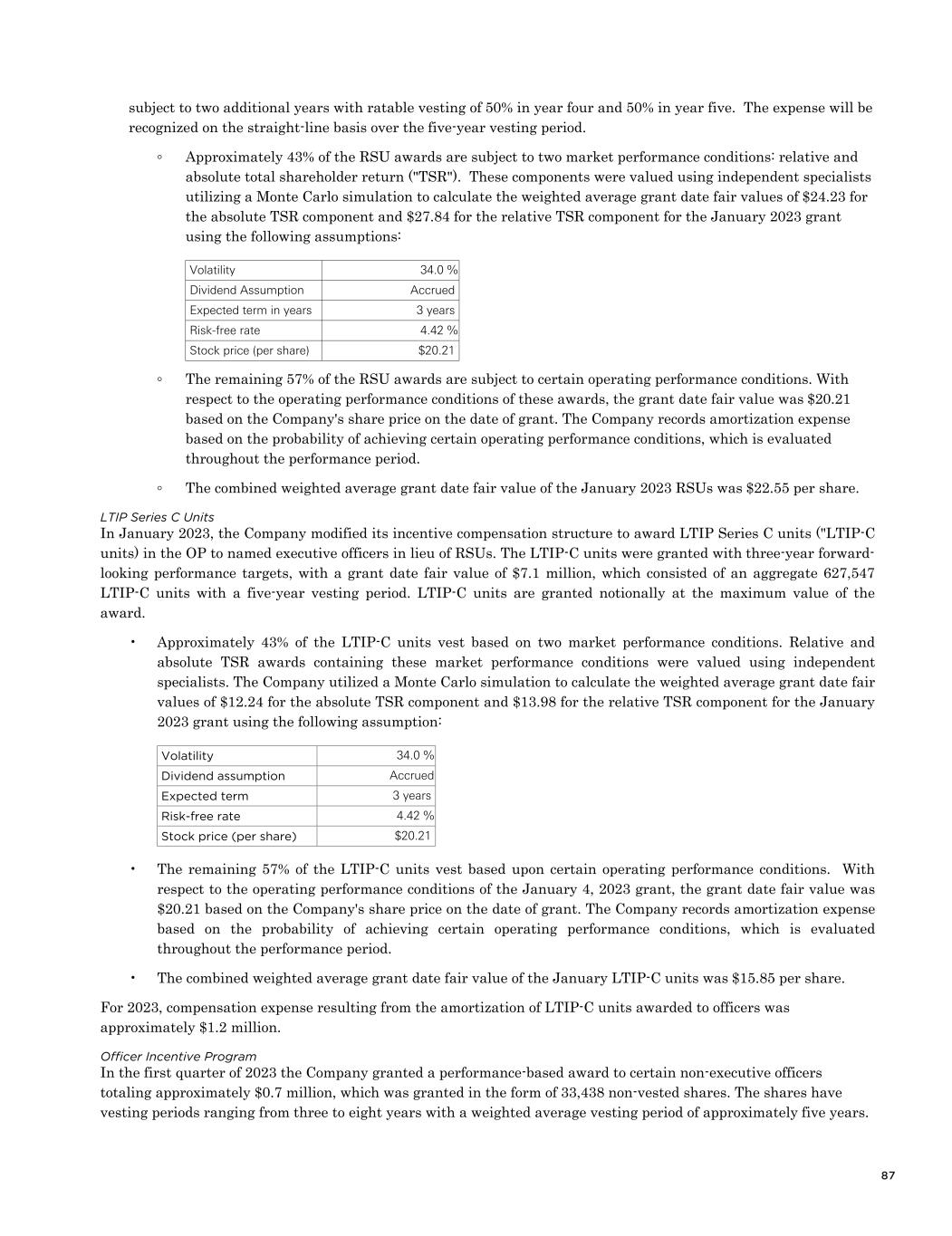 subject to two additional years with ratable vesting of 50% in year four and 50% in year five. The expense will be recognized on the straight-line basis over the five-year vesting period. ◦ Approximately 43% of the RSU awards are subject to two market performance conditions: relative and absolute total shareholder return ("TSR"). These components were valued using independent specialists utilizing a Monte Carlo simulation to calculate the weighted average grant date fair values of $24.23 for the absolute TSR component and $27.84 for the relative TSR component for the January 2023 grant using the following assumptions: Volatility 34.0 % Dividend Assumption Accrued Expected term in years 3 years Risk-free rate 4.42 % Stock price (per share) $20.21 ◦ The remaining 57% of the RSU awards are subject to certain operating performance conditions. With respect to the operating performance conditions of these awards, the grant date fair value was $20.21 based on the Company's share price on the date of grant. The Company records amortization expense based on the probability of achieving certain operating performance conditions, which is evaluated throughout the performance period. ◦ The combined weighted average grant date fair value of the January 2023 RSUs was $22.55 per share. LTIP Series C Units In January 2023, the Company modified its incentive compensation structure to award LTIP Series C units ("LTIP-C units) in the OP to named executive officers in lieu of RSUs. The LTIP-C units were granted with three-year forward- looking performance targets, with a grant date fair value of $7.1 million, which consisted of an aggregate 627,547 LTIP-C units with a five-year vesting period. LTIP-C units are granted notionally at the maximum value of the award. • Approximately 43% of the LTIP-C units vest based on two market performance conditions. Relative and absolute TSR awards containing these market performance conditions were valued using independent specialists. The Company utilized a Monte Carlo simulation to calculate the weighted average grant date fair values of $12.24 for the absolute TSR component and $13.98 for the relative TSR component for the January 2023 grant using the following assumption: Volatility 34.0 % Dividend assumption Accrued Expected term 3 years Risk-free rate 4.42 % Stock price (per share) $20.21 • The remaining 57% of the LTIP-C units vest based upon certain operating performance conditions. With respect to the operating performance conditions of the January 4, 2023 grant, the grant date fair value was $20.21 based on the Company's share price on the date of grant. The Company records amortization expense based on the probability of achieving certain operating performance conditions, which is evaluated throughout the performance period. • The combined weighted average grant date fair value of the January LTIP-C units was $15.85 per share. For 2023, compensation expense resulting from the amortization of LTIP-C units awarded to officers was approximately $1.2 million. Officer Incentive Program In the first quarter of 2023 the Company granted a performance-based award to certain non-executive officers totaling approximately $0.7 million, which was granted in the form of 33,438 non-vested shares. The shares have vesting periods ranging from three to eight years with a weighted average vesting period of approximately five years. 87