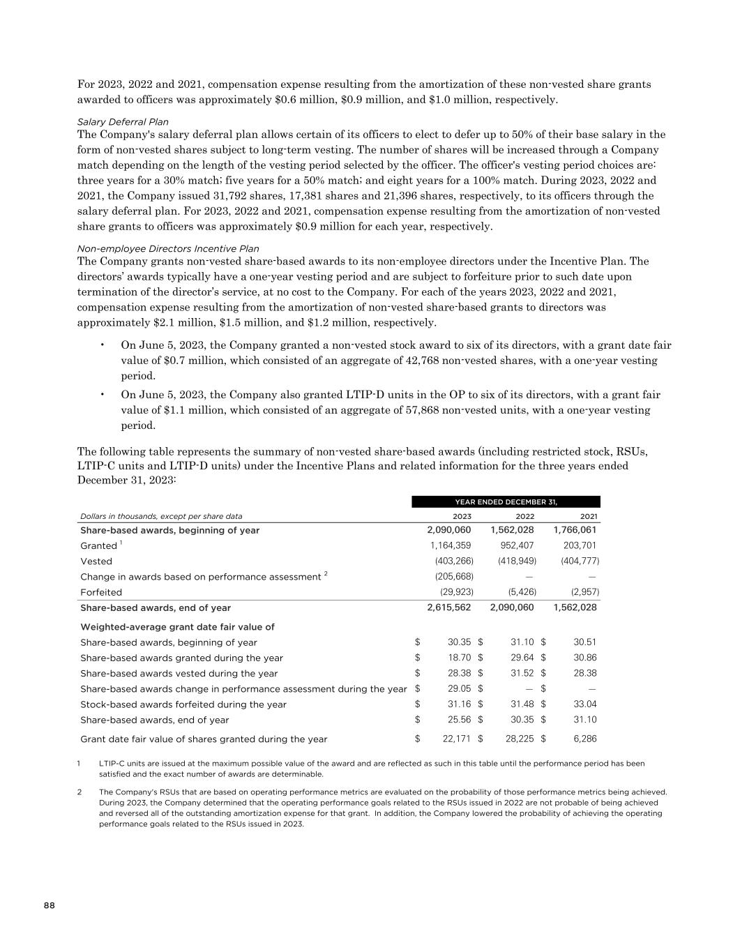 For 2023, 2022 and 2021, compensation expense resulting from the amortization of these non-vested share grants awarded to officers was approximately $0.6 million, $0.9 million, and $1.0 million, respectively. Salary Deferral Plan The Company's salary deferral plan allows certain of its officers to elect to defer up to 50% of their base salary in the form of non-vested shares subject to long-term vesting. The number of shares will be increased through a Company match depending on the length of the vesting period selected by the officer. The officer's vesting period choices are: three years for a 30% match; five years for a 50% match; and eight years for a 100% match. During 2023, 2022 and 2021, the Company issued 31,792 shares, 17,381 shares and 21,396 shares, respectively, to its officers through the salary deferral plan. For 2023, 2022 and 2021, compensation expense resulting from the amortization of non-vested share grants to officers was approximately $0.9 million for each year, respectively. Non-employee Directors Incentive Plan The Company grants non-vested share-based awards to its non-employee directors under the Incentive Plan. The directors’ awards typically have a one-year vesting period and are subject to forfeiture prior to such date upon termination of the director’s service, at no cost to the Company. For each of the years 2023, 2022 and 2021, compensation expense resulting from the amortization of non-vested share-based grants to directors was approximately $2.1 million, $1.5 million, and $1.2 million, respectively. • On June 5, 2023, the Company granted a non-vested stock award to six of its directors, with a grant date fair value of $0.7 million, which consisted of an aggregate of 42,768 non-vested shares, with a one-year vesting period. • On June 5, 2023, the Company also granted LTIP-D units in the OP to six of its directors, with a grant fair value of $1.1 million, which consisted of an aggregate of 57,868 non-vested units, with a one-year vesting period. The following table represents the summary of non-vested share-based awards (including restricted stock, RSUs, LTIP-C units and LTIP-D units) under the Incentive Plans and related information for the three years ended December 31, 2023: YEAR ENDED DECEMBER 31, Dollars in thousands, except per share data 2023 2022 2021 Share-based awards, beginning of year 2,090,060 1,562,028 1,766,061 Granted 1 1,164,359 952,407 203,701 Vested (403,266) (418,949) (404,777) Change in awards based on performance assessment 2 (205,668) — — Forfeited (29,923) (5,426) (2,957) Share-based awards, end of year 2,615,562 2,090,060 1,562,028 Weighted-average grant date fair value of Share-based awards, beginning of year $ 30.35 $ 31.10 $ 30.51 Share-based awards granted during the year $ 18.70 $ 29.64 $ 30.86 Share-based awards vested during the year $ 28.38 $ 31.52 $ 28.38 Share-based awards change in performance assessment during the year $ 29.05 $ — $ — Stock-based awards forfeited during the year $ 31.16 $ 31.48 $ 33.04 Share-based awards, end of year $ 25.56 $ 30.35 $ 31.10 Grant date fair value of shares granted during the year $ 22,171 $ 28,225 $ 6,286 1 LTIP-C units are issued at the maximum possible value of the award and are reflected as such in this table until the performance period has been satisfied and the exact number of awards are determinable. 2 The Company's RSUs that are based on operating performance metrics are evaluated on the probability of those performance metrics being achieved. During 2023, the Company determined that the operating performance goals related to the RSUs issued in 2022 are not probable of being achieved and reversed all of the outstanding amortization expense for that grant. In addition, the Company lowered the probability of achieving the operating performance goals related to the RSUs issued in 2023. 88
