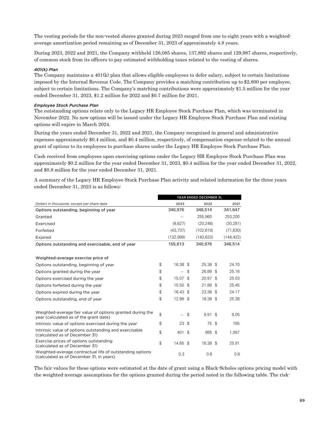 For 2023, 2022 and 2021, compensation expense resulting from the amortization of these non-vested share grants awarded to officers was approximately $0.6 million, $0.9 million, and $1.0 million, respectively. Salary Deferral Plan The Company's salary deferral plan allows certain of its officers to elect to defer up to 50% of their base salary in the form of non-vested shares subject to long-term vesting. The number of shares will be increased through a Company match depending on the length of the vesting period selected by the officer. The officer's vesting period choices are: three years for a 30% match; five years for a 50% match; and eight years for a 100% match. During 2023, 2022 and 2021, the Company issued 31,792 shares, 17,381 shares and 21,396 shares, respectively, to its officers through the salary deferral plan. For 2023, 2022 and 2021, compensation expense resulting from the amortization of non-vested share grants to officers was approximately $0.9 million for each year, respectively. Non-employee Directors Incentive Plan The Company grants non-vested share-based awards to its non-employee directors under the Incentive Plan. The directors’ awards typically have a one-year vesting period and are subject to forfeiture prior to such date upon termination of the director’s service, at no cost to the Company. For each of the years 2023, 2022 and 2021, compensation expense resulting from the amortization of non-vested share-based grants to directors was approximately $2.1 million, $1.5 million, and $1.2 million, respectively. • On June 5, 2023, the Company granted a non-vested stock award to six of its directors, with a grant date fair value of $0.7 million, which consisted of an aggregate of 42,768 non-vested shares, with a one-year vesting period. • On June 5, 2023, the Company also granted LTIP-D units in the OP to six of its directors, with a grant fair value of $1.1 million, which consisted of an aggregate of 57,868 non-vested units, with a one-year vesting period. The following table represents the summary of non-vested share-based awards (including restricted stock, RSUs, LTIP-C units and LTIP-D units) under the Incentive Plans and related information for the three years ended December 31, 2023: YEAR ENDED DECEMBER 31, Dollars in thousands, except per share data 2023 2022 2021 Share-based awards, beginning of year 2,090,060 1,562,028 1,766,061 Granted 1 1,164,359 952,407 203,701 Vested (403,266) (418,949) (404,777) Change in awards based on performance assessment 2 (205,668) — — Forfeited (29,923) (5,426) (2,957) Share-based awards, end of year 2,615,562 2,090,060 1,562,028 Weighted-average grant date fair value of Share-based awards, beginning of year $ 30.35 $ 31.10 $ 30.51 Share-based awards granted during the year $ 18.70 $ 29.64 $ 30.86 Share-based awards vested during the year $ 28.38 $ 31.52 $ 28.38 Share-based awards change in performance assessment during the year $ 29.05 $ — $ — Stock-based awards forfeited during the year $ 31.16 $ 31.48 $ 33.04 Share-based awards, end of year $ 25.56 $ 30.35 $ 31.10 Grant date fair value of shares granted during the year $ 22,171 $ 28,225 $ 6,286 1 LTIP-C units are issued at the maximum possible value of the award and are reflected as such in this table until the performance period has been satisfied and the exact number of awards are determinable. 2 The Company's RSUs that are based on operating performance metrics are evaluated on the probability of those performance metrics being achieved. During 2023, the Company determined that the operating performance goals related to the RSUs issued in 2022 are not probable of being achieved and reversed all of the outstanding amortization expense for that grant. In addition, the Company lowered the probability of achieving the operating performance goals related to the RSUs issued in 2023. The vesting periods for the non-vested shares granted during 2023 ranged from one to eight years with a weighted- average amortization period remaining as of December 31, 2023 of approximately 4.8 years. During 2023, 2022 and 2021, the Company withheld 126,085 shares, 137,892 shares and 129,987 shares, respectively, of common stock from its officers to pay estimated withholding taxes related to the vesting of shares. 401(k) Plan The Company maintains a 401(k) plan that allows eligible employees to defer salary, subject to certain limitations imposed by the Internal Revenue Code. The Company provides a matching contribution up to $2,800 per employee, subject to certain limitations. The Company’s matching contributions were approximately $1.5 million for the year ended December 31, 2023, $1.2 million for 2022 and $0.7 million for 2021. Employee Stock Purchase Plan The outstanding options relate only to the Legacy HR Employee Stock Purchase Plan, which was terminated in November 2022. No new options will be issued under the Legacy HR Employee Stock Purchase Plan and existing options will expire in March 2024. During the years ended December 31, 2022 and 2021, the Company recognized in general and administrative expenses approximately $0.4 million, and $0.4 million, respectively, of compensation expense related to the annual grant of options to its employees to purchase shares under the Legacy HR Employee Stock Purchase Plan. Cash received from employees upon exercising options under the Legacy HR Employee Stock Purchase Plan was approximately $0.2 million for the year ended December 31, 2023, $0.4 million for the year ended December 31, 2022, and $0.8 million for the year ended December 31, 2021. A summary of the Legacy HR Employee Stock Purchase Plan activity and related information for the three years ended December 31, 2023 is as follows: YEAR ENDED DECEMBER 31, Dollars in thousands, except per share data 2023 2022 2021 Options outstanding, beginning of year 340,976 348,514 341,647 Granted — 255,960 253,200 Exercised (8,627) (20,246) (30,281) Forfeited (43,737) (102,619) (71,630) Exp