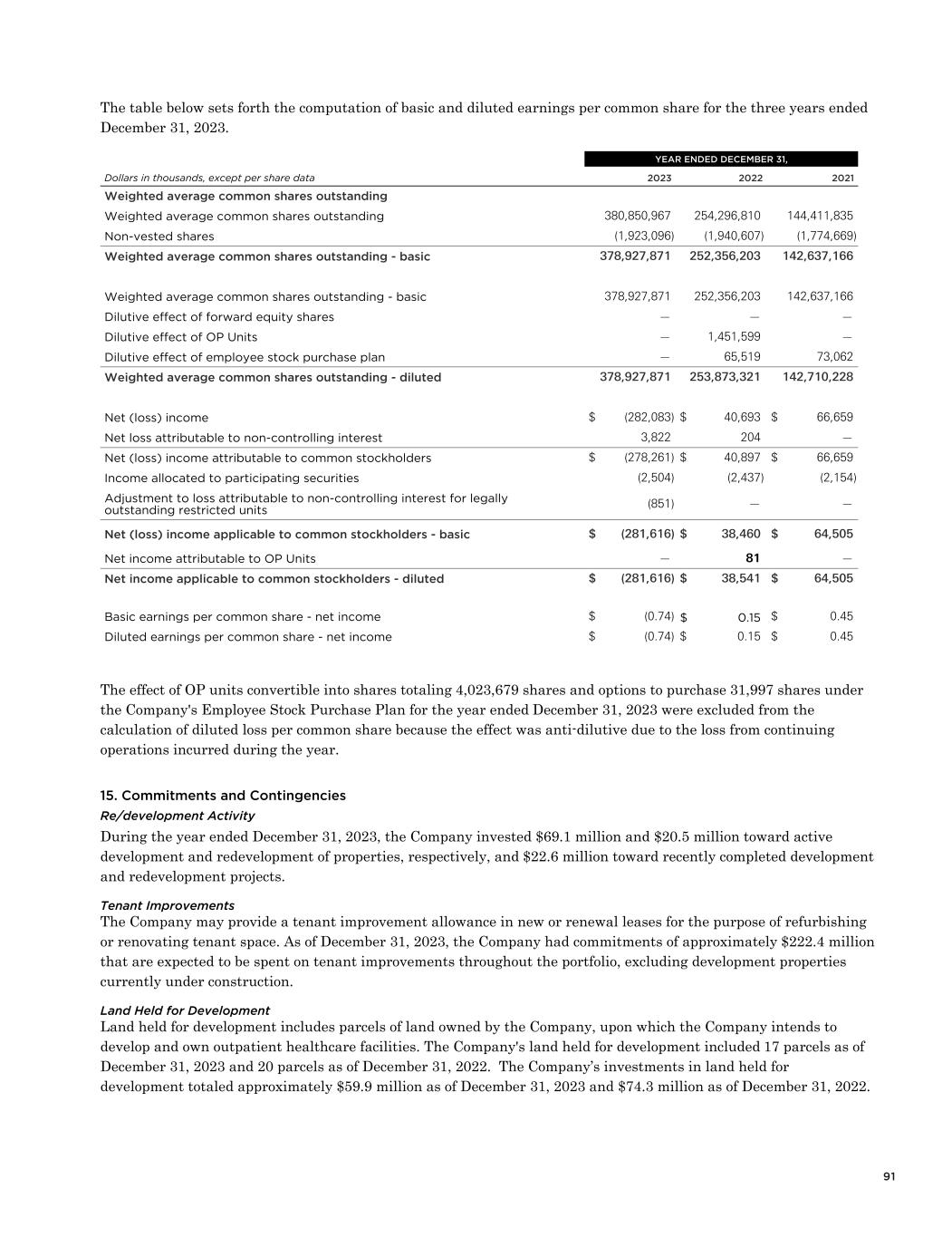 free interest rate was based on the U.S. Treasury constant maturity-nominal two-year rate whose maturity is nearest to the date of the expiration of the latest option outstanding and exercisable; the expected dividend yield was based on the expected dividends of the current year as a percentage of the average stock price of the prior year; the expected life of each option was estimated using the historical exercise behavior of employees; expected volatility was based on historical volatility of the Company’s common stock; and expected forfeitures were based on historical forfeiture rates within the look-back period. 2023 2022 2021 Risk-free interest rates — % 0.73 % 0.13 % Expected dividend yields — % 3.97 % 4.11 % Expected life (in years) 0 1.44 1.43 Expected volatility — % 49.0 % 48.2 % Expected forfeiture rates — % 85 % 85 % 14. Earnings Per Share The Company uses the two-class method of computing net earnings per common shares. The Company's non-vested share-based awards are considered participating securities pursuant to the two-class method. The Company used the treasury method to determine the dilution from the forward equity agreements during the period of time prior to settlement. The number of weighted-average shares outstanding used in the computation of earnings per common share for the year ended December 31, 2021 included the effect from the assumed issuance of 0.7 million shares of common stock pursuant to the settlement of the forward equity agreements at the contractual price, less the assumed repurchase of the common stock at the average market price using the proceeds of approximately $23.1 million, adjusted for costs to borrow. For the year ended December 31, 2021, 1,682 weighted- average incremental shares of common stock were excluded from the computation of weighted-average common shares outstanding - diluted, as the impact was anti-dilutive. As of and for the year ended December 31, 2022, these forward equity agreements settled and consequently, the Company did not have any remaining shares subject to unsettled forward sale agreements. The table below sets forth the computation of basic and diluted earnings per common share for the three years ended December 31, 2023. YEAR ENDED DECEMBER 31, Dollars in thousands, except per share data 2023 2022 2021 Weighted average common shares outstanding Weighted average common shares outstanding 380,850,967 254,296,810 144,411,835 Non-vested shares (1,923,096) (1,940,607) (1,774,669) Weighted average common shares outstanding - basic 378,927,871 252,356,203 142,637,166 Weighted average common shares outstanding - basic 378,927,871 252,356,203 142,637,166 Dilutive effect of forward equity shares — — — Dilutive effect of OP Units — 1,451,599 — Dilutive effect of employee stock purchase plan — 65,519 73,062 Weighted average common shares outstanding - diluted 378,927,871 253,873,321 142,710,228 Net (loss) income $ (282,083) $ 40,693 $ 66,659 Net loss attributable to non-controlling interest 3,822 204 — Net (loss) income attributable to common stockholders $ (278,261) $ 40,897 $ 66,659 Income allocated to participating securities (2,504) (2,437) (2,154) Adjustment to loss attributable to non-controlling interest for legally outstanding restricted units (851) — — Net (loss) income applicable to common stockholders - basic $ (281,616) $ 38,460 $ 64,505 Net income attributable to OP Units — 81 — Net income applicable to common stockholders - diluted $ (281,616) $ 38,541 $ 64,505 Basic earnings per common share - net income $ (0.74) $ 0.15 $ 0.45 Diluted earnings per common share - net income $ (0.74) $ 0.15 $ 0.45 The effect of OP units convertible into shares totaling 4,023,679 shares and options to purchase 31,997 shares under the Company's Employee Stock Purchase Plan for the year ended December 31, 2023 were excluded from the calculation of diluted loss per common share because the effect was anti-dilutive due to the loss from continuing operations incurred during the year. 15. Commitments and Contingencies Re/development Activity During the year ended December 31, 2023, the Company invested $69.1 million and $20.5 million toward active development and redevelopment of properties, respectively, and $22.6 million toward recently completed development and redevelopment projects. Tenant Improvements The Company may provide a tenant improvement allowance in new or renewal leases for the purpose of refurbishing or renovating tenant space. As of December 31, 2023, the Company had commitments of approximately $222.4 million that are expected to be spent on tenant improvements throughout the portfolio, excluding development properties currently under construction. Land Held for Development Land held for development includes parcels of land owned by the Company, upon which the Company intends to develop and own outpatient healthcare facilities. The Company's land held for development included 17 parcels as of December 31, 2023 and 20 parcels as of December 31, 2022. The Company’s investments in land held for development totaled approximately $59.9 million as of December 31, 2023 and $74.3 million as of December 31, 2022. 91