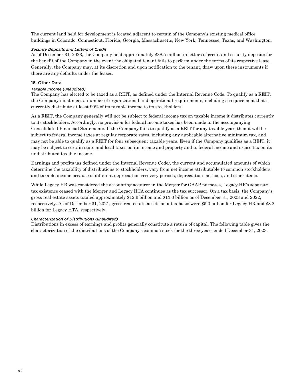 The current land held for development is located adjacent to certain of the Company's existing medical office buildings in Colorado, Connecticut, Florida, Georgia, Massachusetts, New York, Tennessee, Texas, and Washington. Security Deposits and Letters of Credit As of December 31, 2023, the Company held approximately $38.5 million in letters of credit and security deposits for the benefit of the Company in the event the obligated tenant fails to perform under the terms of its respective lease. Generally, the Company may, at its discretion and upon notification to the tenant, draw upon these instruments if there are any defaults under the leases. 16. Other Data Taxable Income (unaudited) The Company has elected to be taxed as a REIT, as defined under the Internal Revenue Code. To qualify as a REIT, the Company must meet a number of organizational and operational requirements, including a requirement that it currently distribute at least 90% of its taxable income to its stockholders. As a REIT, the Company generally will not be subject to federal income tax on taxable income it distributes currently to its stockholders. Accordingly, no provision for federal income taxes has been made in the accompanying Consolidated Financial Statements. If the Company fails to qualify as a REIT for any taxable year, then it will be subject to federal income taxes at regular corporate rates, including any applicable alternative minimum tax, and may not be able to qualify as a REIT for four subsequent taxable years. Even if the Company qualifies as a REIT, it may be subject to certain state and local taxes on its income and property and to federal income and excise tax on its undistributed taxable income. Earnings and profits (as defined under the Internal Revenue Code), the current and accumulated amounts of which determine the taxability of distributions to stockholders, vary from net income attributable to common stockholders and taxable income because of different depreciation recovery periods, depreciation methods, and other items. While Legacy HR was considered the accounting acquirer in the Merger for GAAP purposes, Legacy HR’s separate tax existence ceased with the Merger and Legacy HTA continues as the tax successor. On a tax basis, the Company’s gross real estate assets totaled approximately $12.6 billion and $13.0 billion as of December 31, 2023 and 2022, respectively. As of December 31, 2021, gross real estate assets on a tax basis were $5.0 billion for Legacy HR and $8.2 billion for Legacy HTA, respectively. Characterization of Distributions (unaudited) Distributions in excess of earnings and profits generally constitute a return of capital. The following table gives the characterization of the distributions of the Company’s common stock for the three years ended December 31, 2023. 92