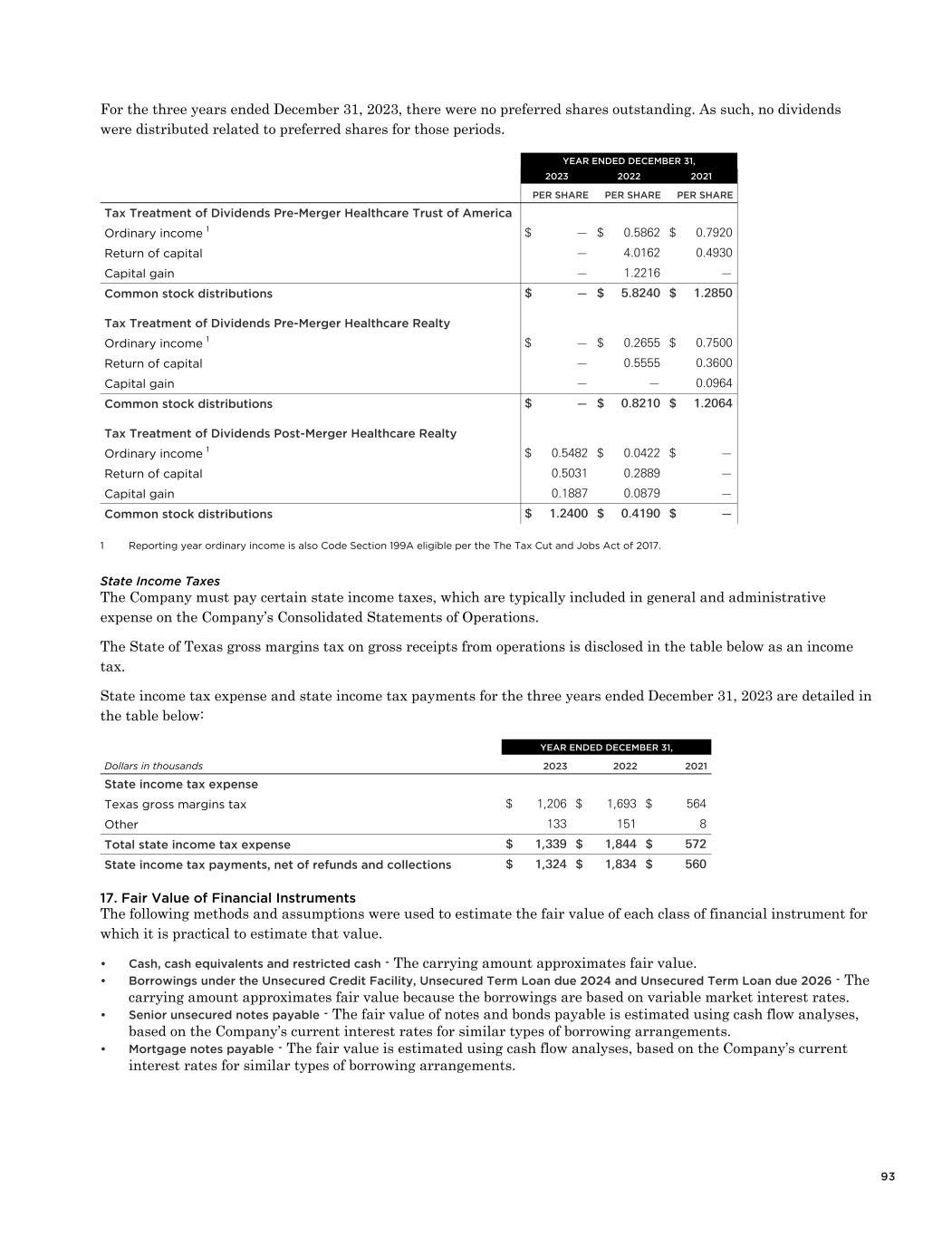 The current land held for development is located adjacent to certain of the Company's existing medical office buildings in Colorado, Connecticut, Florida, Georgia, Massachusetts, New York, Tennessee, Texas, and Washington. Security Deposits and Letters of Credit As of December 31, 2023, the Company held approximately $38.5 million in letters of credit and security deposits for the benefit of the Company in the event the obligated tenant fails to perform under the terms of its respective lease. Generally, the Company may, at its discretion and upon notification to the tenant, draw upon these instruments if there are any defaults under the leases. 16. Other Data Taxable Income (unaudited) The Company has elected to be taxed as a REIT, as defined under the Internal Revenue Code. To qualify as a REIT, the Company must meet a number of organizational and operational requirements, including a requirement that it currently distribute at least 90% of its taxable income to its stockholders. As a REIT, the Company generally will not be subject to federal income tax on taxable income it distributes currently to its stockholders. Accordingly, no provision for federal income taxes has been made in the accompanying Consolidated Financial Statements. If the Company fails to qualify as a REIT for any taxable year, then it will be subject to federal income taxes at regular corporate rates, including any applicable alternative minimum tax, and may not be able to qualify as a REIT for four subsequent taxable years. Even if the Company qualifies as a REIT, it may be subject to certain state and local taxes on its income and property and to federal income and excise tax on its undistributed taxable income. Earnings and profits (as defined under the Internal Revenue Code), the current and accumulated amounts of which determine the taxability of distributions to stockholders, vary from net income attributable to common stockholders and taxable income because of different depreciation recovery periods, depreciation methods, and other items. While Legacy HR was considered the accounting acquirer in the Merger for GAAP purposes, Legacy HR’s separate tax existence ceased with the Merger and Legacy HTA continues as the tax successor. On a tax basis, the Company’s gross real estate assets totaled approximately $12.6 billion and $13.0 billion as of December 31, 2023 and 2022, respectively. As of December 31, 2021, gross real estate assets on a tax basis were $5.0 billion for Legacy HR and $8.2 billion for Legacy HTA, respectively. Characterization of Distributions (unaudited) Distributions in excess of earnings and profits generally constitute a return of capital. The following table gives the characterization of the distributions of the Company’s common stock for the three years ended December 31, 2023. For the three years ended December 31, 2023, there were no preferred shares outstanding. As such, no dividends were distributed related to preferred shares for those periods. YEAR ENDED DECEMBER 31, 2023 2022 2021 PER SHARE PER SHARE PER SHARE Tax Treatment of Dividends Pre-Merger Healthcare Trust of America Ordinary income 1 $ — $ 0.5862 $ 0.7920 Return of capital — 4.0162 0.4930 Capital gain — 1.2216 — Common stock distributions $ — $ 5.8240 $ 1.2850 Tax Treatment of Dividends Pre-Merger Healthcare Realty Ordinary income 1 $ — $ 0.2655 $ 0.7500 Return of capital — 0.5555 0.3600 Capital gain — — 0.0964 Common stock distributions $ — $ 0.8210 $ 1.2064 Tax Treatment of Dividends Post-Merger Healthcare Realty Ordinary income 1 $ 0.5482 $ 0.0422 $ — Return of capital 0.5031 0.2889 — Capital gain 0.1887 0.0879 — Common stock distributions $ 1.2400 $ 0.4190 $ — 1 Reporting year ordinary income is also Code Section 199A eligible per the The Tax Cut and Jobs Act of 2017. State Income Taxes The Company must pay certain state income taxes, which are typically included in general and administrative expense on the Company’s Consolidated Statements of Operations. The State of Texas gross margins tax on gross receipts from operations is disclosed in the table below as an income tax. State income tax expense and state income tax payments for the three years ended December 31, 2023 are detailed in the table below: YEAR ENDED DECEMBER 31, Dollars in thousands 2023 2022 2021 State income tax expense Texas gross margins tax $ 1,206 $ 1,693 $ 564 Other 133 151 8 Total state income tax expense $ 1,339 $ 1,844 $ 572 State income tax payments, net of refunds and collections $ 1,324 $ 1,834 $ 560 17. Fair Value of Financial Instruments The following methods and assumptions were used to estimate the fair value of each class of financial instrument for which it is practical to estimate that value. • Cash, cash equivalents and restricted cash - The carrying amount approximates fair value. • Borrowings under the Unsecured Credit Facility, Unsecured Term Loan due 2024 and Unsecured Term Loan due 2026 - The carrying amount approximates fair value because the borrowings are based on variable market interest rates. • Senior unsecured notes payable - The fair value of notes and bonds payable is estimated using cash flow analyses, based on the Company’s current interest rates for similar types of borrowing arrangements. • Mortgage notes payable - The fair value is estimated using cash flow analyses, based on the Company’s current interest rates for similar types of borrowing arrangements. 93