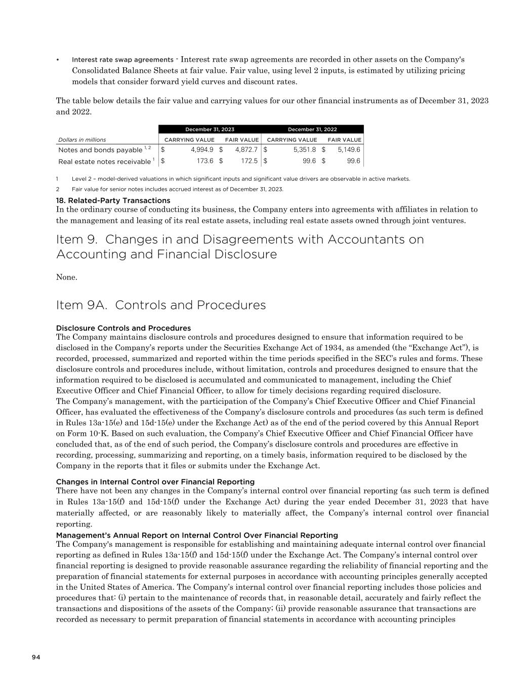 • Interest rate swap agreements - Interest rate swap agreements are recorded in other assets on the Company's Consolidated Balance Sheets at fair value. Fair value, using level 2 inputs, is estimated by utilizing pricing models that consider forward yield curves and discount rates. The table below details the fair value and carrying values for our other financial instruments as of December 31, 2023 and 2022. December 31, 2023 December 31, 2022 Dollars in millions CARRYING VALUE FAIR VALUE CARRYING VALUE FAIR VALUE Notes and bonds payable 1, 2 $ 4,994.9 $ 4,872.7 $ 5,351.8 $ 5,149.6 Real estate notes receivable 1 $ 173.6 $ 172.5 $ 99.6 $ 99.6 1 Level 2 – model-derived valuations in which significant inputs and significant value drivers are observable in active markets. 2 Fair value for senior notes includes accrued interest as of December 31, 2023. 18. Related-Party Transactions In the ordinary course of conducting its business, the Company enters into agreements with affiliates in relation to the management and leasing of its real estate assets, including real estate assets owned through joint ventures. Item 9. Changes in and Disagreements with Accountants on Accounting and Financial Disclosure None. Item 9A. Controls and Procedures Disclosure Controls and Procedures The Company maintains disclosure controls and procedures designed to ensure that information required to be disclosed in the Company’s reports under the Securities Exchange Act of 1934, as amended (the “Exchange Act”), is recorded, processed, summarized and reported within the time periods specified in the SEC’s rules and forms. These disclosure controls and procedures include, without limitation, controls and procedures designed to ensure that the information required to be disclosed is accumulated and communicated to management, including the Chief Executive Officer and Chief Financial Officer, to allow for timely decisions regarding required disclosure. The Company’s management, with the participation of the Company’s Chief Executive Officer and Chief Financial Officer, has evaluated the effectiveness of the Company’s disclosure controls and procedures (as such term is defined in Rules 13a-15(e) and 15d-15(e) under the Exchange Act) as of the end of the period covered by this Annual Report on Form 10-K. Based on such evaluation, the Company’s Chief Executive Officer and Chief Financial Officer have concluded that, as of the end of such period, the Company’s disclosure controls and procedures are effective in recording, processing, summarizing and reporting, on a timely basis, information required to be disclosed by the Company in the reports that it files or submits under the Exchange Act. Changes in Internal Control over Financial Reporting There have not been any changes in the Company’s internal control over financial reporting (as such term is defined in Rules 13a-15(f) and 15d-15(f) under the Exchange Act) during the year ended December 31, 2023 that have materially affected, or are reasonably likely to materially affect, the Company’s internal control over financial reporting. Management’s Annual Report on Internal Control Over Financial Reporting The Company's management is responsible for establishing and maintaining adequate internal control over financial reporting as defined in Rules 13a-15(f) and 15d-15(f) under the Exchange Act. The Company’s internal control over financial reporting is designed to provide reasonable assurance regarding the reliability of financial reporting and the preparation of financial statements for external purposes in accordance with accounting principles generally accepted in the United States of America. The Company’s internal control over financial reporting includes those policies and procedures that: (i) pertain to the maintenance of records that, in reasonable detail, accurately and fairly reflect the transactions and dispositions of the assets of the Company; (ii) provide reasonable assurance that transactions are recorded as necessary to permit preparation of financial statements in accordance with accounting principles 94