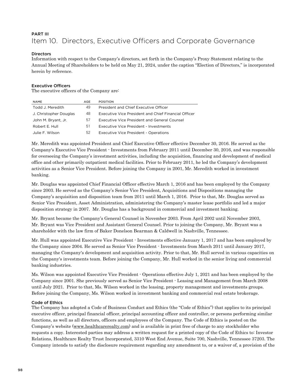 PART III Item 10. Directors, Executive Officers and Corporate Governance Directors Information with respect to the Company’s directors, set forth in the Company’s Proxy Statement relating to the Annual Meeting of Shareholders to be held on May 21, 2024, under the caption “Election of Directors,” is incorporated herein by reference. Executive Officers The executive officers of the Company are: NAME AGE POSITION Todd J. Meredith 49 President and Chief Executive Officer J. Christopher Douglas 48 Executive Vice President and Chief Financial Officer John M. Bryant, Jr. 57 Executive Vice President and General Counsel Robert E. Hull 51 Executive Vice President - Investments Julie F. Wilson 52 Executive Vice President - Operations Mr. Meredith was appointed President and Chief Executive Officer effective December 30, 2016. He served as the Company's Executive Vice President - Investments from February 2011 until December 30, 2016, and was responsible for overseeing the Company’s investment activities, including the acquisition, financing and development of medical office and other primarily outpatient medical facilities. Prior to February 2011, he led the Company’s development activities as a Senior Vice President. Before joining the Company in 2001, Mr. Meredith worked in investment banking. Mr. Douglas was appointed Chief Financial Officer effective March 1, 2016 and has been employed by the Company since 2003. He served as the Company’s Senior Vice President, Acquisitions and Dispositions managing the Company’s acquisition and disposition team from 2011 until March 1, 2016. Prior to that, Mr. Douglas served as Senior Vice President, Asset Administration, administering the Company’s master lease portfolio and led a major disposition strategy in 2007. Mr. Douglas has a background in commercial and investment banking. Mr. Bryant became the Company’s General Counsel in November 2003. From April 2002 until November 2003, Mr. Bryant was Vice President and Assistant General Counsel. Prior to joining the Company, Mr. Bryant was a shareholder with the law firm of Baker Donelson Bearman & Caldwell in Nashville, Tennessee. Mr. Hull was appointed Executive Vice President - Investments effective January 1, 2017 and has been employed by the Company since 2004. He served as Senior Vice President - Investments from March 2011 until January 2017, managing the Company's development and acquisition activity. Prior to that, Mr. Hull served in various capacities on the Company's investments team. Before joining the Company, Mr. Hull worked in the senior living and commercial banking industries. Ms. Wilson was appointed Executive Vice President - Operations effective July 1, 2021 and has been employed by the Company since 2001. She previously served as Senior Vice President - Leasing and Management from March 2008 until July 2021. Prior to that, Ms. Wilson worked in the leasing, property management and investments groups. Before joining the Company, Ms. Wilson worked in investment banking and commercial real estate brokerage. Code of Ethics The Company has adopted a Code of Business Conduct and Ethics (the “Code of Ethics”) that applies to its principal executive officer, principal financial officer, principal accounting officer and controller, or persons performing similar functions, as well as all directors, officers and employees of the Company. The Code of Ethics is posted on the Company’s website (www.healthcarerealty.com) and is available in print free of charge to any stockholder who requests a copy. Interested parties may address a written request for a printed copy of the Code of Ethics to: Investor Relations, Healthcare Realty Trust Incorporated, 3310 West End Avenue, Suite 700, Nashville, Tennessee 37203. The Company intends to satisfy the disclosure requirement regarding any amendment to, or a waiver of, a provision of the 98