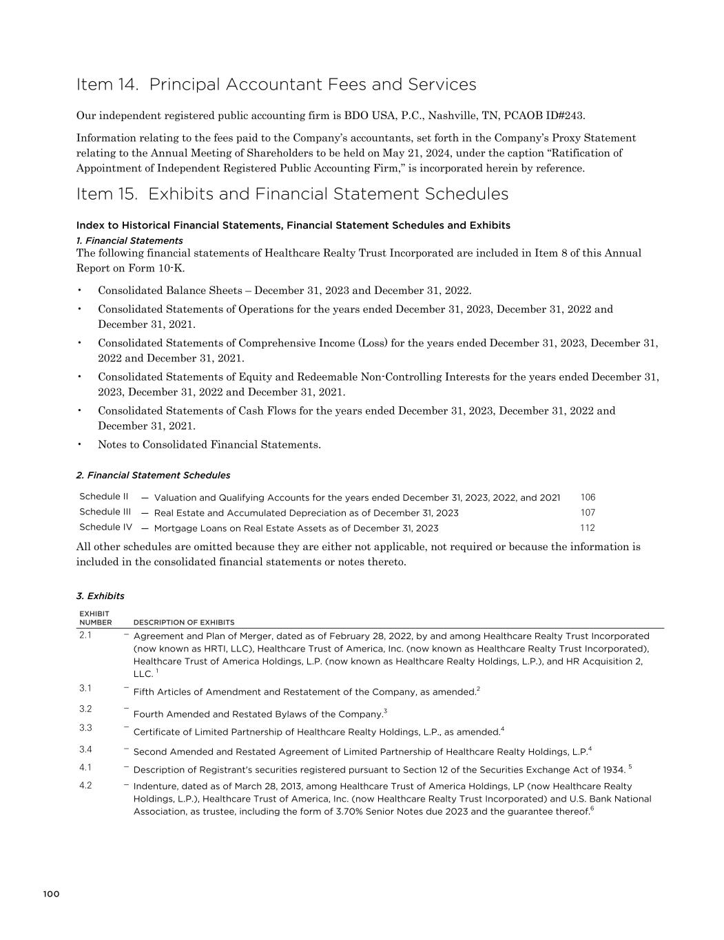 Item 14. Principal Accountant Fees and Services Our independent registered public accounting firm is BDO USA, P.C., Nashville, TN, PCAOB ID#243. Information relating to the fees paid to the Company’s accountants, set forth in the Company’s Proxy Statement relating to the Annual Meeting of Shareholders to be held on May 21, 2024, under the caption “Ratification of Appointment of Independent Registered Public Accounting Firm,” is incorporated herein by reference. Item 15. Exhibits and Financial Statement Schedules Index to Historical Financial Statements, Financial Statement Schedules and Exhibits 1. Financial Statements The following financial statements of Healthcare Realty Trust Incorporated are included in Item 8 of this Annual Report on Form 10-K. • Consolidated Balance Sheets – December 31, 2023 and December 31, 2022. • Consolidated Statements of Operations for the years ended December 31, 2023, December 31, 2022 and December 31, 2021. • Consolidated Statements of Comprehensive Income (Loss) for the years ended December 31, 2023, December 31, 2022 and December 31, 2021. • Consolidated Statements of Equity and Redeemable Non-Controlling Interests for the years ended December 31, 2023, December 31, 2022 and December 31, 2021. • Consolidated Statements of Cash Flows for the years ended December 31, 2023, December 31, 2022 and December 31, 2021. • Notes to Consolidated Financial Statements. 2. Financial Statement Schedules Schedule II — Valuation and Qualifying Accounts for the years ended December 31, 2023, 2022, and 2021 106 Schedule III — Real Estate and Accumulated Depreciation as of December 31, 2023 107 Schedule IV — Mortgage Loans on Real Estate Assets as of December 31, 2023 112 All other schedules are omitted because they are either not applicable, not required or because the information is included in the consolidated financial statements or notes thereto. 3. Exhibits EXHIBIT NUMBER DESCRIPTION OF EXHIBITS 2.1 — Agreement and Plan of Merger, dated as of February 28, 2022, by and among Healthcare Realty Trust Incorporated (now known as HRTI, LLC), Healthcare Trust of America, Inc. (now known as Healthcare Realty Trust Incorporated), Healthcare Trust of America Holdings, L.P. (now known as Healthcare Realty Holdings, L.P.), and HR Acquisition 2, LLC. 1 3.1 — Fifth Articles of Amendment and Restatement of the Company, as amended.2 3.2 — Fourth Amended and Restated Bylaws of the Company.3 3.3 — Certificate of Limited Partnership of Healthcare Realty Holdings, L.P., as amended.4 3.4 — Second Amended and Restated Agreement of Limited Partnership of Healthcare Realty Holdings, L.P.4 4.1 — Description of Registrant's securities registered pursuant to Section 12 of the Securities Exchange Act of 1934. 5 4.2 — Indenture, dated as of March 28, 2013, among Healthcare Trust of America Holdings, LP (now Healthcare Realty Holdings, L.P.), Healthcare Trust of America, Inc. (now Healthcare Realty Trust Incorporated) and U.S. Bank National Association, as trustee, including the form of 3.70% Senior Notes due 2023 and the guarantee thereof.6 100