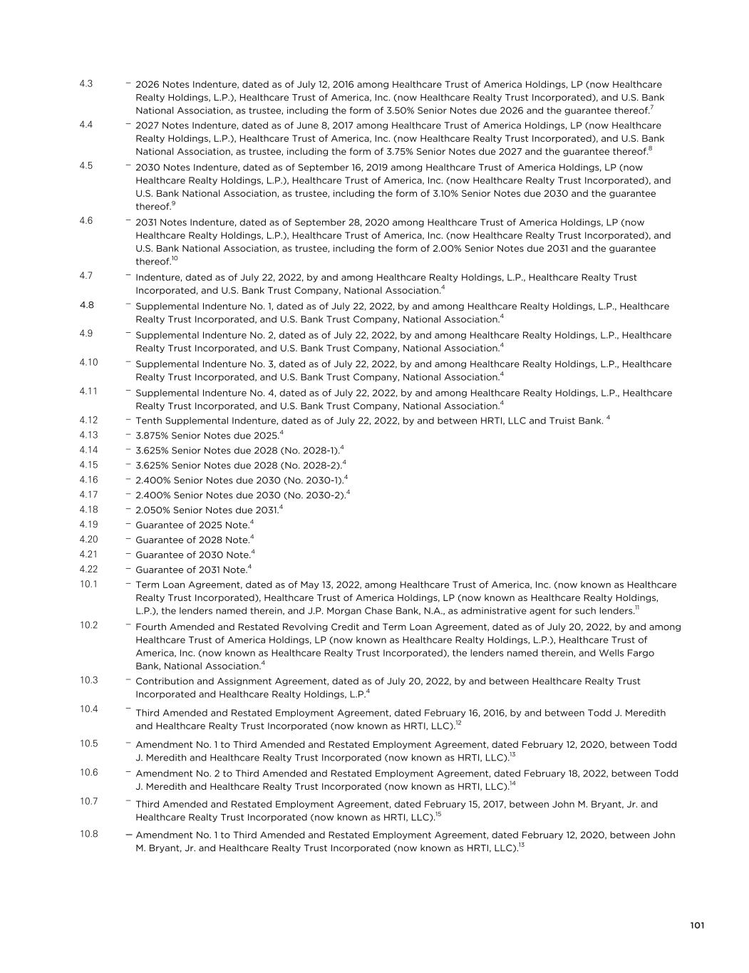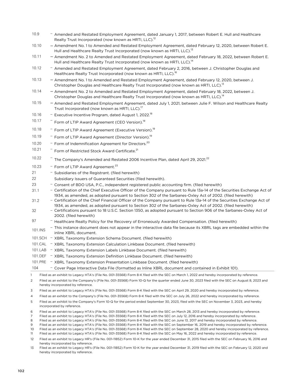 10.9 — Amended and Restated Employment Agreement, dated January 1, 2017, between Robert E. Hull and Healthcare Realty Trust Incorporated (now known as HRTI, LLC).12 10.10 — Amendment No. 1 to Amended and Restated Employment Agreement, dated February 12, 2020, between Robert E. Hull and Healthcare Realty Trust Incorporated (now known as HRTI, LLC).13 10.11 — Amendment No. 2 to Amended and Restated Employment Agreement, dated February 18, 2022, between Robert E. Hull and Healthcare Realty Trust Incorporated (now known as HRTI, LLC).14 10.12 — Amended and Restated Employment Agreement, dated February 2, 2016, between J. Christopher Douglas and Healthcare Realty Trust Incorporated (now known as HRTI, LLC).16 10.13 — Amendment No. 1 to Amended and Restated Employment Agreement, dated February 12, 2020, between J. Christopher Douglas and Healthcare Realty Trust Incorporated (now known as HRTI, LLC).13 10.14 — Amendment No. 2 to Amended and Restated Employment Agreement, dated February 18, 2022, between J. Christopher Douglas and Healthcare Realty Trust Incorporated (now known as HRTI, LLC).14 10.15 — Amended and Restated Employment Agreement, dated July 1, 2021, between Julie F. Wilson and Healthcare Realty Trust Incorporated (now known as HRTI, LLC).17 10.16 — Executive Incentive Program, dated August 1, 2022.18 10.17 — Form of LTIP Award Agreement (CEO Version).19 10.18 — Form of LTIP Award Agreement (Executive Version).19 10.19 — Form of LTIP Award Agreement (Director Version).19 10.20 — Form of Indemnification Agreement for Directors.20 10.21 — Form of Restricted Stock Award Certificate.21 10.22 — The Company's Amended and Restated 2006 Incentive Plan, dated April 29, 2021.22 10.23 — Form of LTIP Award Agreement.23 21 — Subsidiaries of the Registrant. (filed herewith) 22 Subsidiary Issuers of Guaranteed Securities (filed herewith). 23 — Consent of BDO USA, P.C., independent registered public accounting firm. (filed herewith) 31.1 — Certification of the Chief Executive Officer of the Company pursuant to Rule 13a-14 of the Securities Exchange Act of 1934, as amended, as adopted pursuant to Section 302 of the Sarbanes-Oxley Act of 2002. (filed herewith) 31.2 — Certification of the Chief Financial Officer of the Company pursuant to Rule 13a-14 of the Securities Exchange Act of 1934, as amended, as adopted pursuant to Section 302 of the Sarbanes-Oxley Act of 2002. (filed herewith) 32 — Certifications pursuant to 18 U.S.C. Section 1350, as adopted pursuant to Section 906 of the Sarbanes-Oxley Act of 2002. (filed herewith) 97 — Healthcare Realty Policy for the Recovery of Erroneously Awarded Compensation. (filed herewith) 101.INS — This instance document does not appear in the interactive data file because its XBRL tags are embedded within the inline XBRL document. 101.SCH — XBRL Taxonomy Extension Schema Document. (filed herewith) 101.CAL — XBRL Taxonomy Extension Calculation Linkbase Document. (filed herewith) 101.LAB — XBRL Taxonomy Extension Labels Linkbase Document. (filed herewith) 101.DEF — XBRL Taxonomy Extension Definition Linkbase Document. (filed herewith) 101.PRE — XBRL Taxonomy Extension Presentation Linkbase Document. (filed herewith) 104 — Cover Page Interactive Data File (formatted as Inline XBRL document and contained in Exhibit 101). 1 Filed as an exhibit to Legacy HTA’s (File No. 001-35568) Form 8-K filed with the SEC on March 1, 2022 and hereby incorporated by reference. 2 Filed as an exhibit to the Company's (File No. 001-35568) Form 10-Q for the quarter ended June 30, 2023 filed with the SEC on August 8, 2023 and hereby incorporated by reference. 3 Filed as an exhibit to Legacy HTA's (File No. 001-35568) Form 8-K filed with the SEC on April 29, 2020 and hereby incorporated by reference. 4 Filed as an exhibit to the Company's (File No. 001-35568) Form 8-K filed with the SEC on July 26, 2022 and hereby incorporated by reference. 5 Filed as an exhibit to the Company's Form 10-Q for the period ended September 30, 2023, filed with the SEC on November 3, 2023, and hereby incorporated by reference. 6 Filed as an exhibit to Legacy HTA's (File No. 001-35568) Form 8-K filed with the SEC on March 28, 2013 and hereby incorporated by reference. 7 Filed as an exhibit to Legacy HTA's (File No. 001-35568) Form 8-K filed with the SEC on July 12, 2016 and hereby incorporated by reference. 8 Filed as an exhibit to Legacy HTA's (File No. 001-35568) Form 8-K filed with the SEC on June 13, 2017 and hereby incorporated by reference. 9 Filed as an exhibit to Legacy HTA's (File No. 001-35568) Form 8-K filed with the SEC on September 16, 2019 and hereby incorporated by reference. 10 Filed as an exhibit to Legacy HTA's (File No. 001-35568) Form 8-K filed with the SEC on September 28, 2020 and hereby incorporated by reference. 11 Filed as an exhibit to Legacy HTA's (File No. 001-35568) Form 8-K filed with the SEC on May 16, 2022 and hereby incorporated by reference. 12 Filed as an exhibit to Legacy HR's (File No. 001-11852) Form 10-K for the year ended December 31, 2015 filed with the SEC on February 16, 2016 and hereby incorporated by reference. 13 Filed as an exhibit to Legacy HR's (File No. 001-11852) Form 10-K for the year ended December 31, 2019 filed with the SEC on February 12, 2020 and hereby incorporated by reference. 14 Filed as an exhibit to Legacy HR's (File No. 001-11852) Form 10-K for the year ended December 31, 2021 filed with the SEC on February 22, 2022 and hereby incorporated by reference. 15 Filed as an exhibit to Legacy HR's (File No. 001-11852) Form 10-K for the year ended December 31, 2016 filed with the SEC on February 15, 2017 and hereby incorporated by reference. 16 Filed as an exhibit to Legacy HR's (File No. 001-11852) Form 8-K filed with the SEC on February 2, 2016 and hereby incorporated by reference. 17 Filed as an exhibit to Legacy HR's (File No. 001-11852) Form 10-Q for the quarter ended June 30, 2021 filed with t