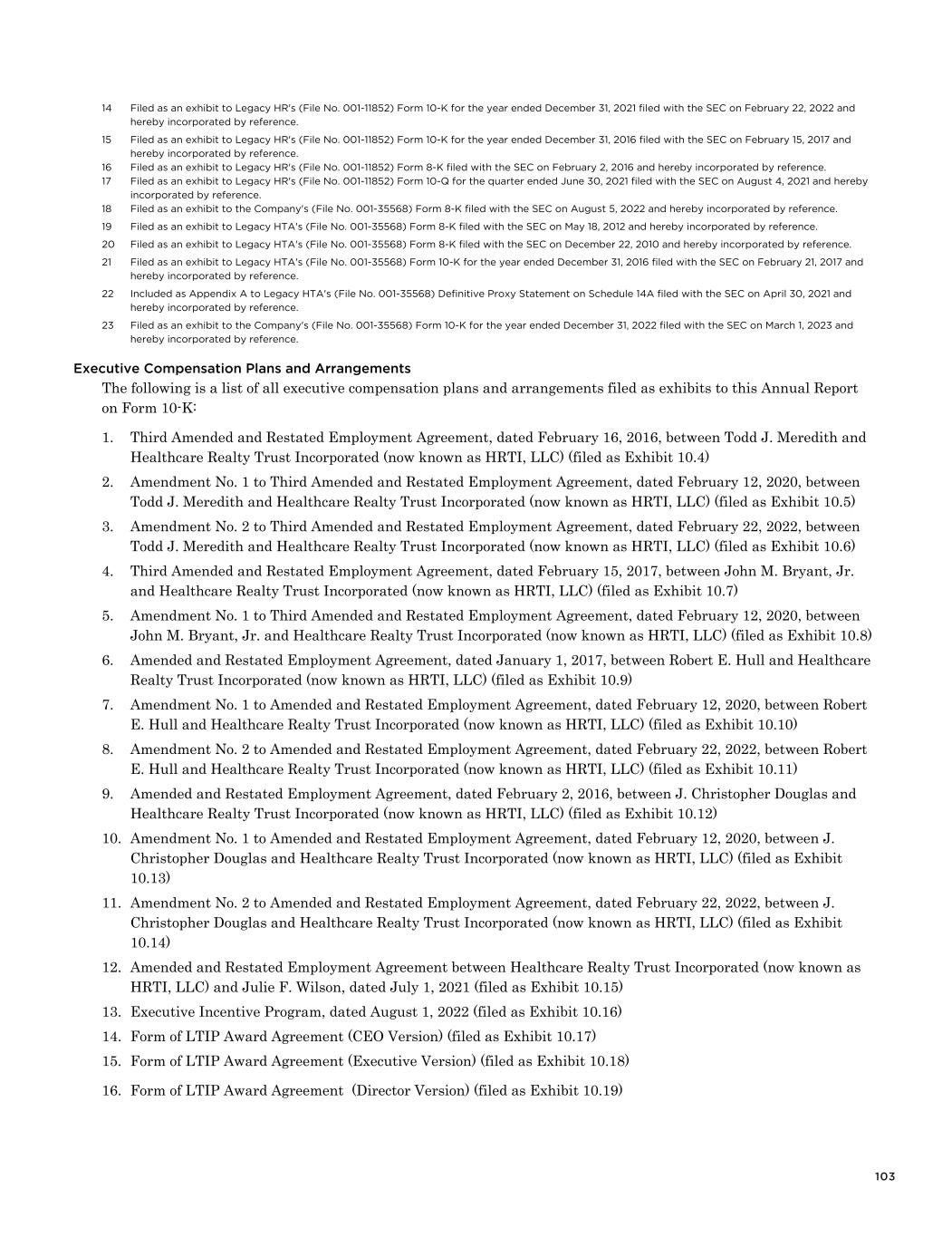 10.9 — Amended and Restated Employment Agreement, dated January 1, 2017, between Robert E. Hull and Healthcare Realty Trust Incorporated (now known as HRTI, LLC).12 10.10 — Amendment No. 1 to Amended and Restated Employment Agreement, dated February 12, 2020, between Robert E. Hull and Healthcare Realty Trust Incorporated (now known as HRTI, LLC).13 10.11 — Amendment No. 2 to Amended and Restated Employment Agreement, dated February 18, 2022, between Robert E. Hull and Healthcare Realty Trust Incorporated (now known as HRTI, LLC).14 10.12 — Amended and Restated Employment Agreement, dated February 2, 2016, between J. Christopher Douglas and Healthcare Realty Trust Incorporated (now known as HRTI, LLC).16 10.13 — Amendment No. 1 to Amended and Restated Employment Agreement, dated February 12, 2020, between J. Christopher Douglas and Healthcare Realty Trust Incorporated (now known as HRTI, LLC).13 10.14 — Amendment No. 2 to Amended and Restated Employment Agreement, dated February 18, 2022, between J. Christopher Douglas and Healthcare Realty Trust Incorporated (now known as HRTI, LLC).14 10.15 — Amended and Restated Employment Agreement, dated July 1, 2021, between Julie F. Wilson and Healthcare Realty Trust Incorporated (now known as HRTI, LLC).17 10.16 — Executive Incentive Program, dated August 1, 2022.18 10.17 — Form of LTIP Award Agreement (CEO Version).19 10.18 — Form of LTIP Award Agreement (Executive Version).19 10.19 — Form of LTIP Award Agreement (Director Version).19 10.20 — Form of Indemnification Agreement for Directors.20 10.21 — Form of Restricted Stock Award Certificate.21 10.22 — The Company's Amended and Restated 2006 Incentive Plan, dated April 29, 2021.22 10.23 — Form of LTIP Award Agreement.23 21 — Subsidiaries of the Registrant. (filed herewith) 22 Subsidiary Issuers of Guaranteed Securities (filed herewith). 23 — Consent of BDO USA, P.C., independent registered public accounting firm. (filed herewith) 31.1 — Certification of the Chief Executive Officer of the Company pursuant to Rule 13a-14 of the Securities Exchange Act of 1934, as amended, as adopted pursuant to Section 302 of the Sarbanes-Oxley Act of 2002. (filed herewith) 31.2 — Certification of the Chief Financial Officer of the Company pursuant to Rule 13a-14 of the Securities Exchange Act of 1934, as amended, as adopted pursuant to Section 302 of the Sarbanes-Oxley Act of 2002. (filed herewith) 32 — Certifications pursuant to 18 U.S.C. Section 1350, as adopted pursuant to Section 906 of the Sarbanes-Oxley Act of 2002. (filed herewith) 97 — Healthcare Realty Policy for the Recovery of Erroneously Awarded Compensation. (filed herewith) 101.INS — This instance document does not appear in the interactive data file because its XBRL tags are embedded within the inline XBRL document. 101.SCH — XBRL Taxonomy Extension Schema Document. (filed herewith) 101.CAL — XBRL Taxonomy Extension Calculation Linkbase Document. (filed herewith) 101.LAB — XBRL Taxonomy Extension Labels Linkbase Document. (filed herewith) 101.DEF — XBRL Taxonomy Extension Definition Linkbase Document. (filed herewith) 101.PRE — XBRL Taxonomy Extension Presentation Linkbase Document. (filed herewith) 104 — Cover Page Interactive Data File (formatted as Inline XBRL document and contained in Exhibit 101). 1 Filed as an exhibit to Legacy HTA’s (File No. 001-35568) Form 8-K filed with the SEC on March 1, 2022 and hereby incorporated by reference. 2 Filed as an exhibit to the Company's (File No. 001-35568) Form 10-Q for the quarter ended June 30, 2023 filed with the SEC on August 8, 2023 and hereby incorporated by reference. 3 Filed as an exhibit to Legacy HTA's (File No. 001-35568) Form 8-K filed with the SEC on April 29, 2020 and hereby incorporated by reference. 4 Filed as an exhibit to the Company's (File No. 001-35568) Form 8-K filed with the SEC on July 26, 2022 and hereby incorporated by reference. 5 Filed as an exhibit to the Company's Form 10-Q for the period ended September 30, 2023, filed with the SEC on November 3, 2023, and hereby incorporated by reference. 6 Filed as an exhibit to Legacy HTA's (File No. 001-35568) Form 8-K filed with the SEC on March 28, 2013 and hereby incorporated by reference. 7 Filed as an exhibit to Legacy HTA's (File No. 001-35568) Form 8-K filed with the SEC on July 12, 2016 and hereby incorporated by reference. 8 Filed as an exhibit to Legacy HTA's (File No. 001-35568) Form 8-K filed with the SEC on June 13, 2017 and hereby incorporated by reference. 9 Filed as an exhibit to Legacy HTA's (File No. 001-35568) Form 8-K filed with the SEC on September 16, 2019 and hereby incorporated by reference. 10 Filed as an exhibit to Legacy HTA's (File No. 001-35568) Form 8-K filed with the SEC on September 28, 2020 and hereby incorporated by reference. 11 Filed as an exhibit to Legacy HTA's (File No. 001-35568) Form 8-K filed with the SEC on May 16, 2022 and hereby incorporated by reference. 12 Filed as an exhibit to Legacy HR's (File No. 001-11852) Form 10-K for the year ended December 31, 2015 filed with the SEC on February 16, 2016 and hereby incorporated by reference. 13 Filed as an exhibit to Legacy HR's (File No. 001-11852) Form 10-K for the year ended December 31, 2019 filed with the SEC on February 12, 2020 and hereby incorporated by reference. 102