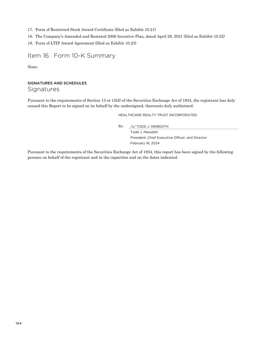 17. Form of Restricted Stock Award Certificate (filed as Exhibit 10.21) 18. The Company's Amended and Restated 2006 Incentive Plan, dated April 29, 2021 (filed as Exhibit 10.22) 19. Form of LTIP Award Agreement (filed as Exhibit 10.23) Item 16. Form 10-K Summary None. SIGNATURES AND SCHEDULES Signatures Pursuant to the requirements of Section 13 or 15(d) of the Securities Exchange Act of 1934, the registrant has duly caused this Report to be signed on its behalf by the undersigned, thereunto duly authorized. HEALTHCARE REALTY TRUST INCORPORATED By: /s/ TODD J. MEREDITH Todd J. Meredith President, Chief Executive Officer, and Director February 16, 2024 Pursuant to the requirements of the Securities Exchange Act of 1934, this report has been signed by the following persons on behalf of the registrant and in the capacities and on the dates indicated. 104