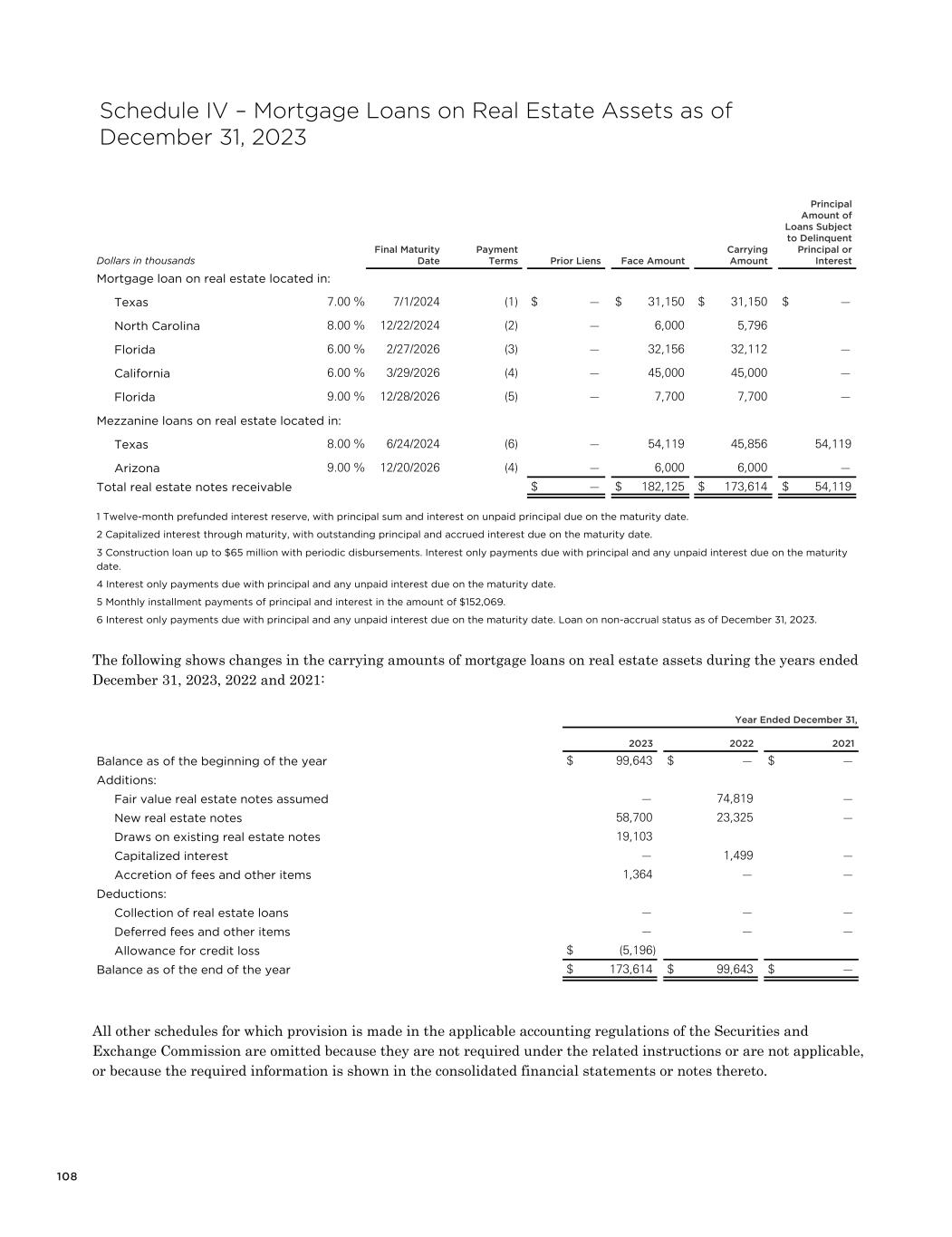 Schedule IV – Mortgage Loans on Real Estate Assets as of December 31, 2023 Dollars in thousands Final Maturity Date Payment Terms Prior Liens Face Amount Carrying Amount Principal Amount of Loans Subject to Delinquent Principal or Interest Mortgage loan on real estate located in: Texas 7.00 % 7/1/2024 (1) $ — $ 31,150 $ 31,150 $ — North Carolina 8.00 % 12/22/2024 (2) — 6,000 5,796 Florida 6.00 % 2/27/2026 (3) — 32,156 32,112 — California 6.00 % 3/29/2026 (4) — 45,000 45,000 — Florida 9.00 % 12/28/2026 (5) — 7,700 7,700 — Mezzanine loans on real estate located in: Texas 8.00 % 6/24/2024 (6) — 54,119 45,856 54,119 Arizona 9.00 % 12/20/2026 (4) — 6,000 6,000 — Total real estate notes receivable $ — $ 182,125 $ 173,614 $ 54,119 1 Twelve-month prefunded interest reserve, with principal sum and interest on unpaid principal due on the maturity date. 2 Capitalized interest through maturity, with outstanding principal and accrued interest due on the maturity date. 3 Construction loan up to $65 million with periodic disbursements. Interest only payments due with principal and any unpaid interest due on the maturity date. 4 Interest only payments due with principal and any unpaid interest due on the maturity date. 5 Monthly installment payments of principal and interest in the amount of $152,069. 6 Interest only payments due with principal and any unpaid interest due on the maturity date. Loan on non-accrual status as of December 31, 2023. The following shows changes in the carrying amounts of mortgage loans on real estate assets during the years ended December 31, 2023, 2022 and 2021: Year Ended December 31, 2023 2022 2021 Balance as of the beginning of the year $ 99,643 $ — $ — Additions: Fair value real estate notes assumed — 74,819 — New real estate notes 58,700 23,325 — Draws on existing real estate notes 19,103 Capitalized interest — 1,499 — Accretion of fees and other items 1,364 — — Deductions: Collection of real estate loans — — — Deferred fees and other items — — — Allowance for credit loss $ (5,196) Balance as of the end of the year $ 173,614 $ 99,643 $ — All other schedules for which provision is made in the applicable accounting regulations of the Securities and Exchange Commission are omitted because they are not required under the related instructions or are not applicable, or because the required information is shown in the consolidated financial statements or notes thereto. 108