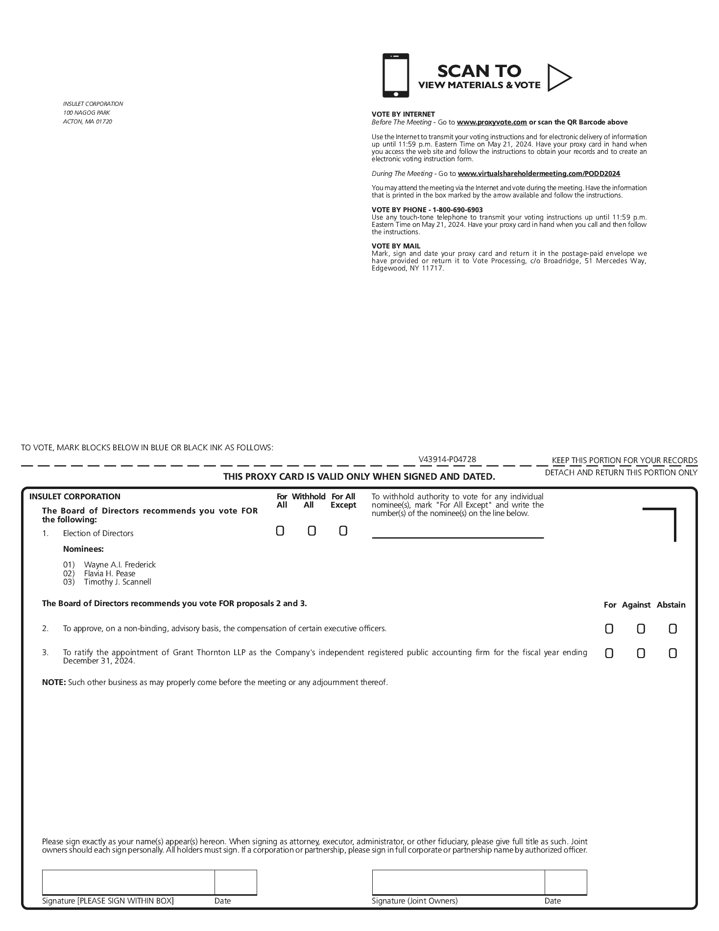 The business and affairs of the Company are managed under the direction of our Board of Directors, which currently consists of nine members. The Board has three standing committees: an Audit Committee, a Nominating, Governance and Risk Committee (the “Governance Committee”) and a Talent and Compensation Committee. Each of these committees operates under a written charter that it reviews at least annually. These charters, which have been approved by the Board, are available in the Corporate Governance section of the Company’s website at http://www.insulet.com. The Board also has an ad hoc Transactions Committee and an informal Board Strategy Working Group. Additional details concerning the role and structure of the Board of Directors are contained in the Board’s Corporate Governance Guidelines, which can be found in the Corporate Governance section of the Company’s website at http://www.insulet.com.