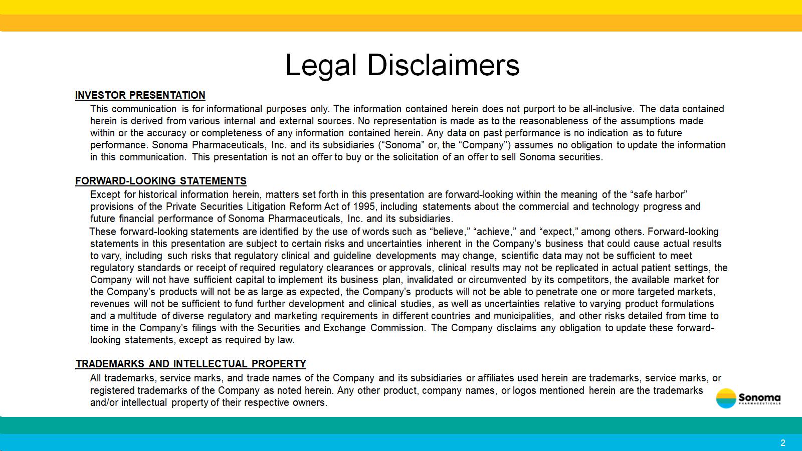 Legal Disclaimers INVESTOR PRESENTATION This communication is for informational purposes only. The information contained herein does not purport to be all - inclusive. T he data contained herein is derived from various internal and external sources. No representation is made as to the reasonableness of the assum pti ons made within or the accuracy or completeness of any information contained herein. Any data on past performance is no indication as to future performance. Sonoma Pharmaceuticals, Inc. and its subsidiaries (“Sonoma” or, the “Company”) assumes no obligation to update t he information in this communication. This presentation is not an offer to buy or the solicitation of an offer to sell Sonoma securities. FORWARD - LOOKING STATEMENTS Except for historical information herein, matters set forth in this presentation are forward - looking within the meaning of the “safe harbor” provisions of the Private Securities Litigation Reform Act of 1995, including statements about the commercial and technology pro gress and future financial performance of Sonoma Pharmaceuticals, Inc. and its subsidiaries. These forward - looking statements are identified by the use of words such as “believe,” “achieve,” and “expect,” among other s. Forward - looking statements in this presentation are subject to certain risks and uncertainties inherent in the Company’s business that could cau se actual results to vary, including such risks that regulatory clinical and guideline developments may change, scientific data may not be suff ici ent to meet regulatory standards or receipt of required regulatory clearances or approvals, clinical results may not be replicated in act ual patient settings, the Company will not have sufficient capital to implement its business plan, invalidated or circumvented by its competitors, the ava ilable market for the Company’s products will not be as large as expected, the Company’s products will not be able to penetrate one or more tar get ed markets, revenues will not be sufficient to fund further development and clinical studies, as well as uncertainties relative to varyin g p roduct formulations and a multitude of diverse regulatory and marketing requirements in different countries and municipalities, and other risks d eta iled from time to time in the Company’s filings with the Securities and Exchange Commission. The Company disclaims any obligation to update the se forward - looking statements, except as required by law. TRADEMARKS AND INTELLECTUAL PROPERTY All trademarks, service marks, and trade names of the Company and its subsidiaries or affiliates used herein are trademarks, ser vice marks, or registered trademarks of the Company as noted herein. Any other product, company names, or logos mentioned herein are the tra dem arks and/or intellectual property of their respective owners. 2