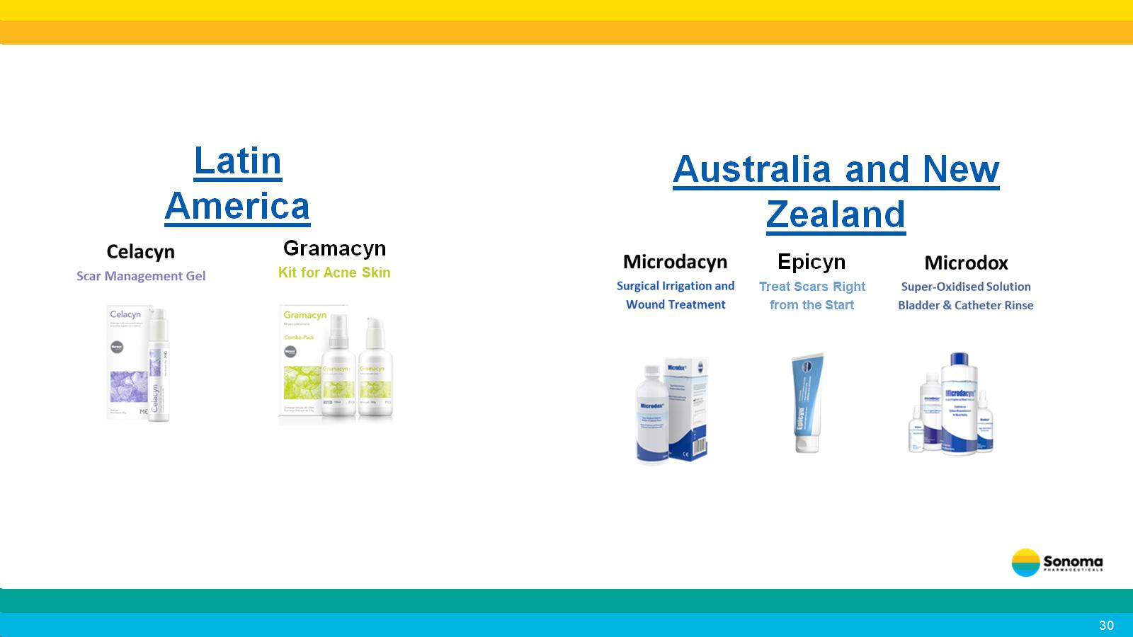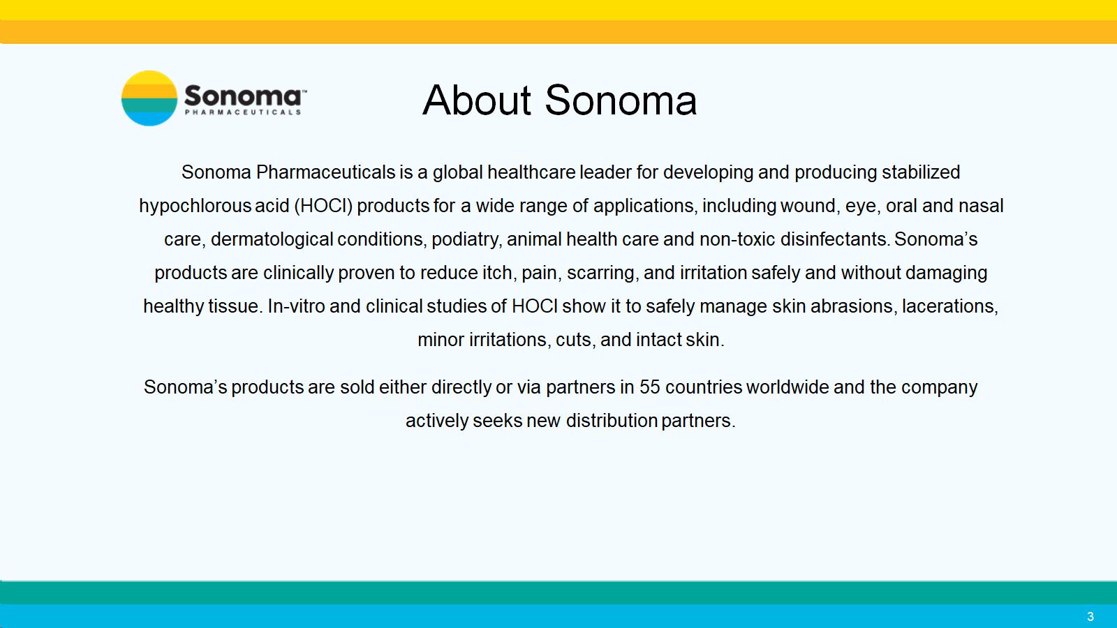 Sonoma Pharmaceuticals is a global healthcare leader for developing and producing stabilized hypochlorous acid ( HOCl ) products for a wide range of applications, including wound, eye, oral and nasal care, dermatological conditions, podiatry, animal health care and non - toxic disinfectants. Sonoma’s products are clinically proven to reduce itch, pain, scarring, and irritation safely and without damaging healthy tissue. In - vitro and clinical studies of HOCl show it to safely manage skin abrasions, lacerations, minor irritations, cuts, and intact skin. Sonoma’s products are sold either directly or via partners in 55 countries worldwide and the company actively seeks new distribution partners. About Sonoma 3