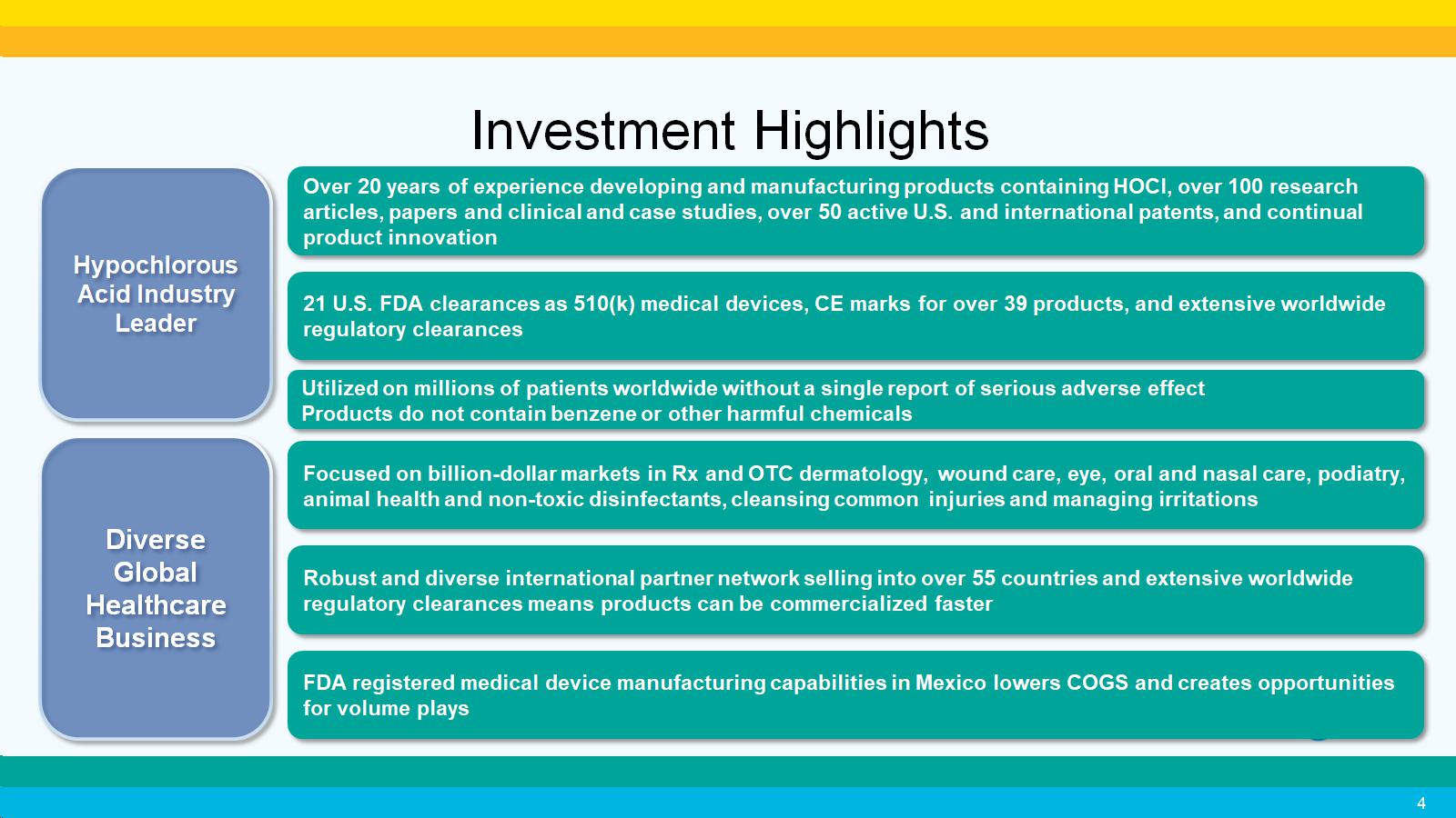 Over 20 years of experience developing and manufacturing products containing HOCl , over 100 research articles, papers and clinical and case studies, over 50 active U.S. and international patents, and continual product innovation Hypochlorous Acid Industry Leader 21 U.S. FDA clearances as 510(k) medical devices, CE marks for over 39 products, and extensive worldwide regulatory clearances Utilized on millions of patients worldwide without a single report of serious adverse effect Products do not contain benzene or other harmful chemicals Focused on billion - dollar markets in Rx and OTC dermatology, wound care, eye, oral and nasal care, podiatry, animal health and non - toxic disinfectants, cleansing common injuries and managing irritations Diverse Global Healthcare Business Investment Highlights Robust and diverse international partner network selling into over 55 countries and extensive worldwide regulatory clearances means products can be commercialized faster FDA registered medical device manufacturing capabilities in Mexico lowers COGS and creates opportunities for volume plays 4