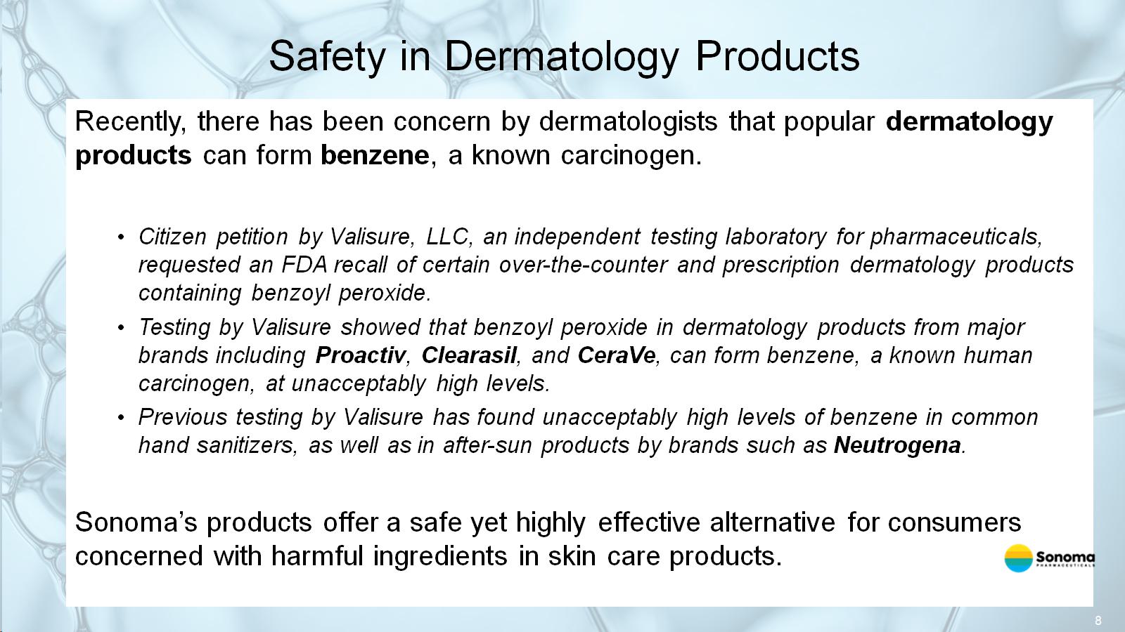 Safety in Dermatology Products Recently, there has been concern by dermatologists that popular dermatology products can form benzene , a known carcinogen. • Citizen petition by Valisure , LLC, an independent testing laboratory for pharmaceuticals, requested an FDA recall of certain over - the - counter and prescription dermatology products containing benzoyl peroxide. • Testing by Valisure showed that benzoyl peroxide in dermatology products from major brands including Proactiv , Clearasil , and CeraVe , can form benzene, a known human carcinogen, at unacceptably high levels. • Previous testing by Valisure has found unacceptably high levels of benzene in common hand sanitizers, as well as in after - sun products by brands such as Neutrogena . Sonoma’s products offer a safe yet highly effective alternative for consumers concerned with harmful ingredients in skin care products. 8