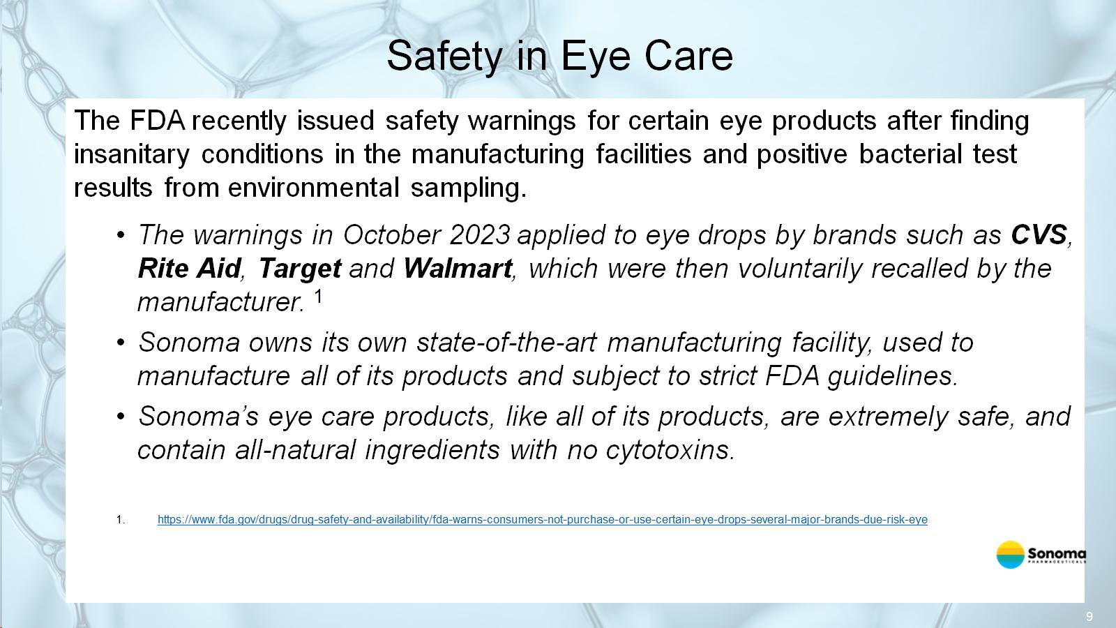 Safety in Eye Care The FDA recently issued safety warnings for certain eye products after finding insanitary conditions in the manufacturing facilities and positive bacterial test results from environmental sampling. • The warnings in October 2023 applied to eye drops by brands such as CVS , Rite Aid , Target and Walmart , which were then voluntarily recalled by the manufacturer. 1 • Sonoma owns its own state - of - the - art manufacturing facility, used to manufacture all of its products and subject to strict FDA guidelines. • Sonoma’s eye care products, like all of its products, are extremely safe, and contain all - natural ingredients with no cytotoxins. 1. https://www.fda.gov/drugs/drug - safety - and - availability/fda - warns - consumers - not - purchase - or - use - certain - eye - drops - several - major - b rands - due - risk - eye 9