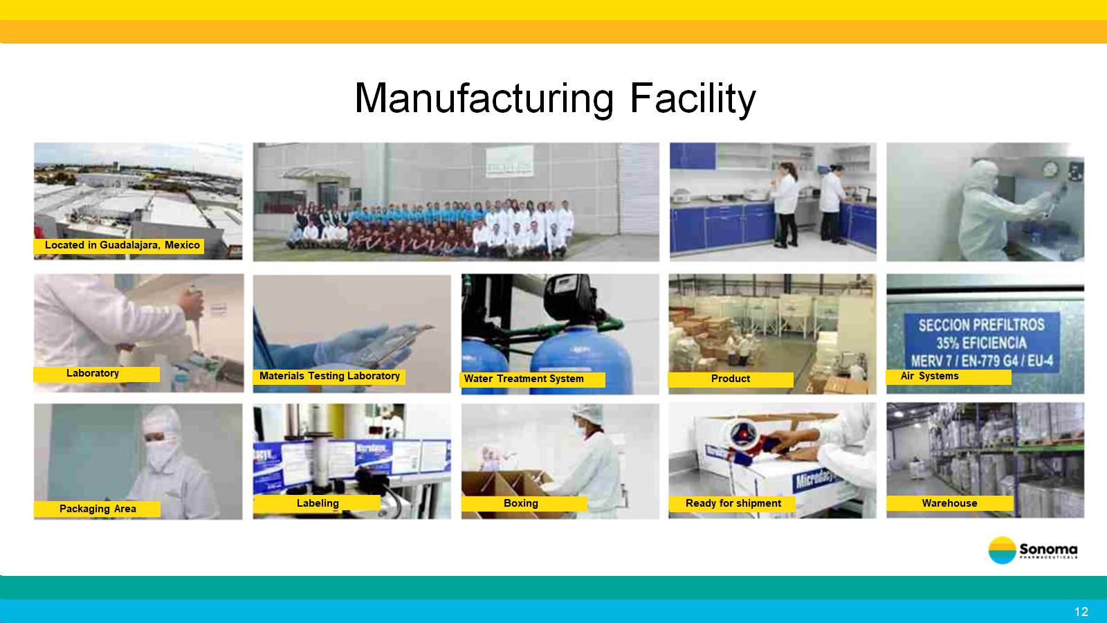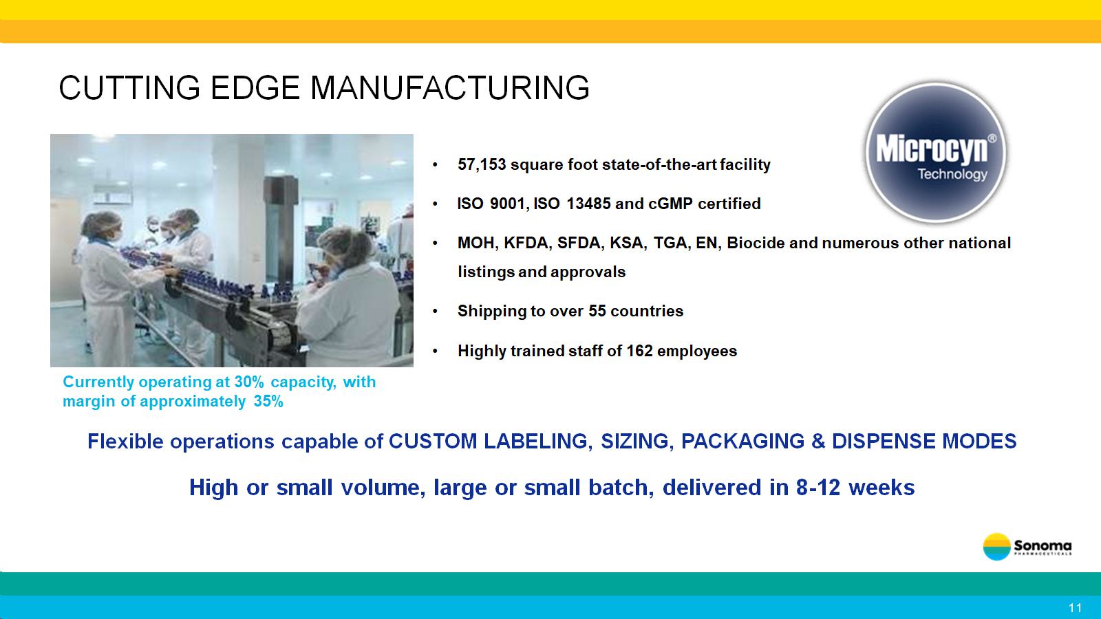 • 57,153 square foot state - of - the - art facility • ISO 9001, ISO 13485 and cGMP certified • MOH, KFDA, SFDA, KSA, TGA, EN, Biocide and numerous other national listings and approvals • Shipping to over 55 countries • Highly trained staff of 162 employees CUTTING EDGE MANUFACTURING Flexible operations capable of CUSTOM LABELING, SIZING, PACKAGING & DISPENSE MODES High or small volume, large or small batch, delivered in 8 - 12 weeks Currently operating at 30% capacity, with margin of approximately 35% 11
