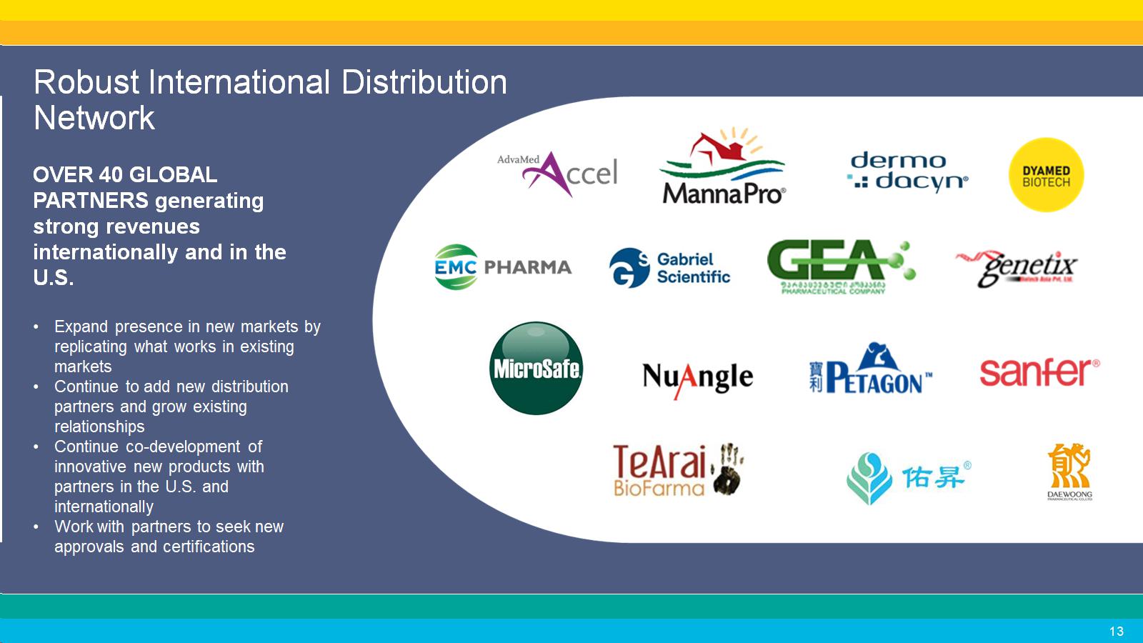 Robust International Distribution Network OVER 40 GLOBAL PARTNERS generating strong revenues internationally and in the U.S. • Expand presence in new markets by replicating what works in existing markets • Continue to add new distribution partners and grow existing relationships • Continue co - development of innovative new products with partners in the U.S. and internationally • Work with partners to seek new approvals and certifications 13