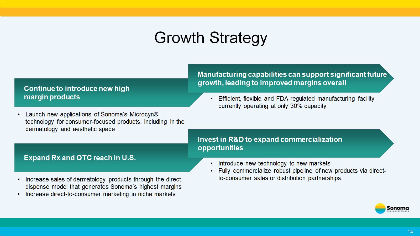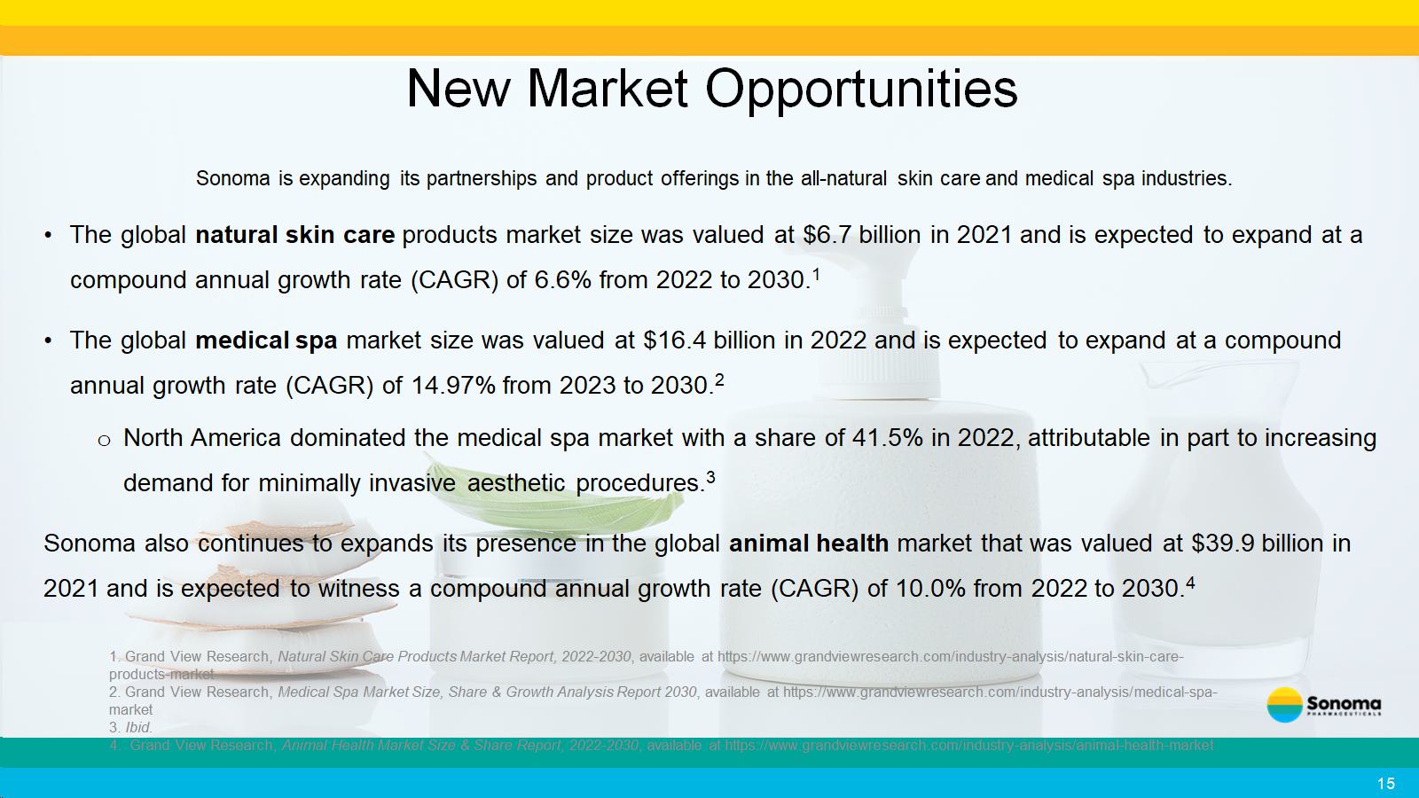 Sonoma is expanding its partnerships and product offerings in the all - natural skin care and medical spa industries. • The global natural skin care products market size was valued at $6.7 billion in 2021 and is expected to expand at a compound annual growth rate (CAGR) of 6.6% from 2022 to 2030. 1 • The global medical spa market size was valued at $16.4 billion in 2022 and is expected to expand at a compound annual growth rate (CAGR) of 14.97% from 2023 to 2030. 2 o North America dominated the medical spa market with a share of 41.5% in 2022, attributable in part to increasing demand for minimally invasive aesthetic procedures. 3 Sonoma also continues to expands its presence in the global animal health market that was valued at $39.9 billion in 2021 and is expected to witness a compound annual growth rate (CAGR) of 10.0% from 2022 to 2030. 4 New Market Opportunities 1. Grand View Research, Natural Skin Care Products Market Report, 2022 - 2030 , available at https://www.grandviewresearch.com/industry - analysis/natural - skin - care - products - market 2. Grand View Research, Medical Spa Market Size, Share & Growth Analysis Report 2030 , available at https://www.grandviewresearch.com/industry - analysis/medical - spa - market 3. Ibid. 4. Grand View Research, Animal Health Market Size & Share Report, 2022 - 2030 , available at https://www.grandviewresearch.com/industry - analysis/animal - health - market 15