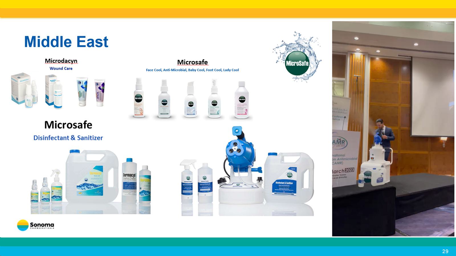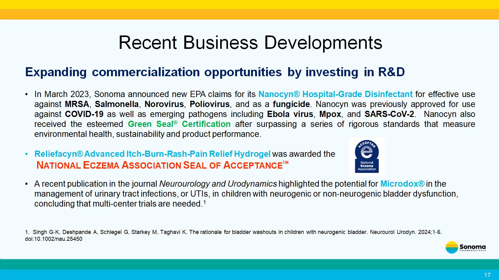Expanding commercialization opportunities by investing in R&D • In March 2023 , Sonoma announced new EPA claims for its Nanocyn ® Hospital - Grade Disinfectant f or effective use against MRSA , Salmonella , Norovirus , Poliovirus , and as a fungicide . Nanocyn was previously approved for use against COVID - 19 as well as emerging pathogens including Ebola virus , Mpox , and SARS - CoV - 2 . Nanocyn also received the esteemed Green Seal ® Certification after surpassing a series of rigorous standards that measure environmental health, sustainability and product performance . • Reliefacyn ® Advanced Itch - Burn - Rash - Pain Relief Hydrogel was awarded the N ATIONAL E CZEMA A SSOCIATION S EAL OF A CCEPTANCE TM • A recent publication in the journal Neurourology and Urodynamics highlighted the potential for Microdox ® in the management of urinary tract infections, or UTIs, in children with neurogenic or non - neurogenic bladder dysfunction, concluding that multi - center trials are needed. 1 1. Singh G - K, Deshpande A, Schlegel G, Starkey M, Taghavi K. The rationale for bladder washouts in children with neurogenic bladder. Neurourol Urodyn . 2024;1 - 6. doi:10.1002/nau.25450 Recent Business Developments 17