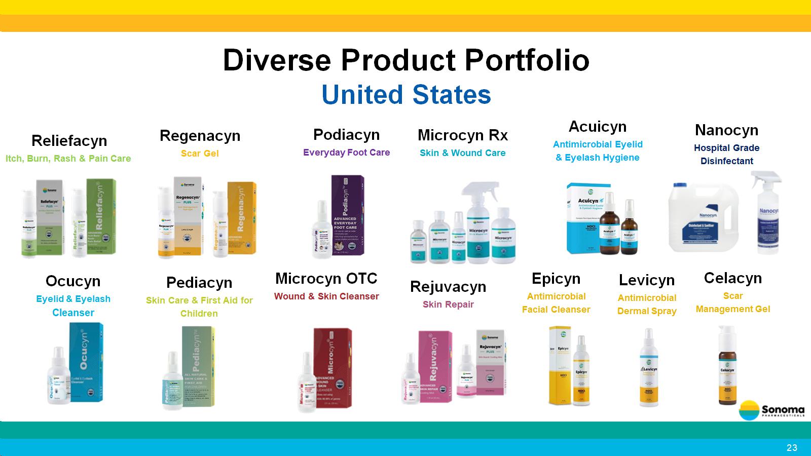 Diverse Product Portfolio United States Podiacyn Everyday Foot Care Microcyn Rx Skin & Wound Care Regenacyn Scar Gel Epicyn Antimicrobial Facial Cleanser Nanocyn Hospital Grade Disinfectant Levicyn Antimicrobial Dermal Spray Celacyn Scar Management Gel Rejuvacyn Skin Repair Reliefacyn Itch, Burn, Rash & Pain Care Microcyn OTC Wound & Skin Cleanser Ocucyn Eyelid & Eyelash Cleanser Pediacyn Skin Care & First Aid for Children Acuicyn Antimicrobial Eyelid & Eyelash Hygiene 23