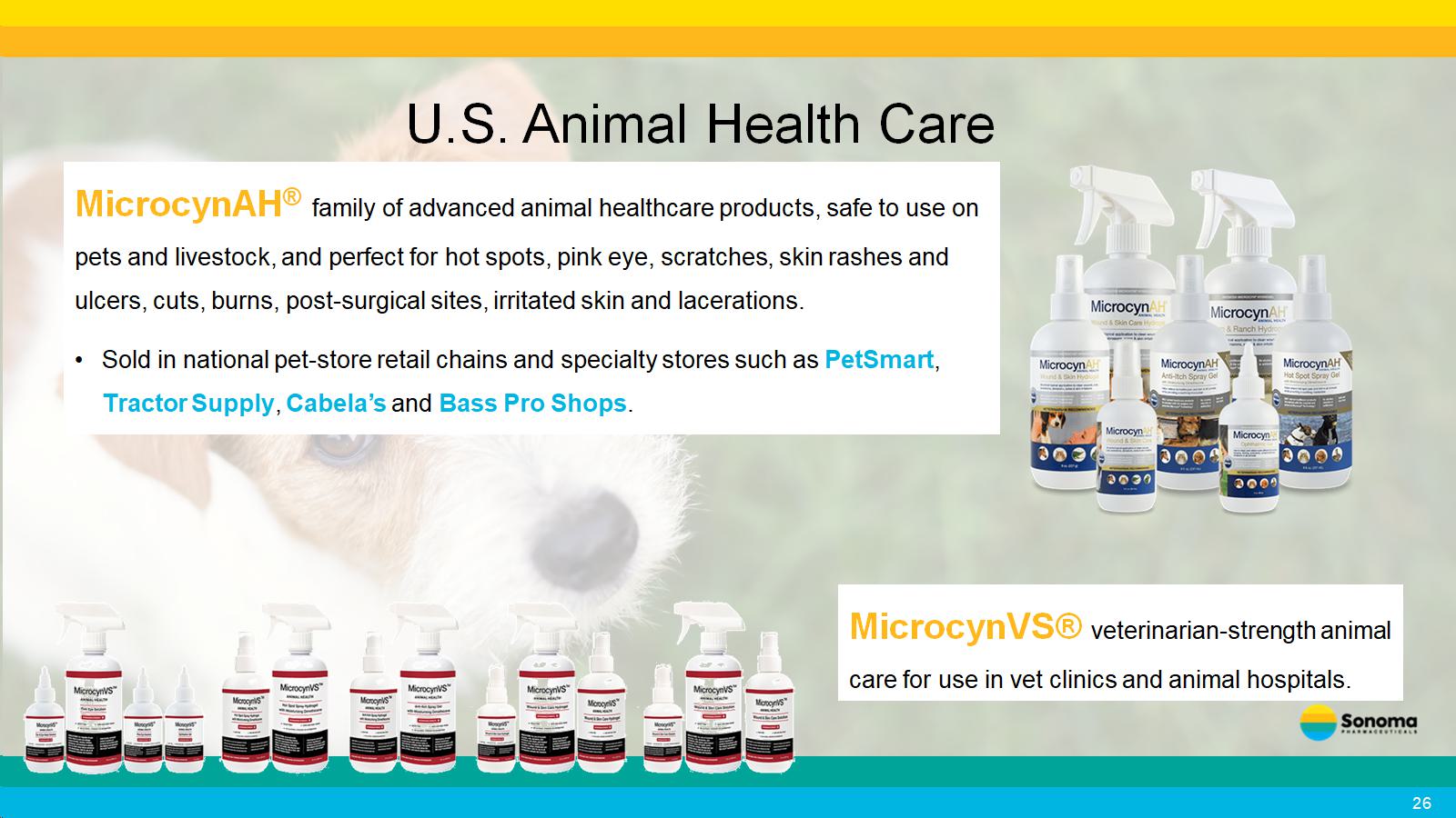 U.S. Animal Health Care MicrocynAH ® family of advanced animal healthcare products, safe to use on pets and livestock, and perfect for hot spots, pink eye, scratches, skin rashes and ulcers, cuts, burns, post - surgical sites, irritated skin and lacerations. • Sold in national pet - store retail chains and specialty stores such as PetSmart , Tractor Supply , Cabela’s and Bass Pro Shops . MicrocynVS® veterinarian - strength animal care for use in vet clinics and animal hospitals. 26
