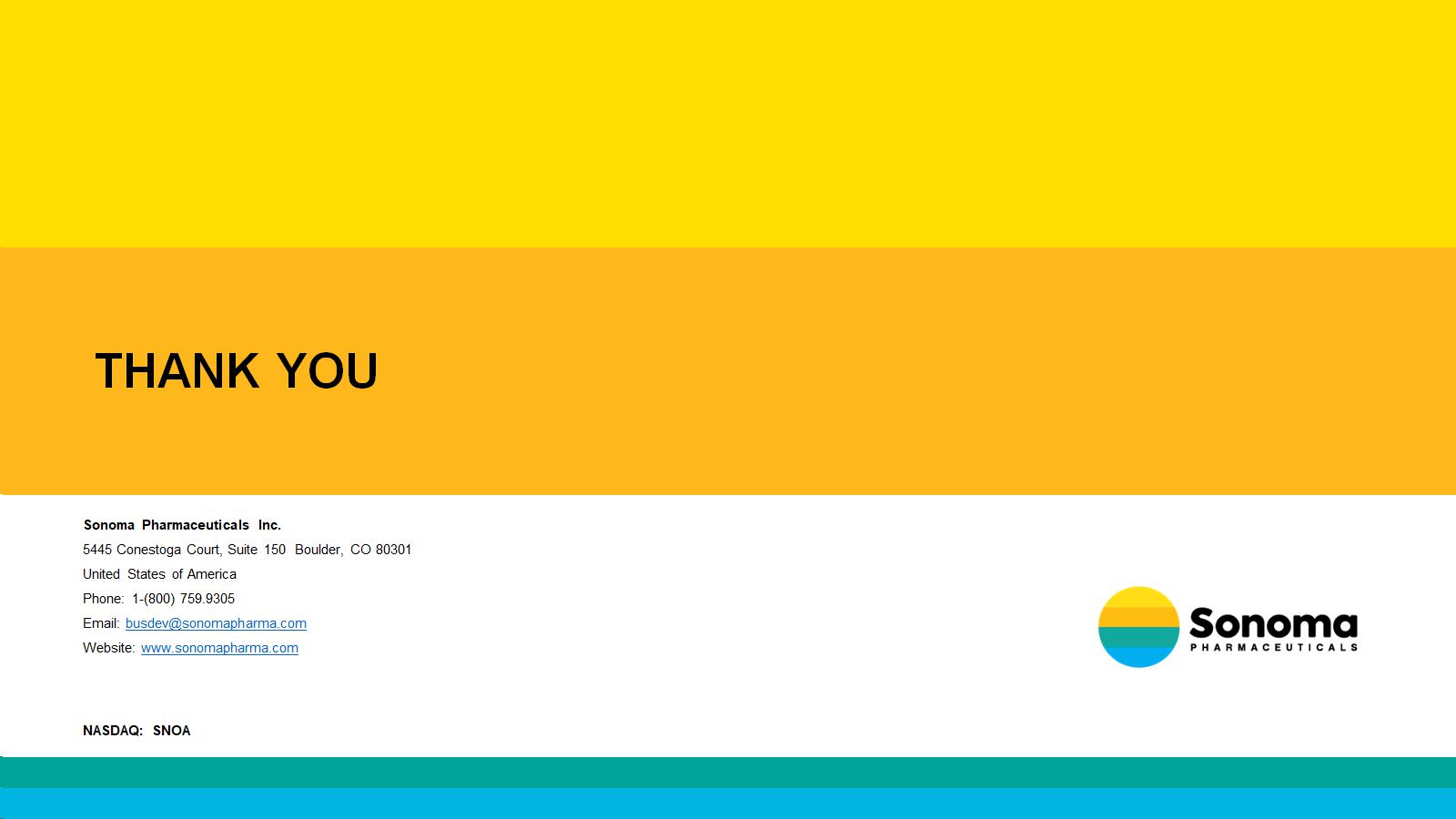 THANK YOU Sonoma Pharmaceuticals Inc. 5445 Conestoga Court , Suite 150 Boulder , CO 80301 United States of America Phone: 1 - (800) 759.9305 Email: busdev@sonomapharma.com Website: www.sonomapharma.com NASDAQ: SNOA