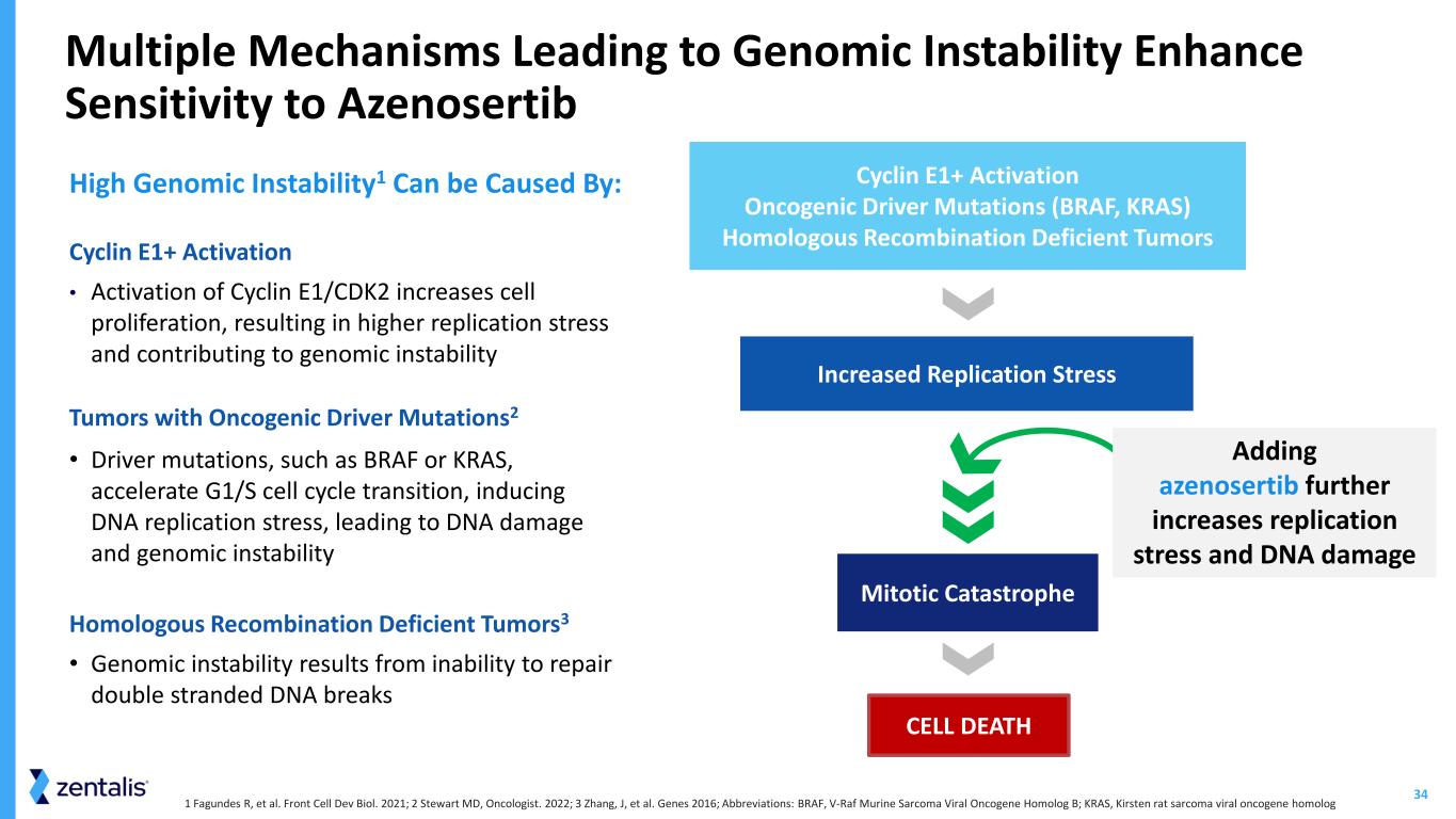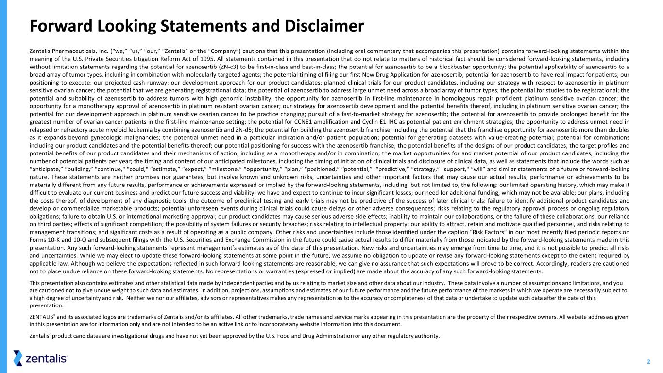 2 Forward Looking Statements and Disclaimer Zentalis Pharmaceuticals, Inc. (“we,” “us,” “our,” “Zentalis” or the “Company”) cautions that this presentation (including oral commentary that accompanies this presentation) contains forward-looking statements within the meaning of the U.S. Private Securities Litigation Reform Act of 1995. All statements contained in this presentation that do not relate to matters of historical fact should be considered forward-looking statements, including without limitation statements regarding the potential for azenosertib (ZN-c3) to be first-in-class and best-in-class; the potential for azenosertib to be a blockbuster opportunity; the potential applicability of azenosertib to a broad array of tumor types, including in combination with molecularly targeted agents; the potential timing of filing our first New Drug Application for azenosertib; potential for azenosertib to have real impact for patients; our positioning to execute; our projected cash runway; our development approach for our product candidates; planned clinical trials for our product candidates, including our strategy with respect to azenosertib in platinum sensitive ovarian cancer; the potential that we are generating registrational data; the potential of azenosertib to address large unmet need across a broad array of tumor types; the potential for studies to be registrational; the potential and suitability of azenosertib to address tumors with high genomic instability; the opportunity for azenosertib in first-line maintenance in homologous repair proficient platinum sensitive ovarian cancer; the opportunity for a monotherapy approval of azenosertib in platinum resistant ovarian cancer; our strategy for azenosertib development and the potential benefits thereof, including in platinum sensitive ovarian cancer; the potential for our development approach in platinum sensitive ovarian cancer to be practice changing; pursuit of a fast-to-market strategy for azenosertib; the potential for azenosertib to provide prolonged benefit for the greatest number of ovarian cancer patients in the first-line maintenance setting; the potential for CCNE1 amplification and Cyclin E1 IHC as potential patient enrichment strategies; the opportunity to address unmet need in relapsed or refractory acute myeloid leukemia by combining azenosertib and ZN-d5; the potential for building the azenosertib franchise, including the potential that the franchise opportunity for azenosertib more than doubles as it expands beyond gynecologic malignancies; the potential unmet need in a particular indication and/or patient population; potential for generating datasets with value-creating potential; potential for combinations including our product candidates and the potential benefits thereof; our potential positioning for success with the azenosertib franchise; the potential benefits of the designs of our product candidates; the target profiles and potential benefits of our product candidates and their mechanisms of action, including as a monotherapy and/or in combination; the market opportunities for and market potential of our product candidates, including the number of potential patients per year; the timing and content of our anticipated milestones, including the timing of initiation of clinical trials and disclosure of clinical data, as well as statements that include the words such as “anticipate,” “building,” "continue," "could," “estimate,” “expect,” “milestone,” “opportunity,” “plan,” “positioned,” “potential,” “predictive,” “strategy,” "support," “will” and similar statements of a future or forward-looking nature. These statements are neither promises nor guarantees, but involve known and unknown risks, uncertainties and other important factors that may cause our actual results, performance or achievements to be materially different from any future results, performance or achievements expressed or implied by the forward-looking statements, including, but not limited to, the following: our limited operating history, which may make it difficult to evaluate our current business and predict our future success and viability; we have and expect to continue to incur significant losses; our need for additional funding, which may not be available; our plans, including the costs thereof, of development of any diagnostic tools; the outcome of preclinical testing and early trials may not be predictive of the success of later clinical trials; failure to identify additional product candidates and develop or commercialize marketable products; potential unforeseen events during clinical trials could cause delays or other adverse consequences; risks relating to the regulatory approval process or ongoing regulatory obligations; failure to obtain U.S. or international marketing approval; our product candidates may cause serious adverse side effects; inability to maintain our collaborations, or the failure of these collaborations; our reliance on third parties; effects of significant competition; the possibility of system failures or security breaches; risks relating to intellectual property; our ability to attract, retain and motivate qualified personnel, and risks relating to management transitions; and significant costs as a result of operating as a public company. Other risks and uncertainties include those identified under the caption “Risk Factors” in our most recently filed periodic reports on Forms 10-K and 10-Q and subsequent filings with the U.S. Securities and Exchange Commission in the future could cause actual results to differ materially from those indicated by the forward-looking statements made in this presentation. Any such forward-looking statements represent management’s estimates as of the date of this presentation. New risks and uncertainties may emerge from time to time, and it is not possible to predict all risks and uncertainties. While we may elect
